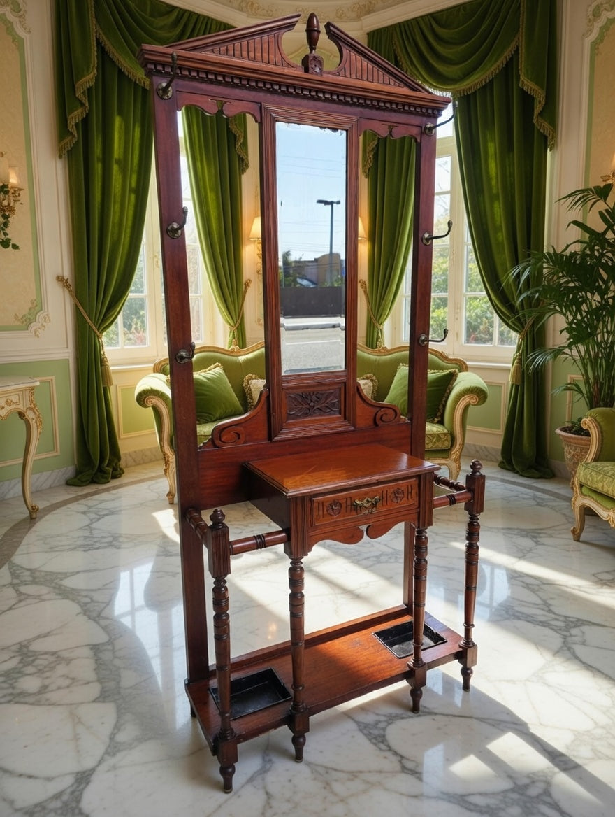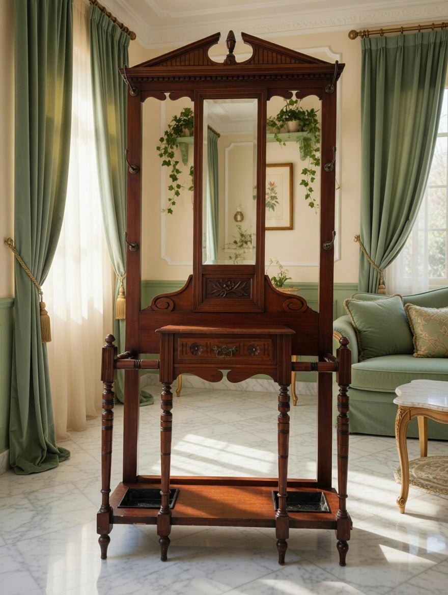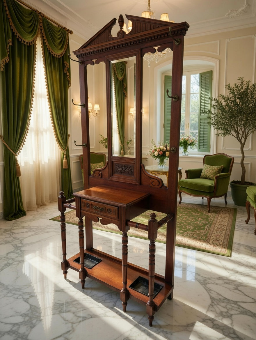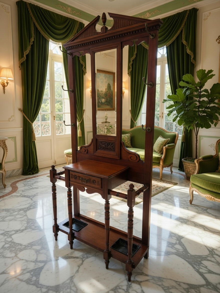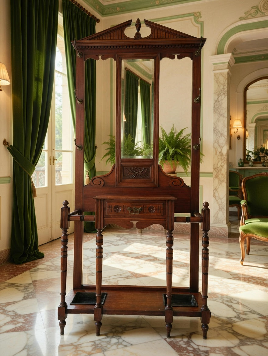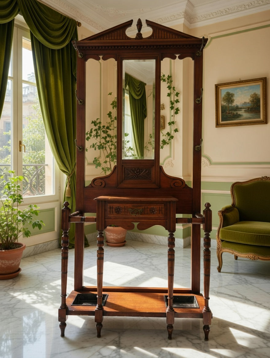 🌿 Una pieza imponente que recibe con distinción. Este perchero, tallado en madera noble y acompañado de espejo central, se convierte en el guardián de la entrada, ofreciendo funcionalidad y belleza en perfecta armonía. Sus detalles artesanales evocan la grandeza de los salones antiguos y la calidez de la tradición.