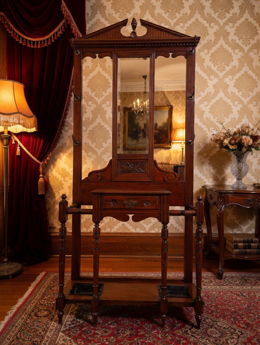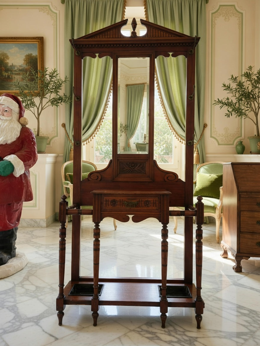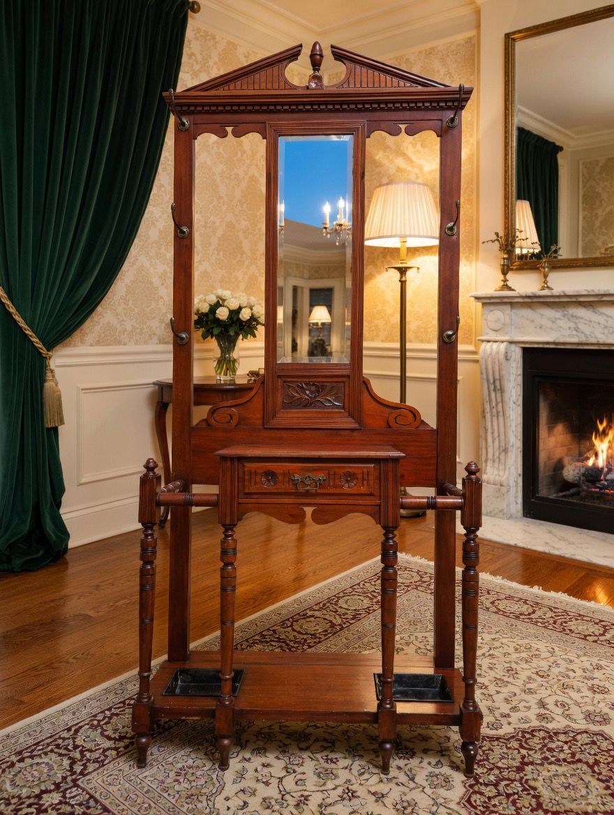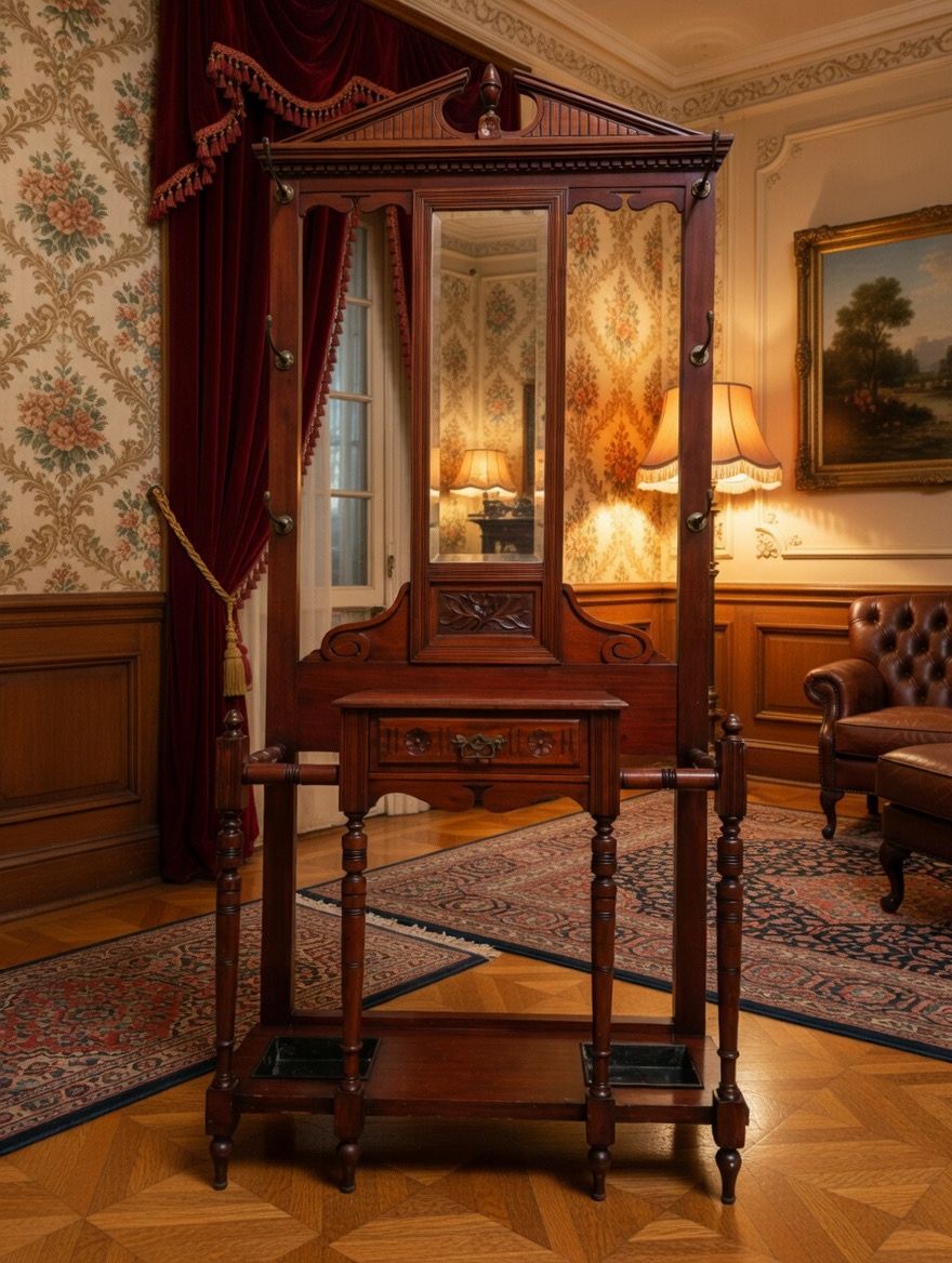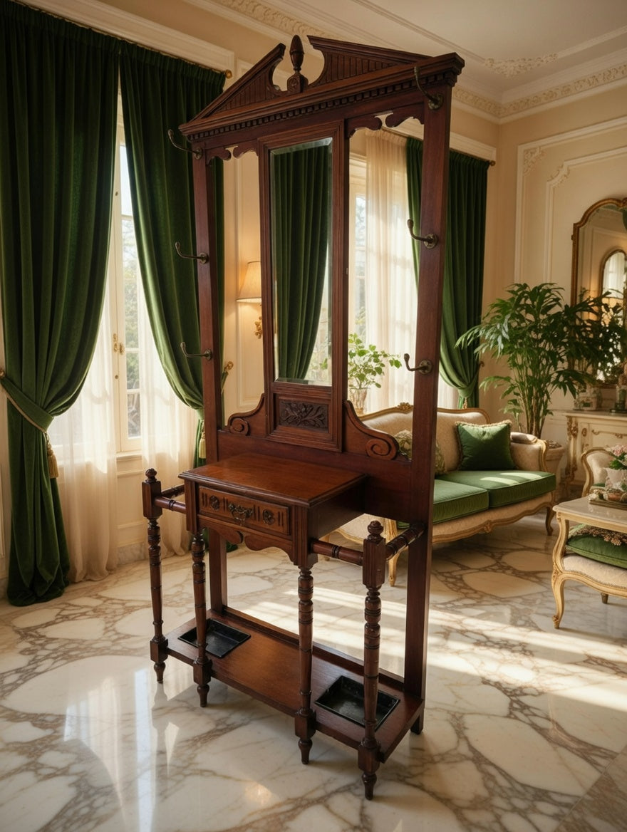 🌿 Una pieza imponente que recibe con distinción. Este perchero, tallado en madera noble y acompañado de espejo central, se convierte en el guardián de la entrada, ofreciendo funcionalidad y belleza en perfecta armonía. Sus detalles artesanales evocan la grandeza de los salones antiguos y la calidez de la tradición.