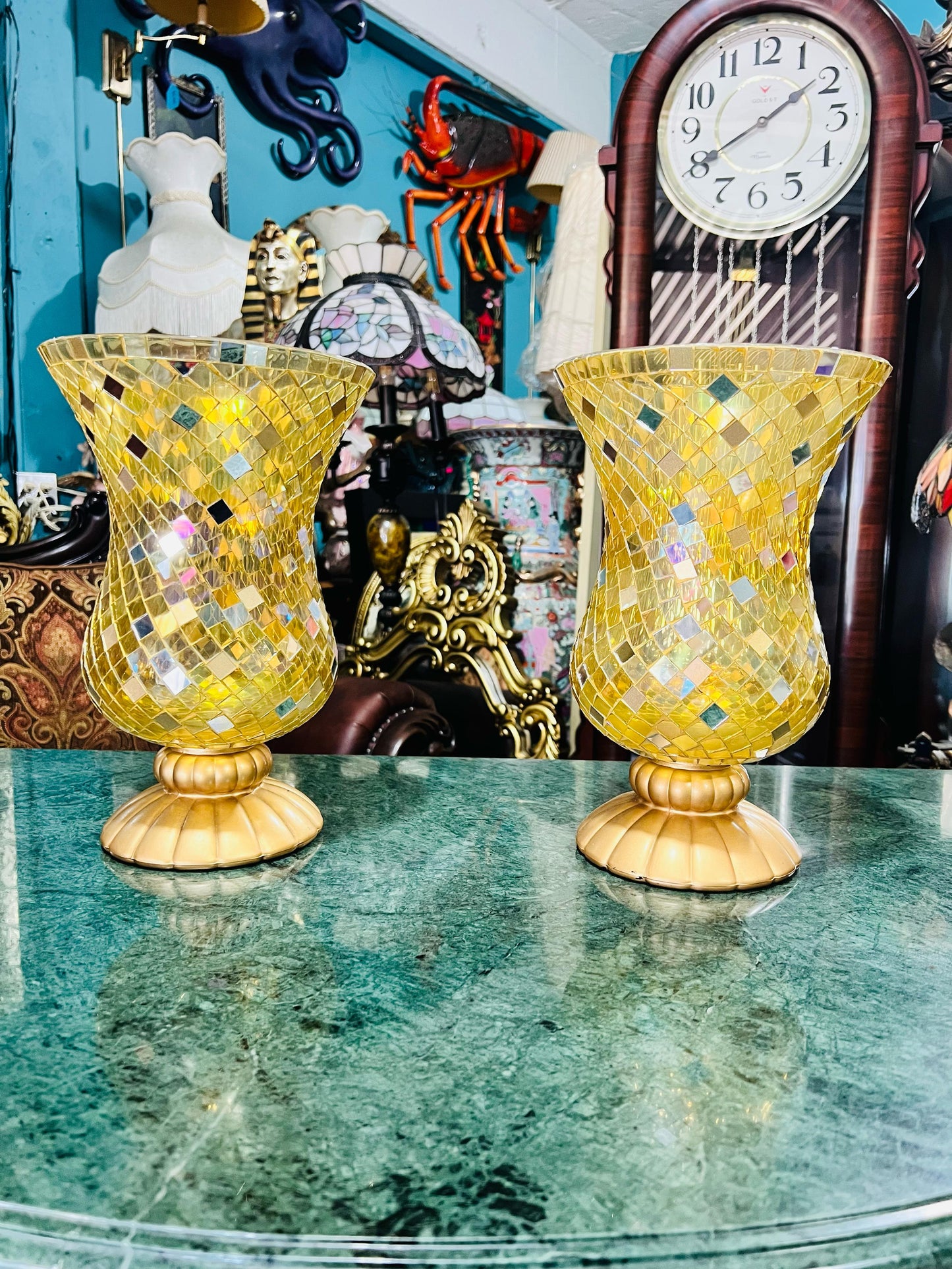 Embellece tus espacios con este magnífico par de jarrones de cristal, disponibles exclusivamente en Rosarito Antiques.
