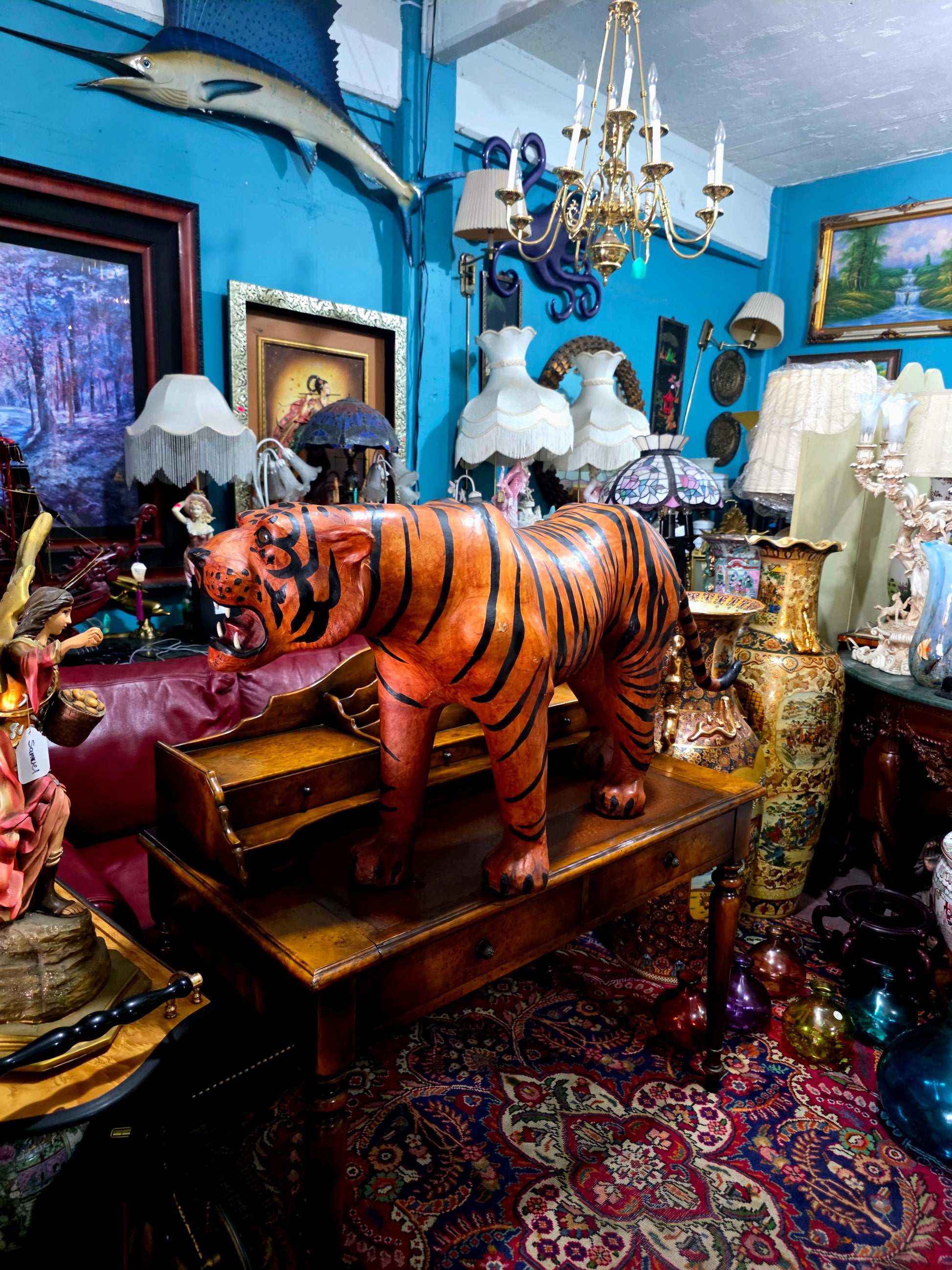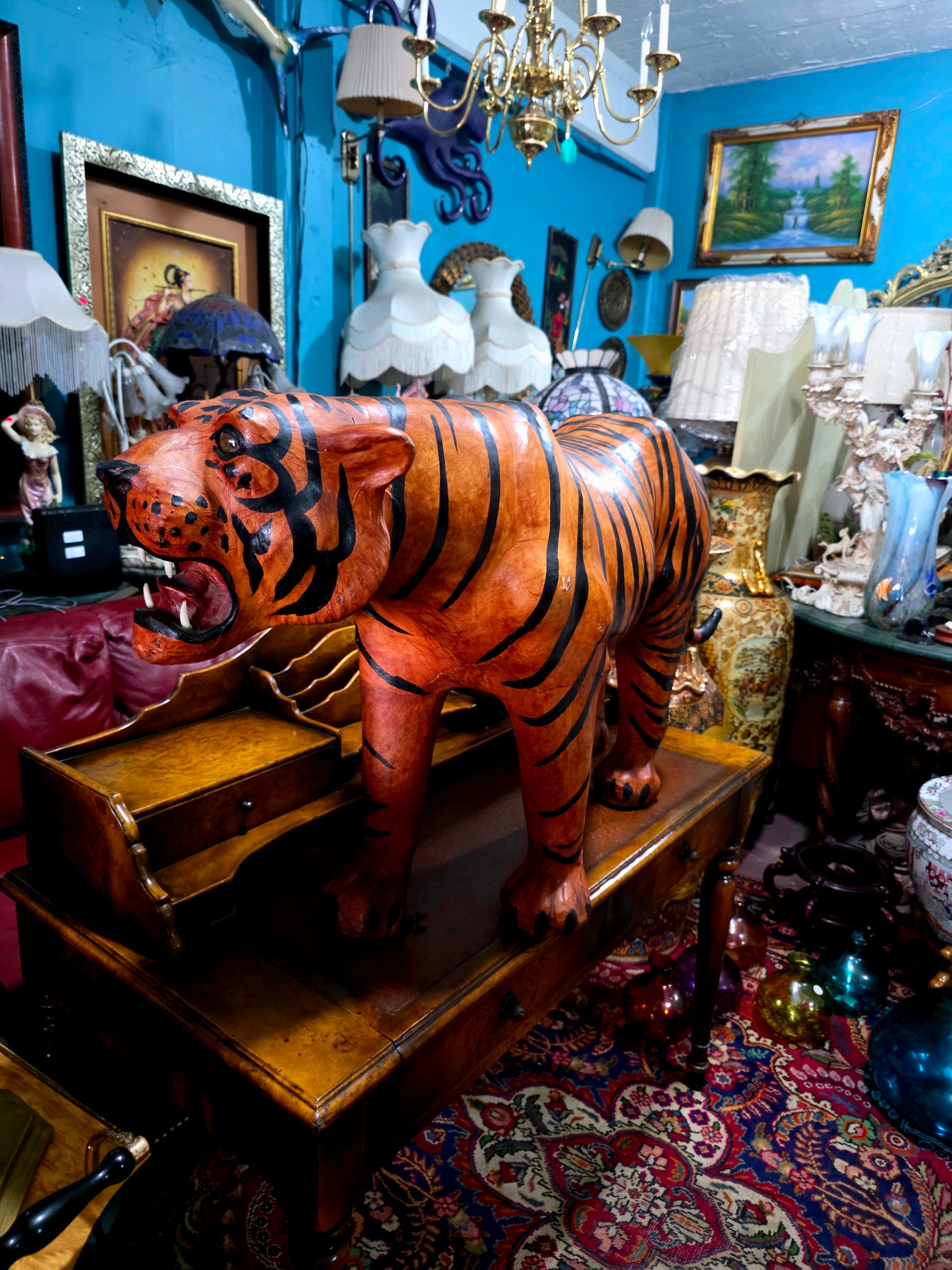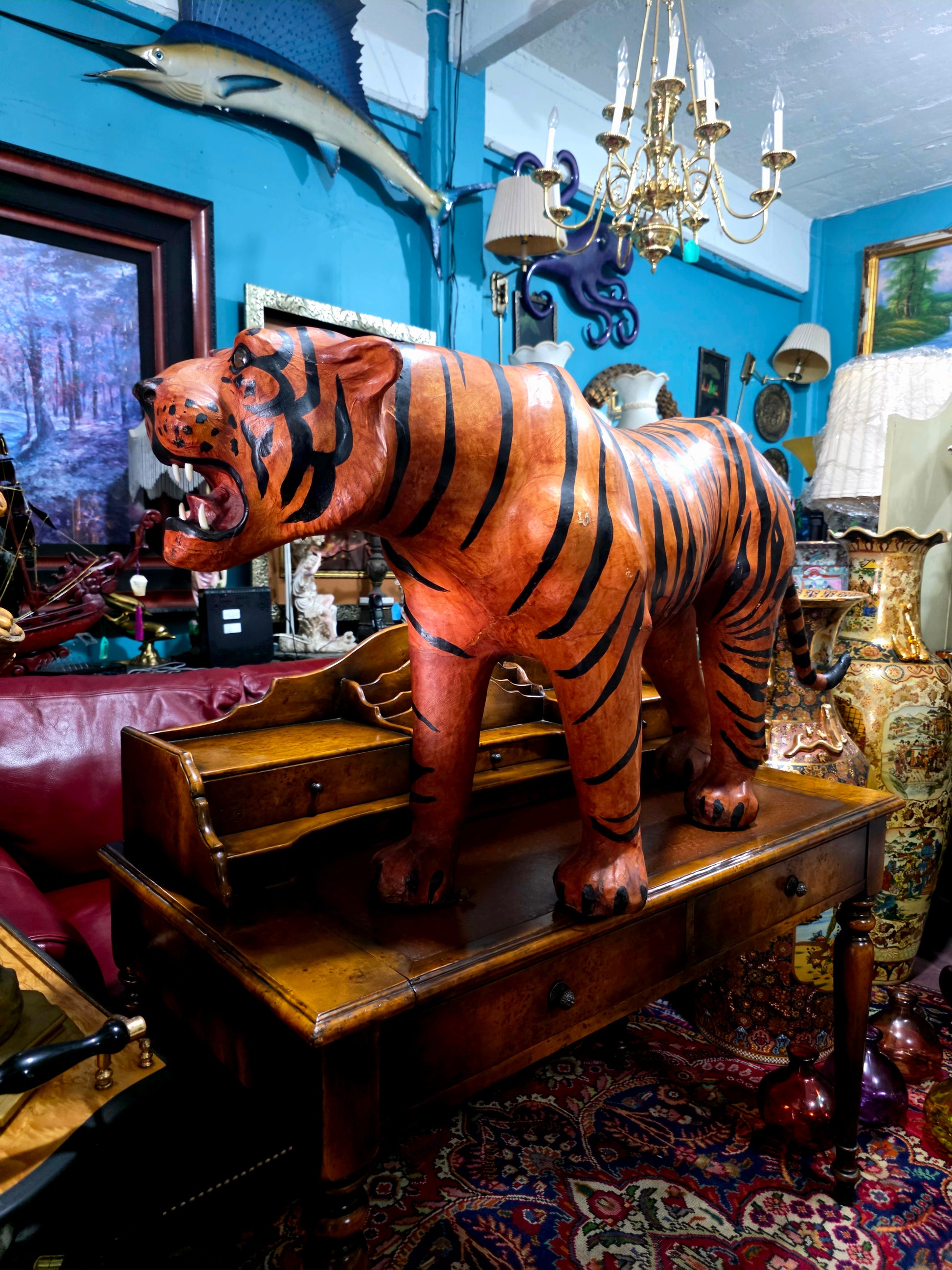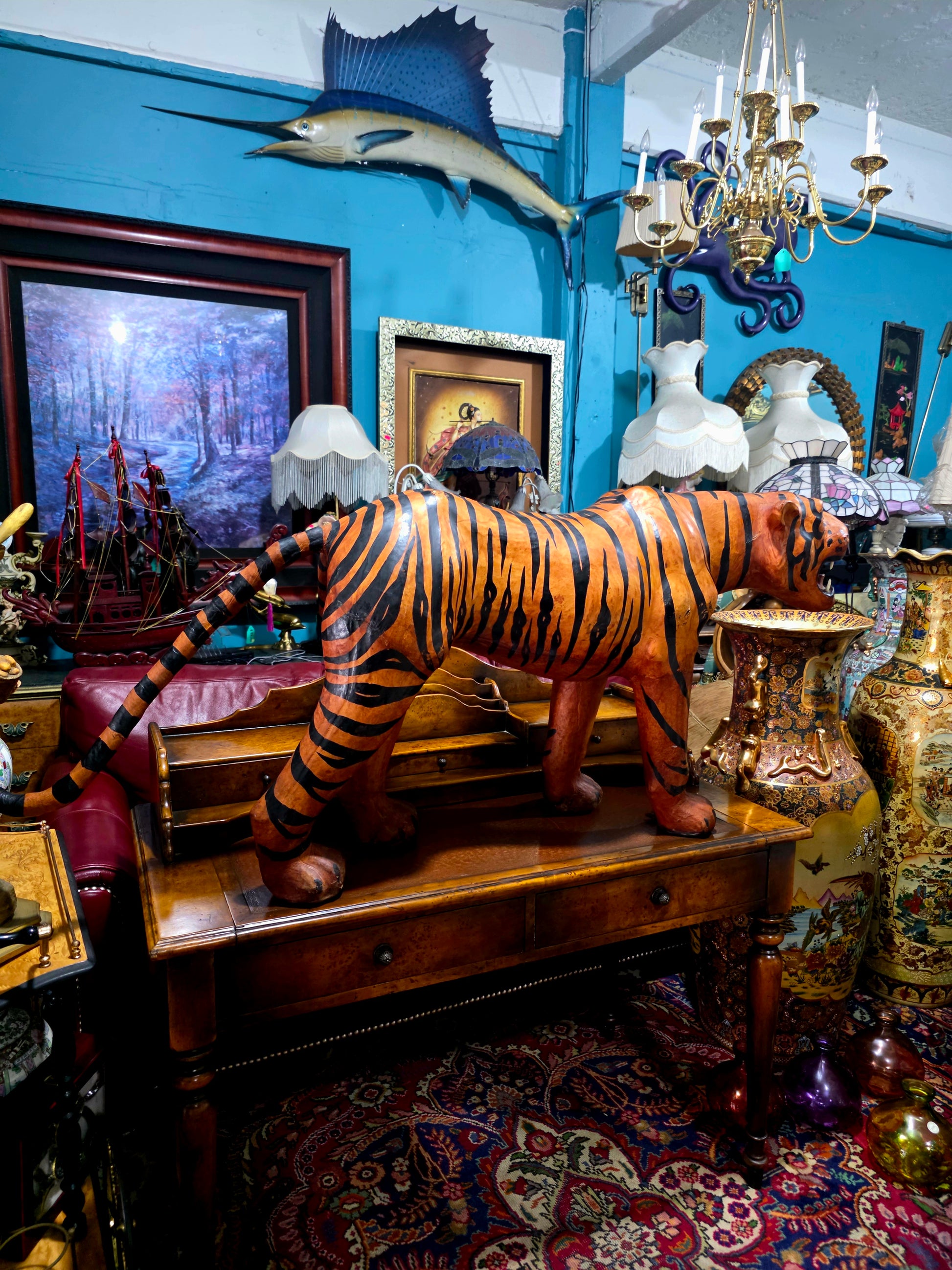 La figura muestra al tigre en posición de alerta, con la mandíbula entreabierta y los ojos fijos en un punto invisible, como si estuviera a punto de avanzar. Las franjas negras han sido pintadas a mano sobre el vibrante tono naranja de la piel, logrando una textura visual que honra la estética clásica de las esculturas animales envueltas en cuero, tan apreciadas por coleccionistas y museos.