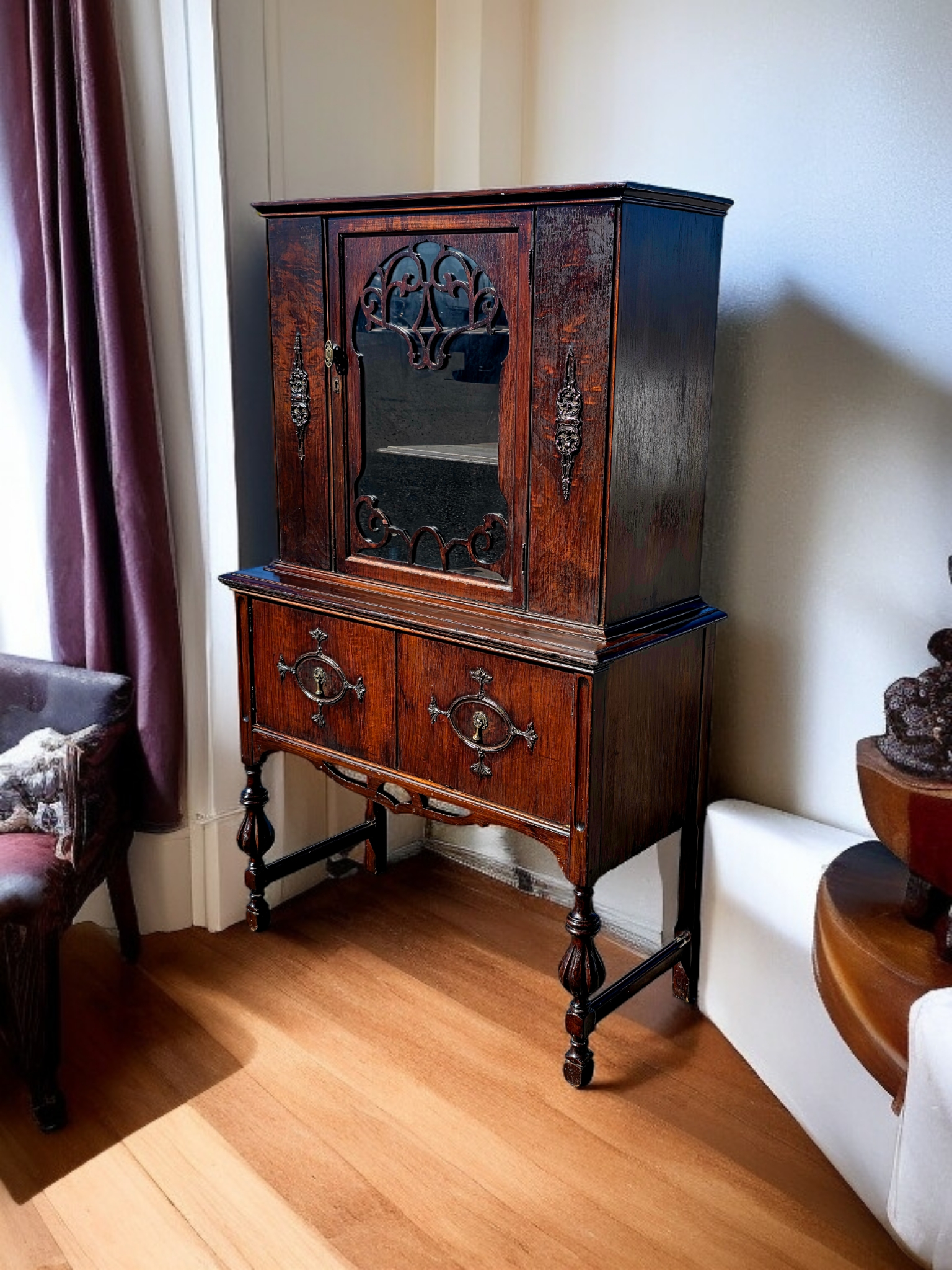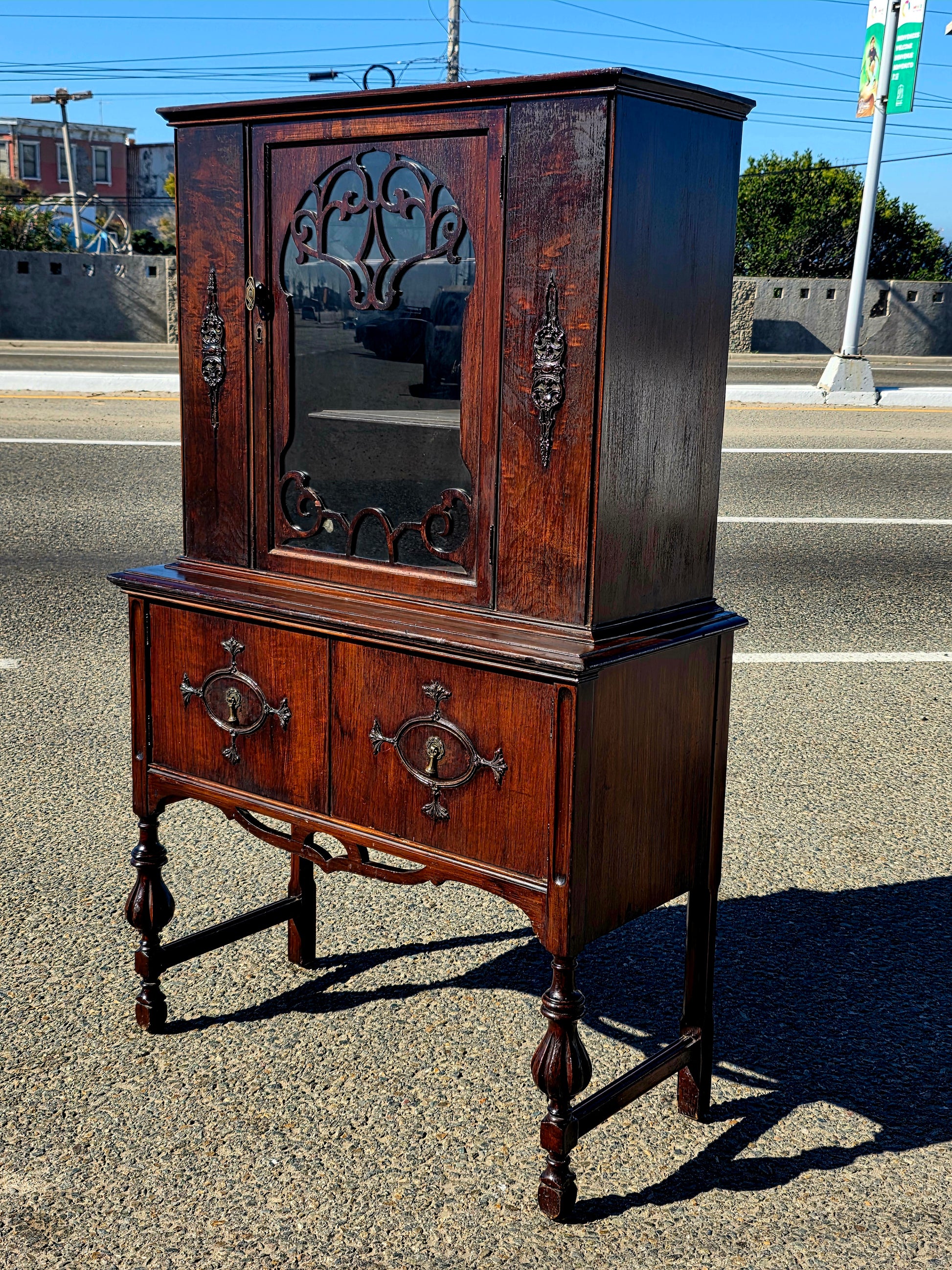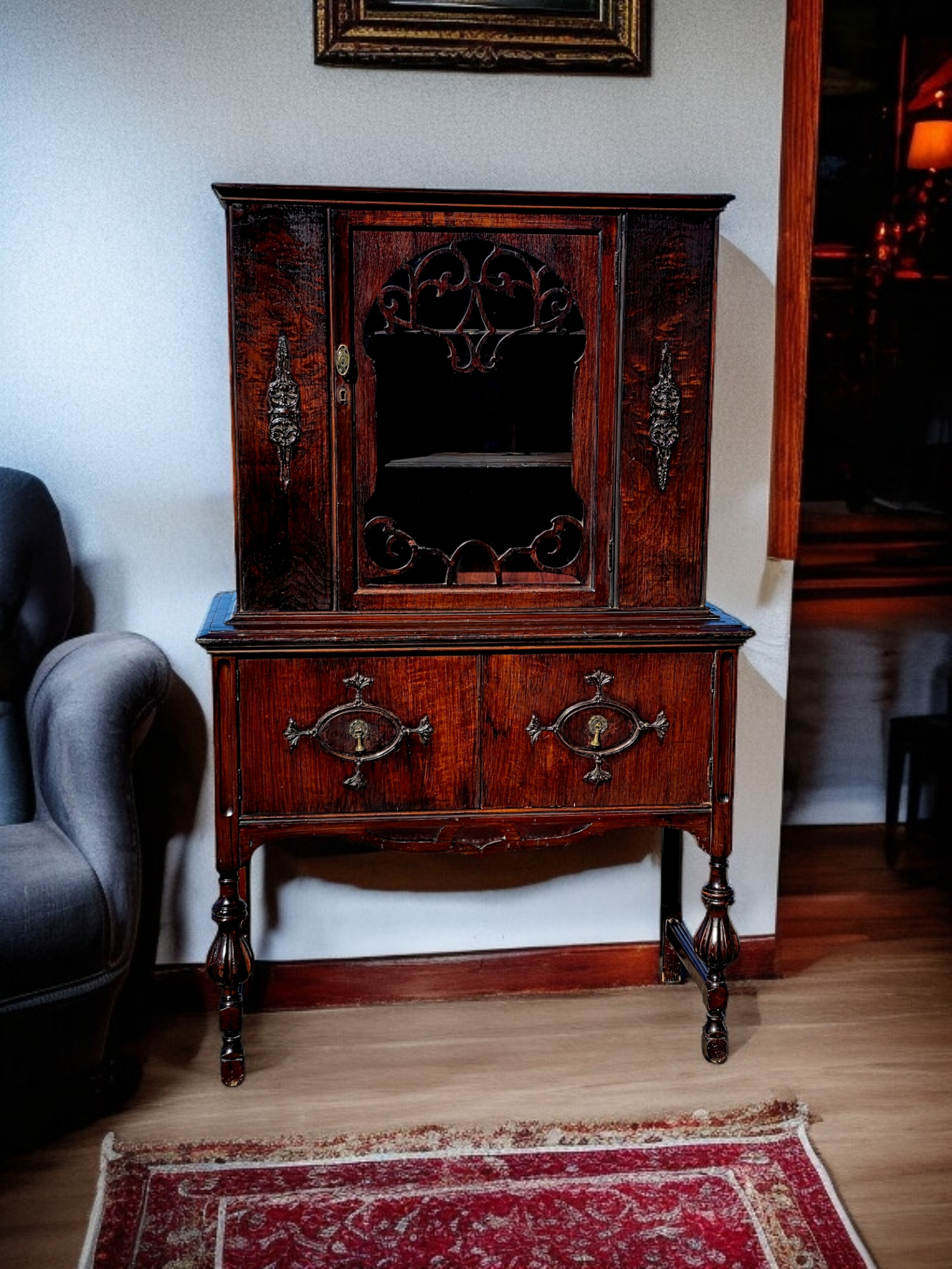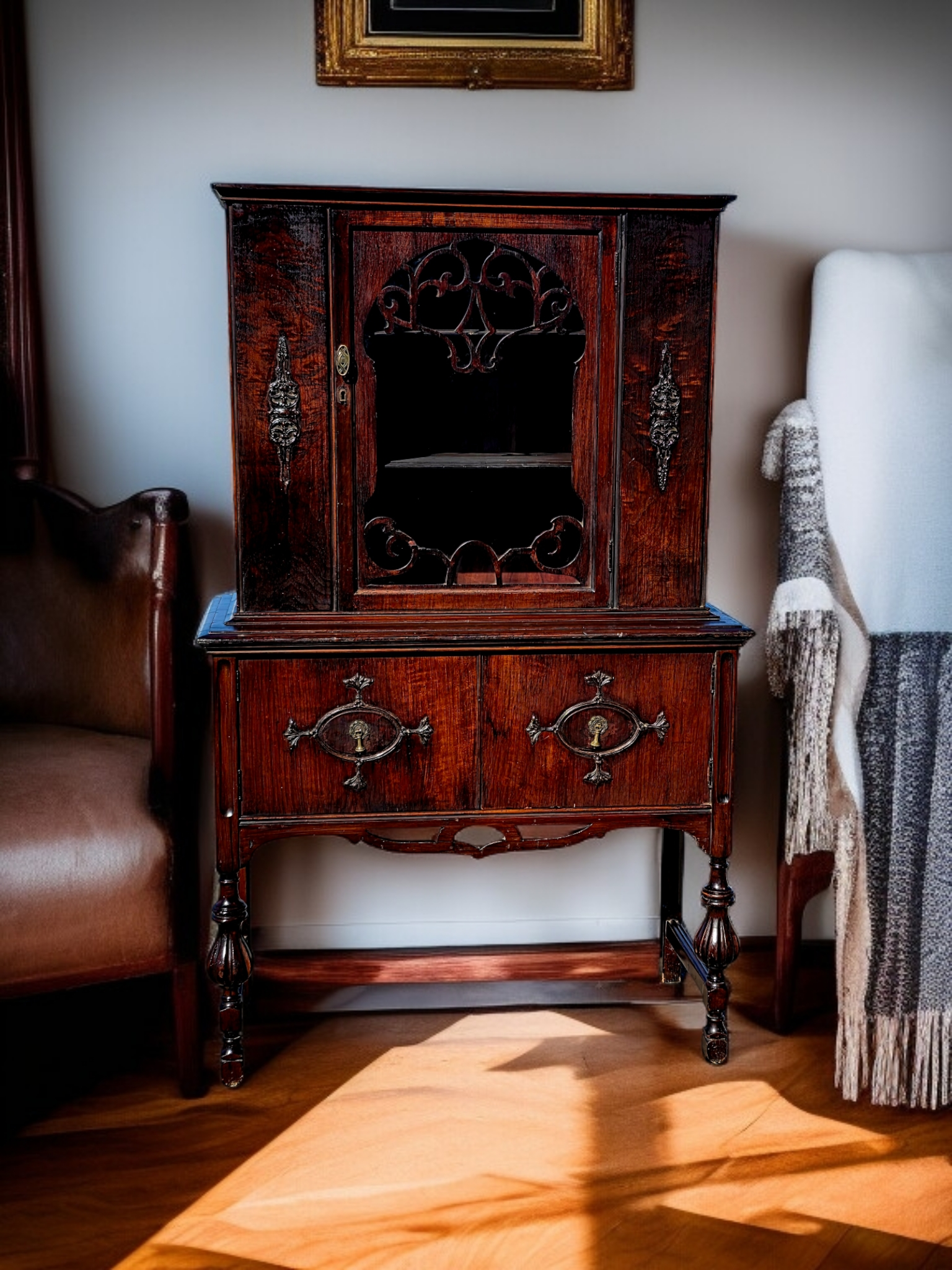 Ideal para resguardar reliquias familiares, porcelanas centenarias o curiosidades de época, esta majestuosa vitrina es una joya del mobiliario tradicional. Su estructura, elaborada en madera maciza con acabado oscuro, se alza sobre patas torneadas unidas por travesaños, evocando la nobleza de los salones europeos del siglo XIX.