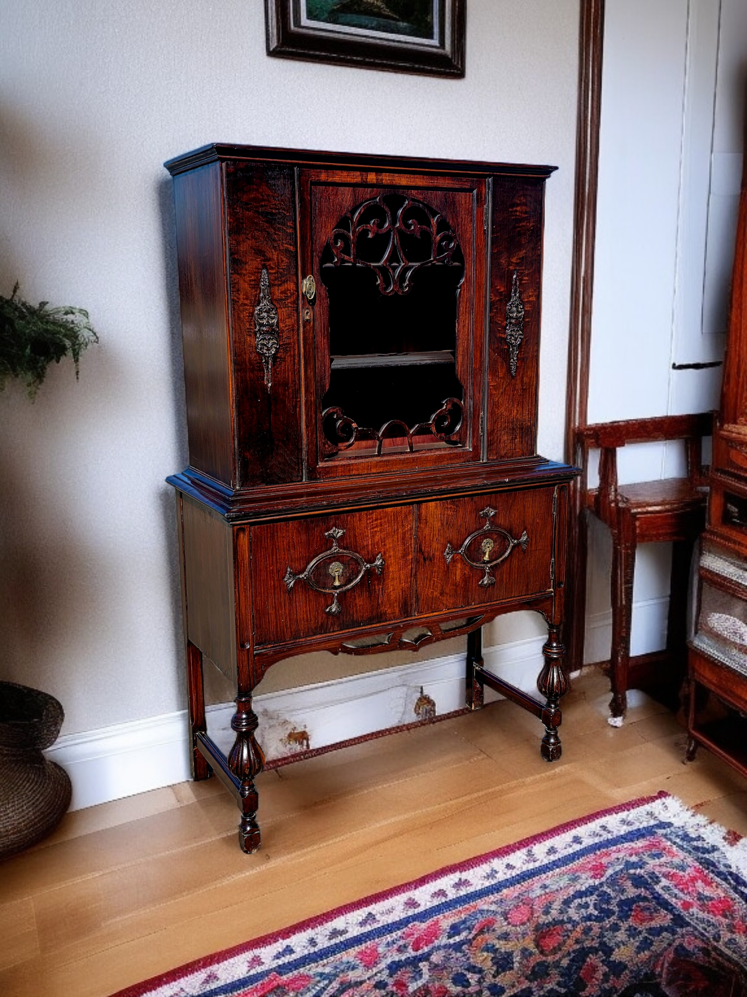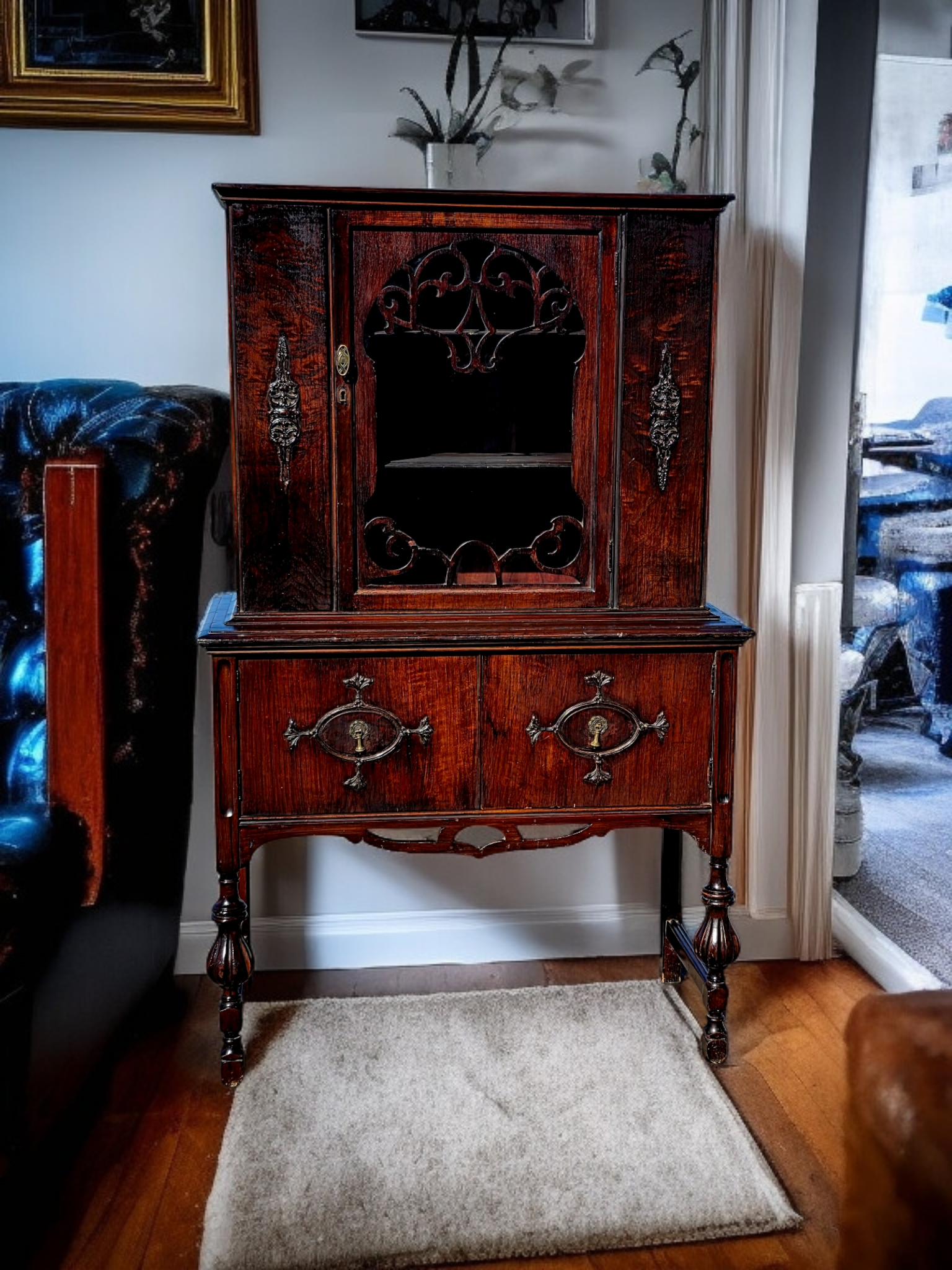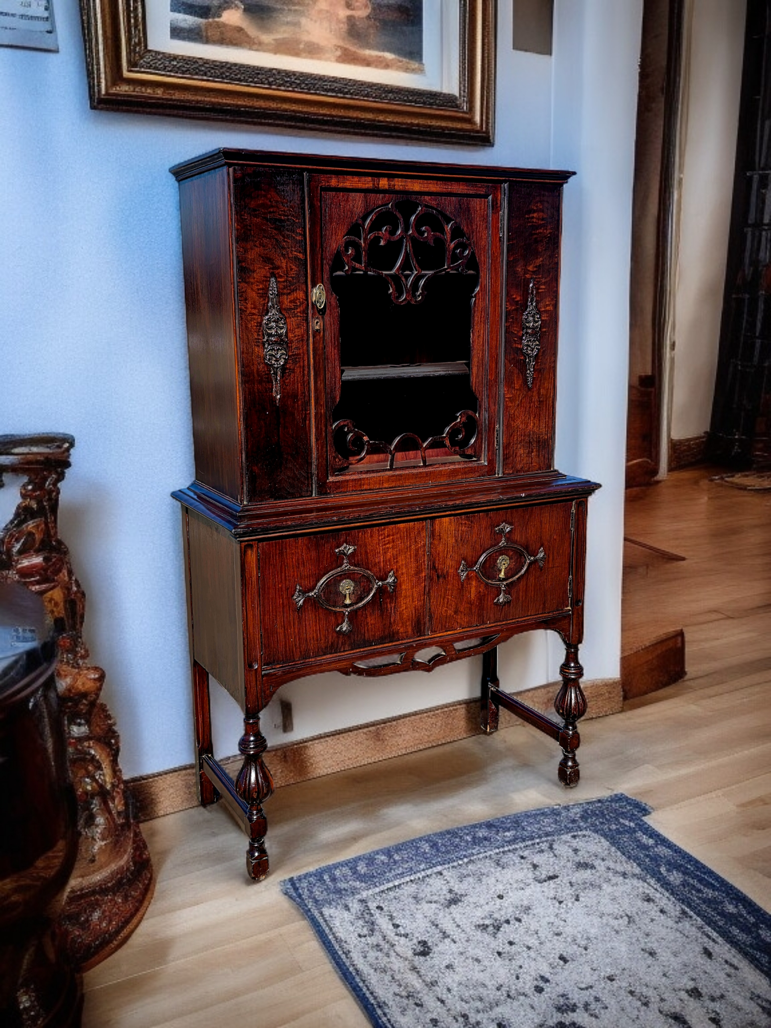 El cuerpo superior presenta un nicho central abierto, flanqueado por dos puertas talladas con delicadeza, mientras que la sección inferior ofrece dos cajones amplios con herrajes ornamentales de metal envejecido. Cada detalle ha sido trabajado con precisión artesanal, reflejando el alma de una época donde el mobiliario era símbolo de estatus y refinamiento.