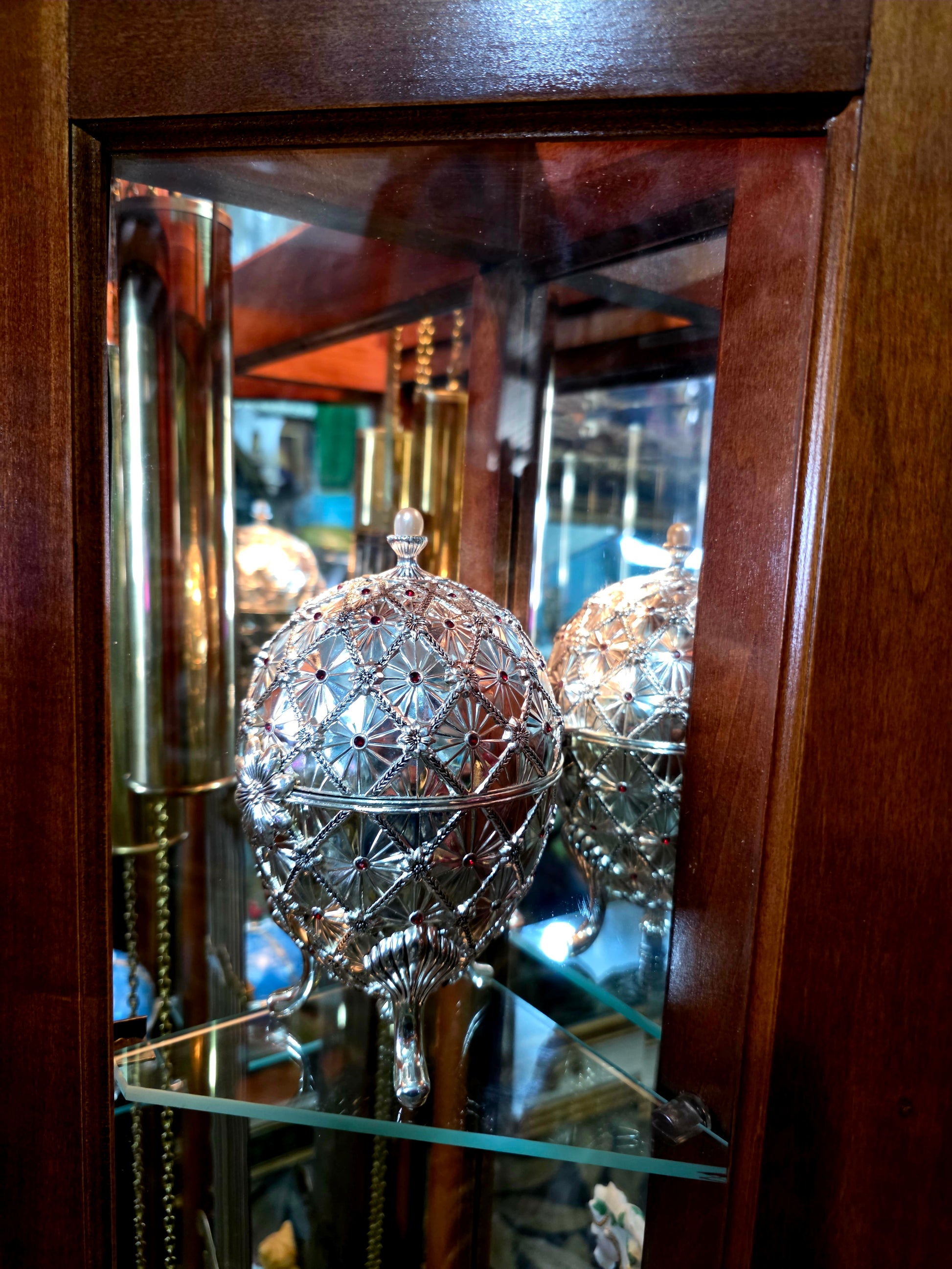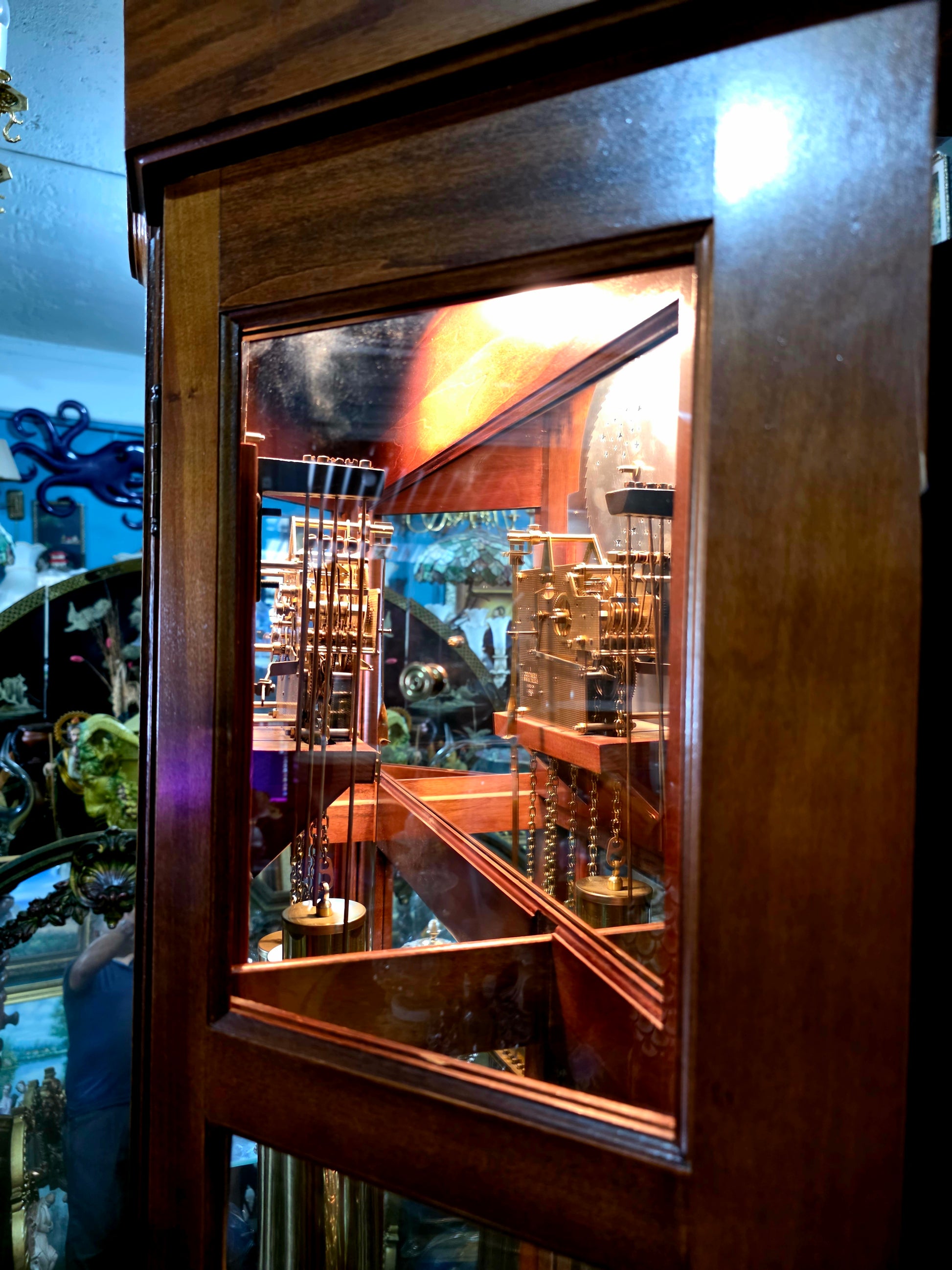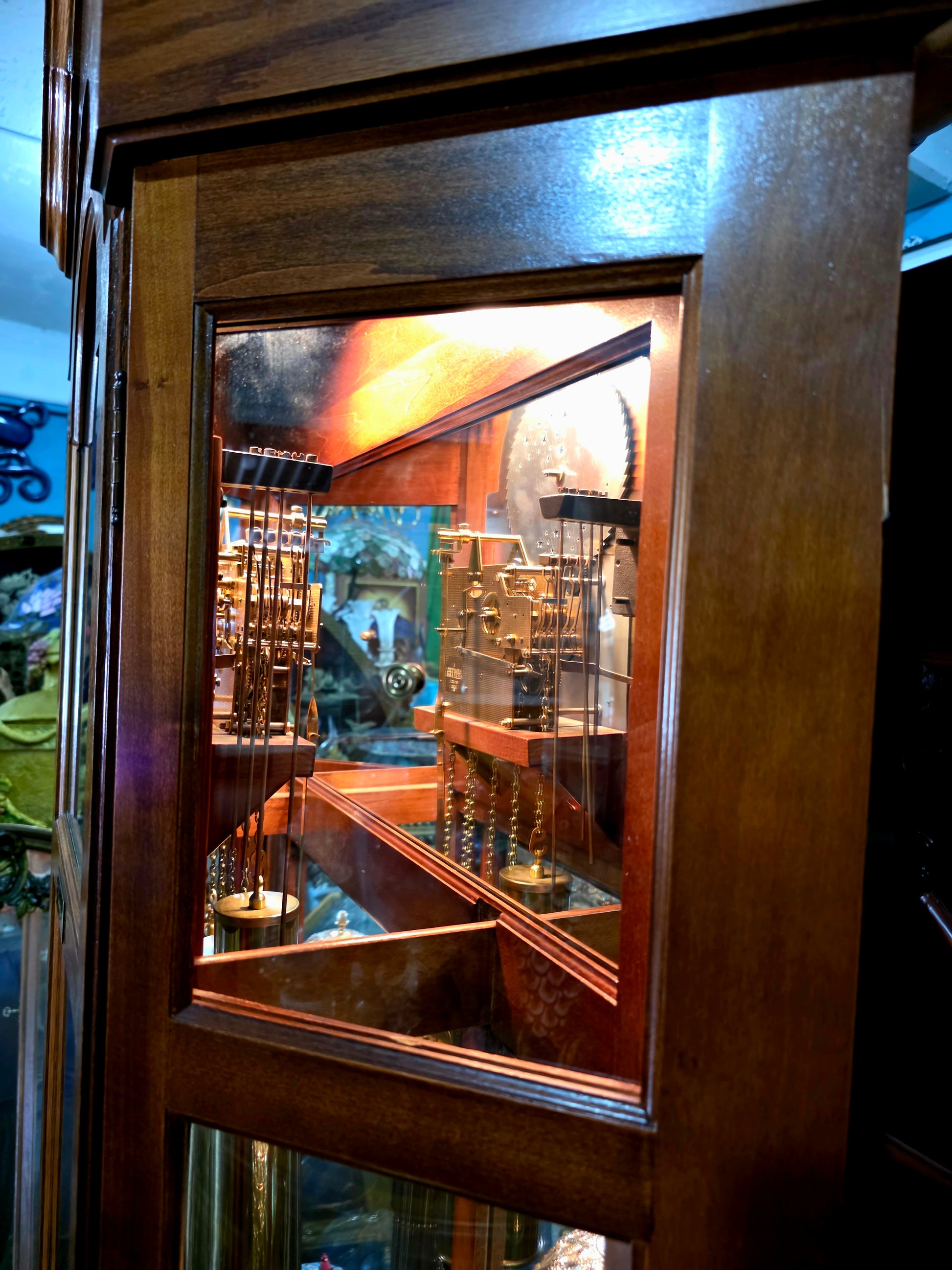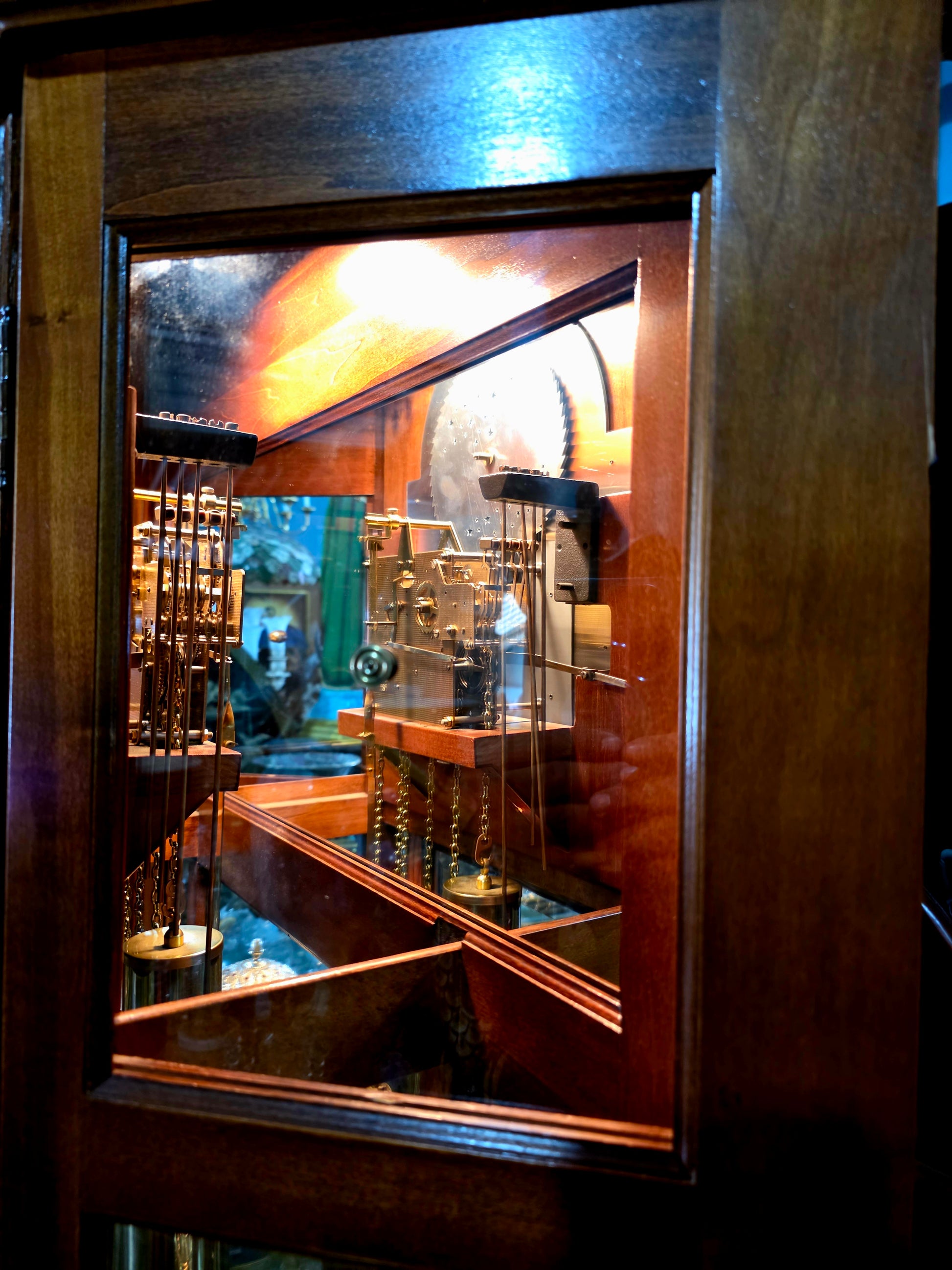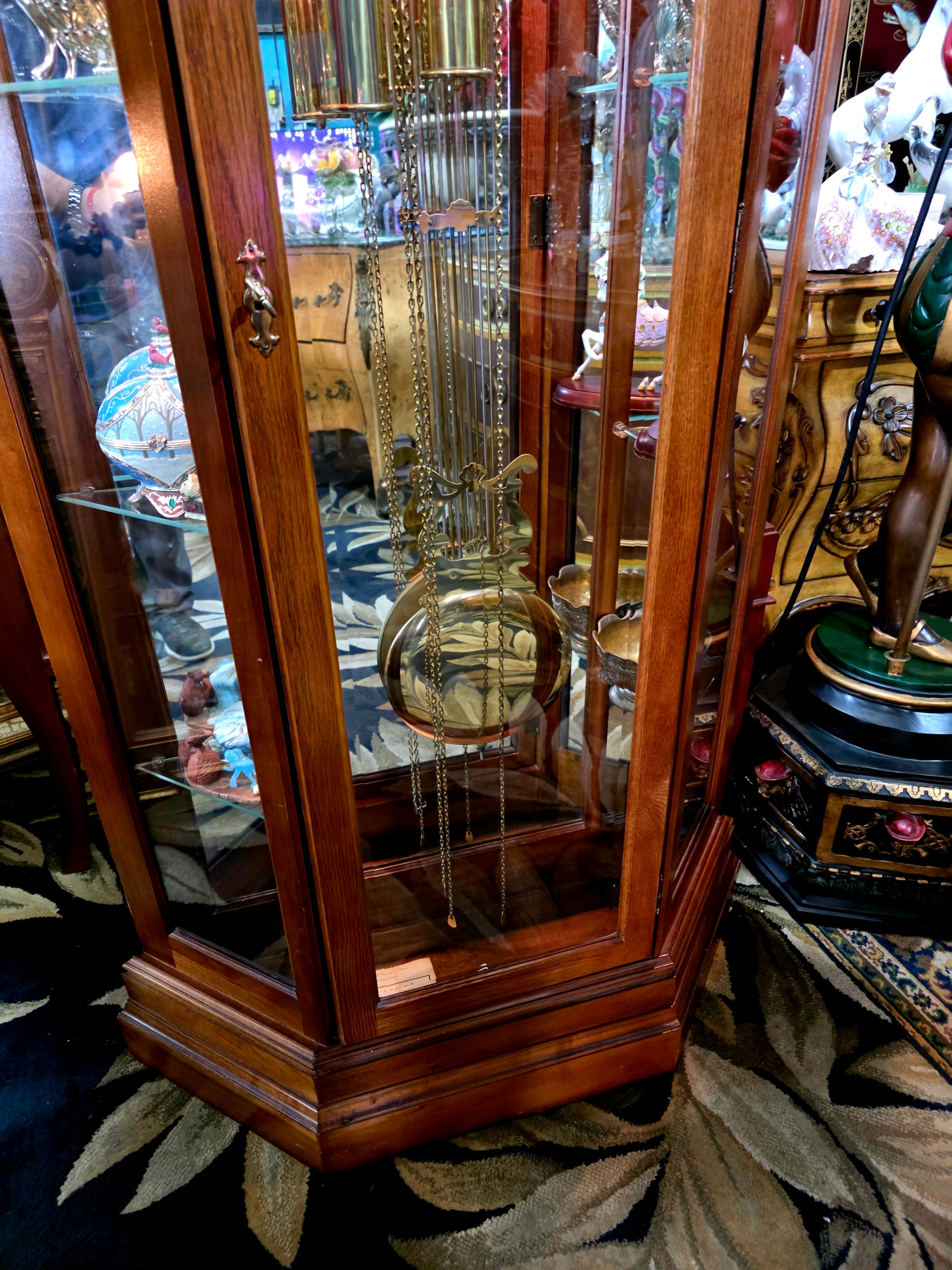 Paneles de vidrio: Las caras frontal y laterales están revestidas con cristal transparente, permitiendo una vista completa del péndulo y los contrapesos. Esta transparencia añade profundidad visual y realza el movimiento interno como una danza mecánica.