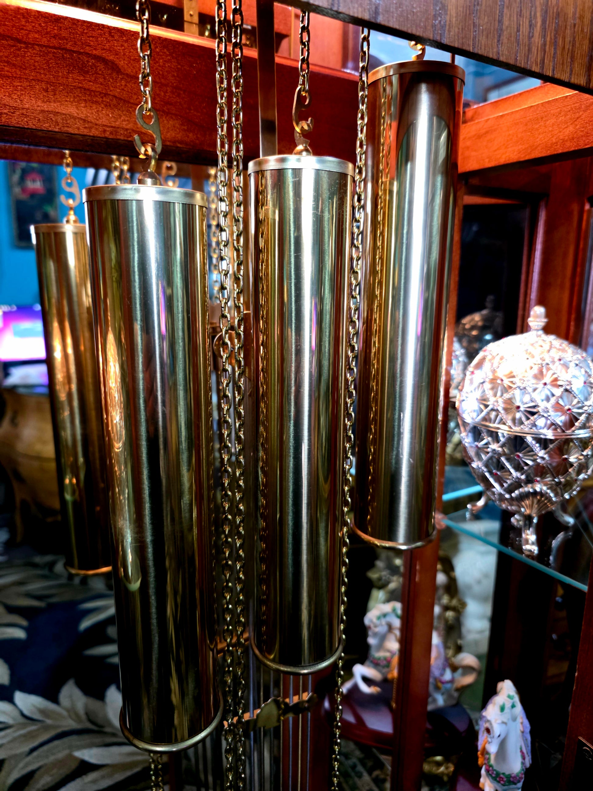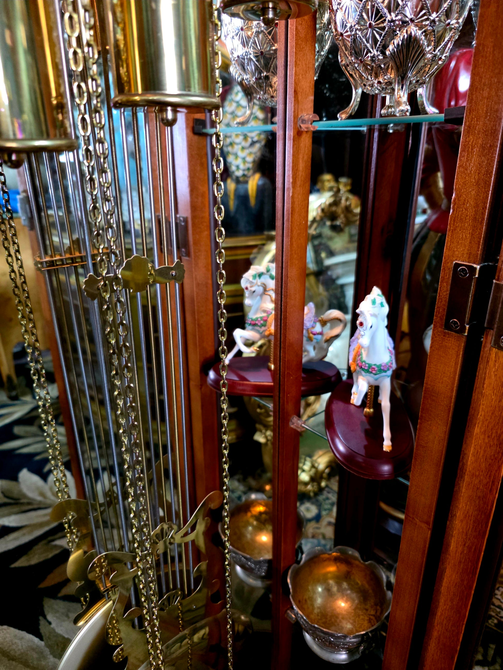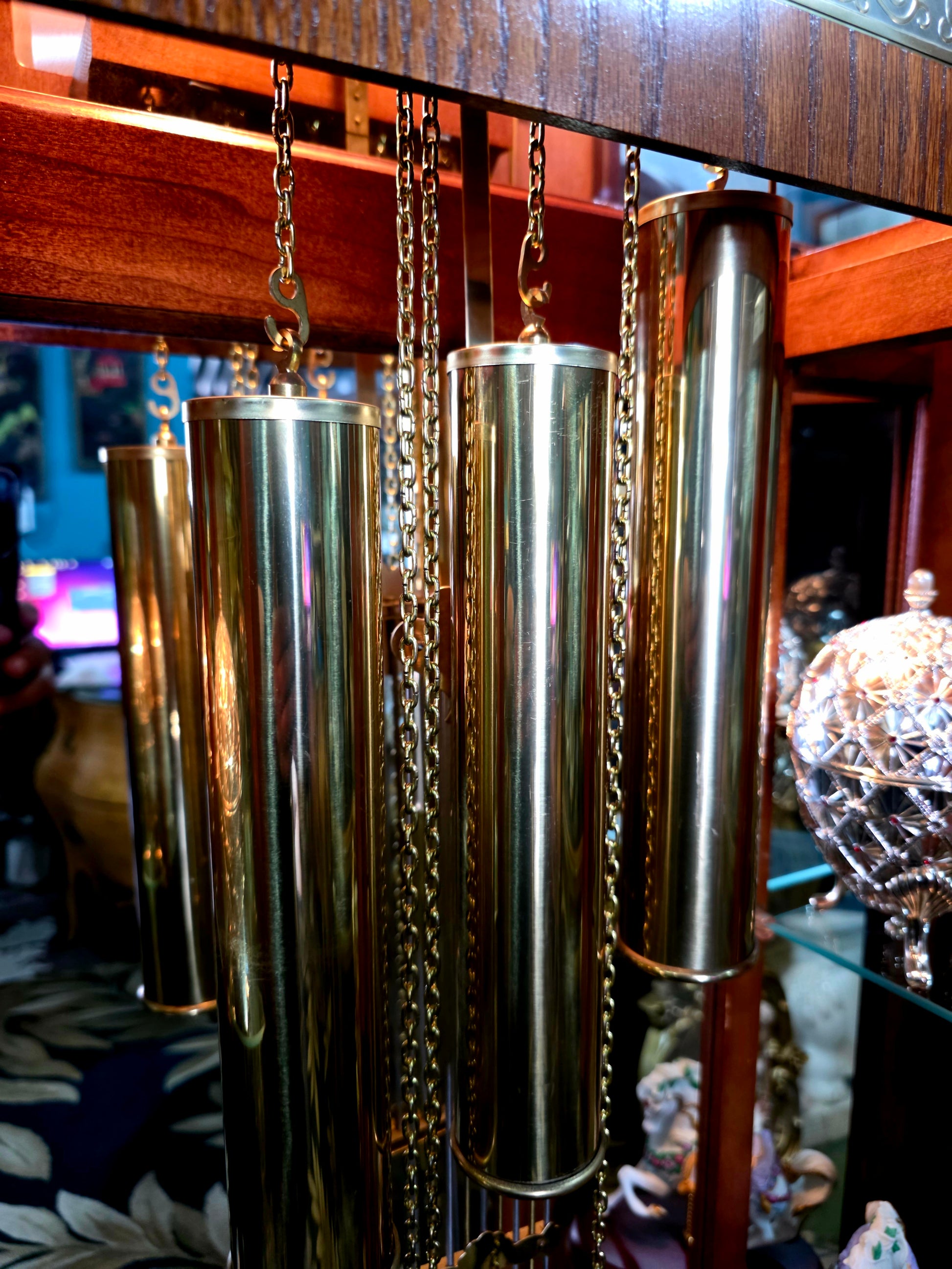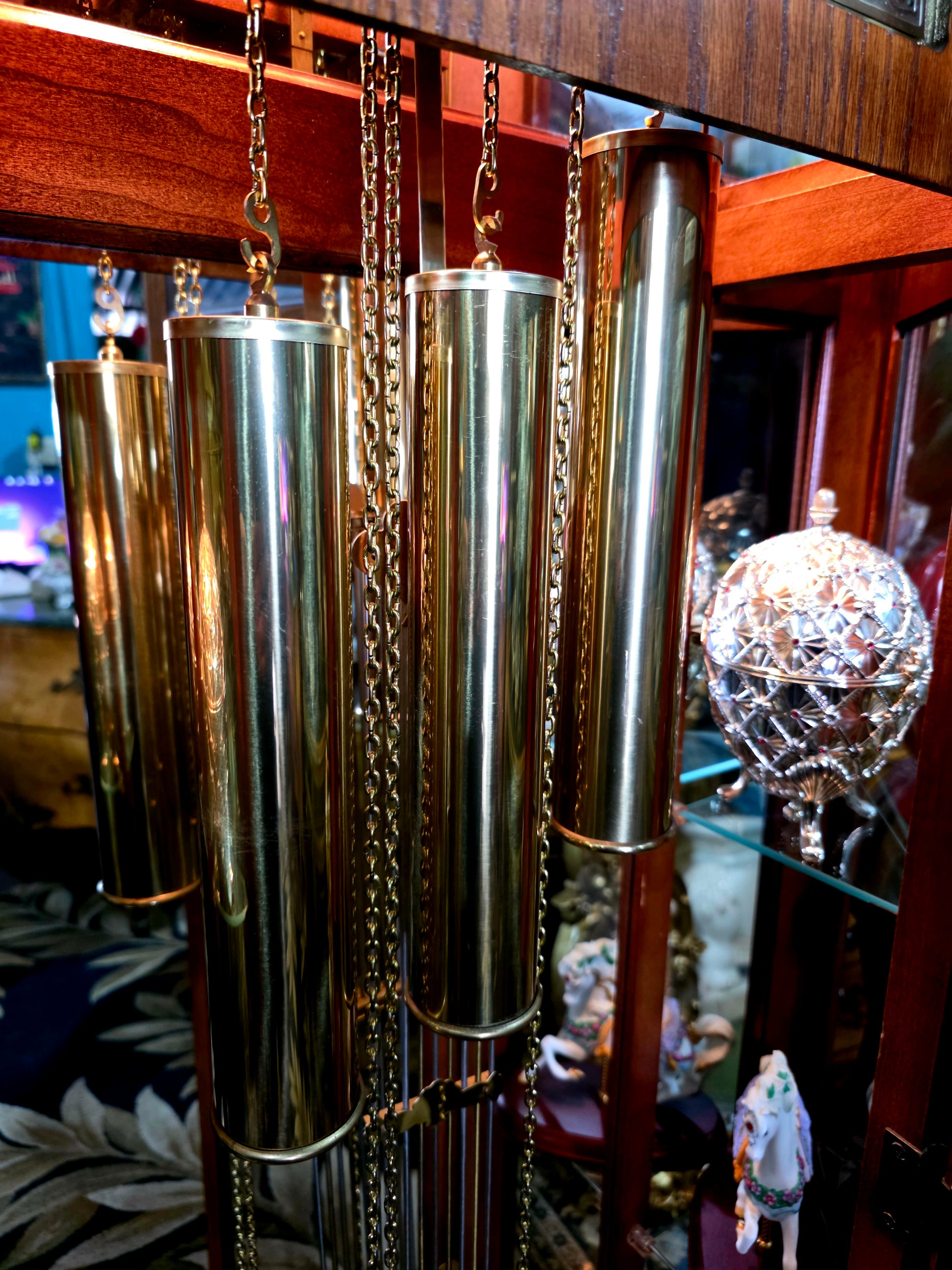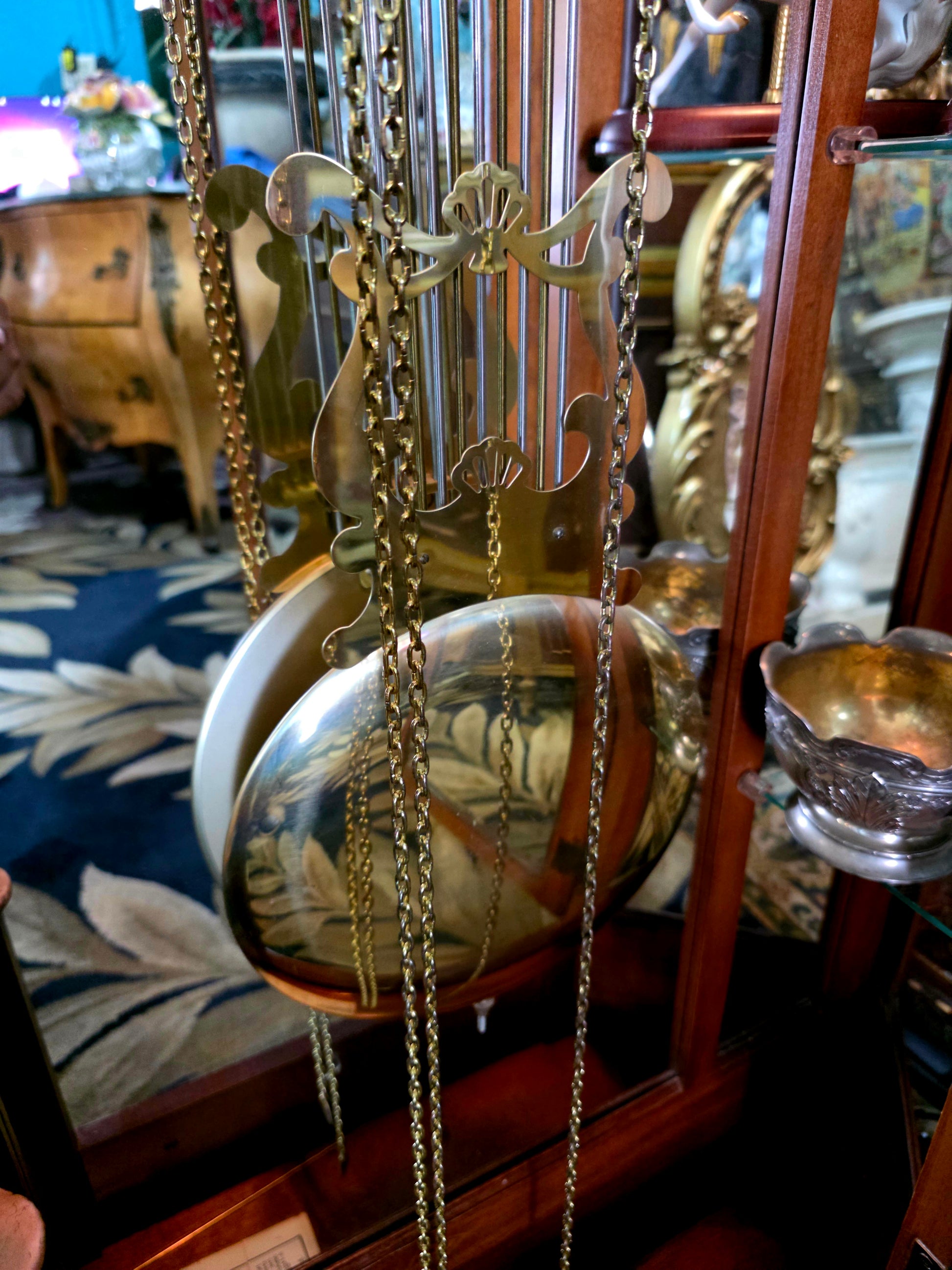 Péndulo y pesos: El péndulo central y los tres contrapesos laterales están elaborados en metal brillante, suspendidos con precisión y equilibrio. Su movimiento constante transmite serenidad y ritmo, como el latido de una casa noble.