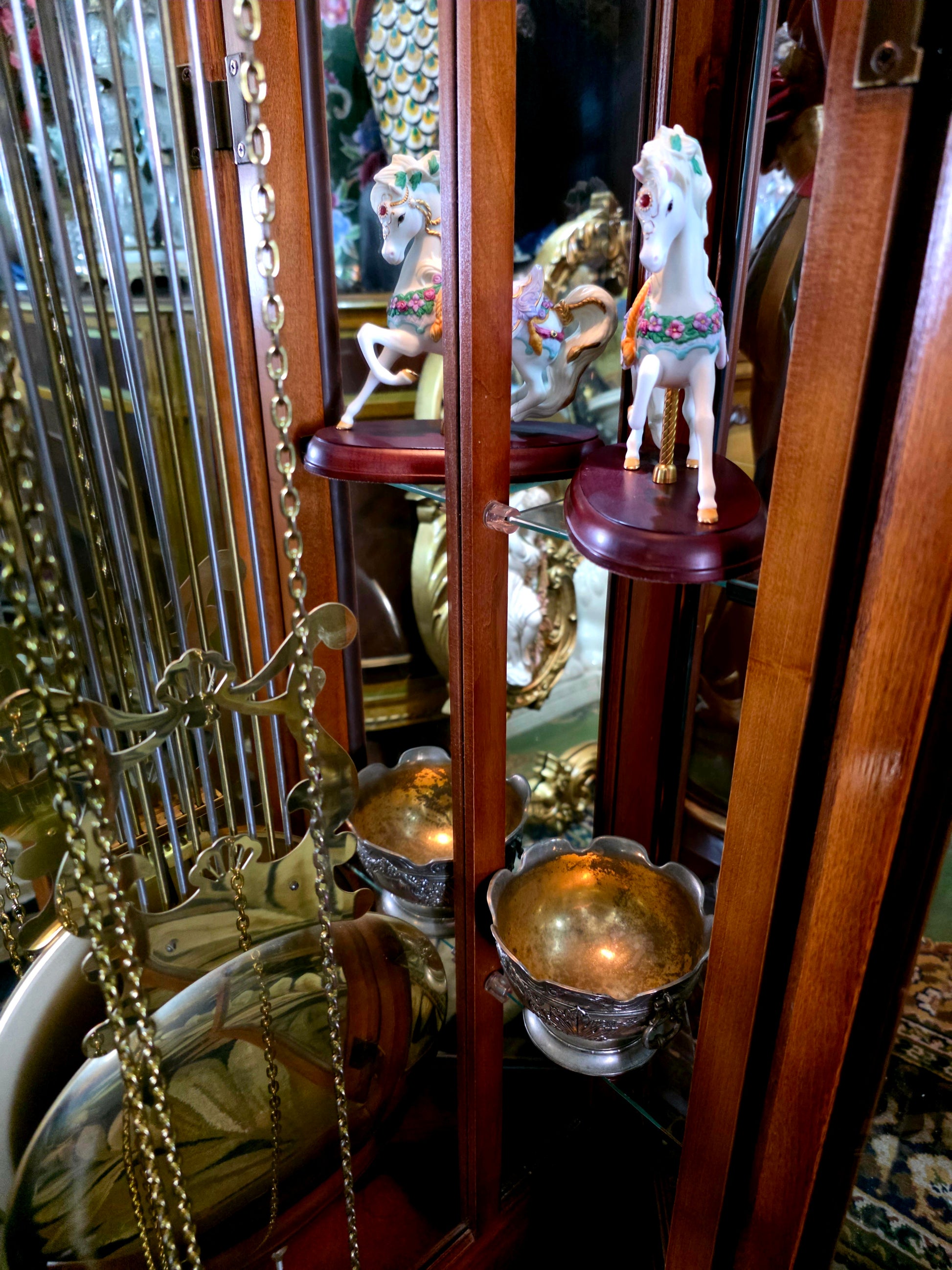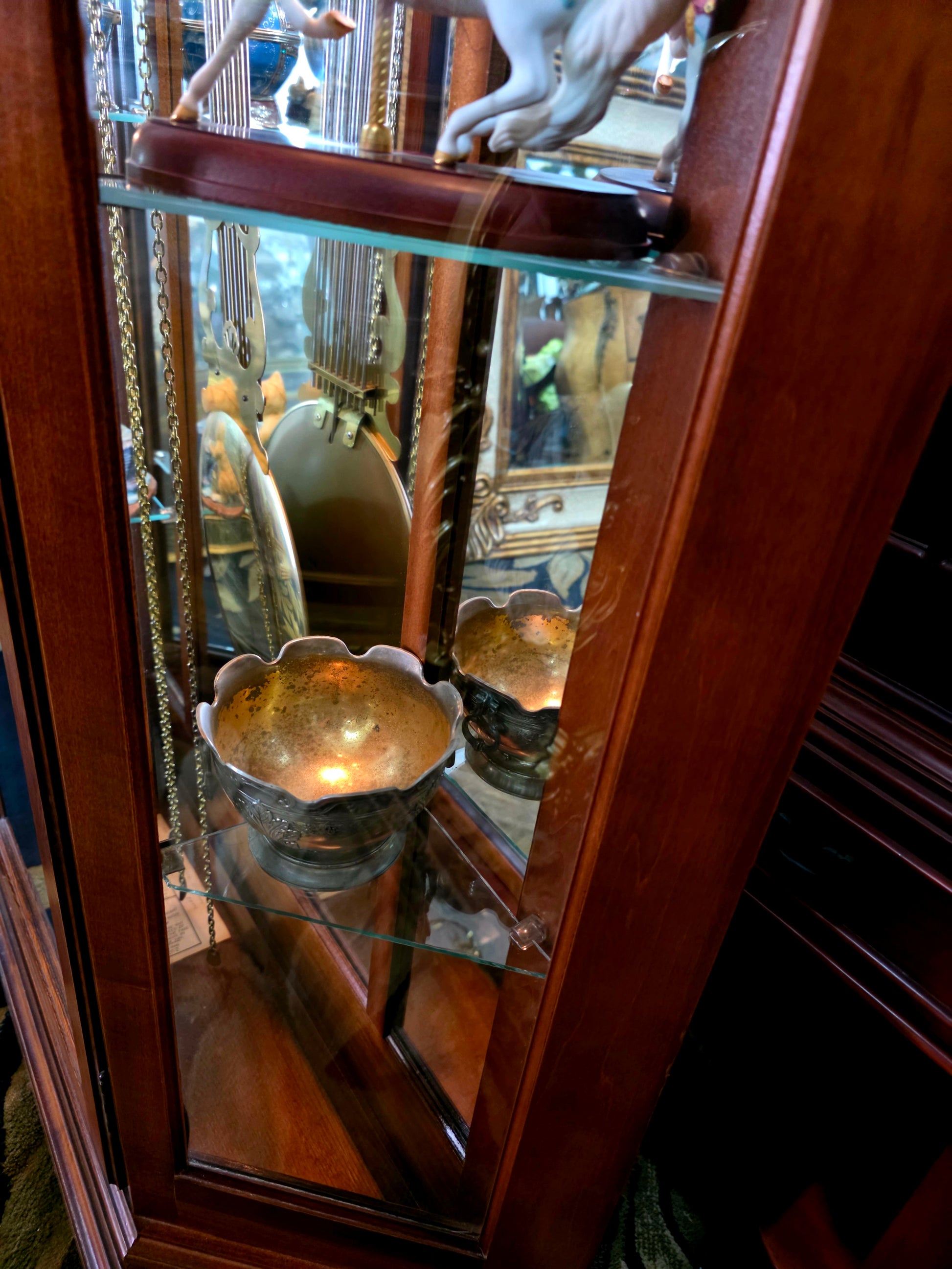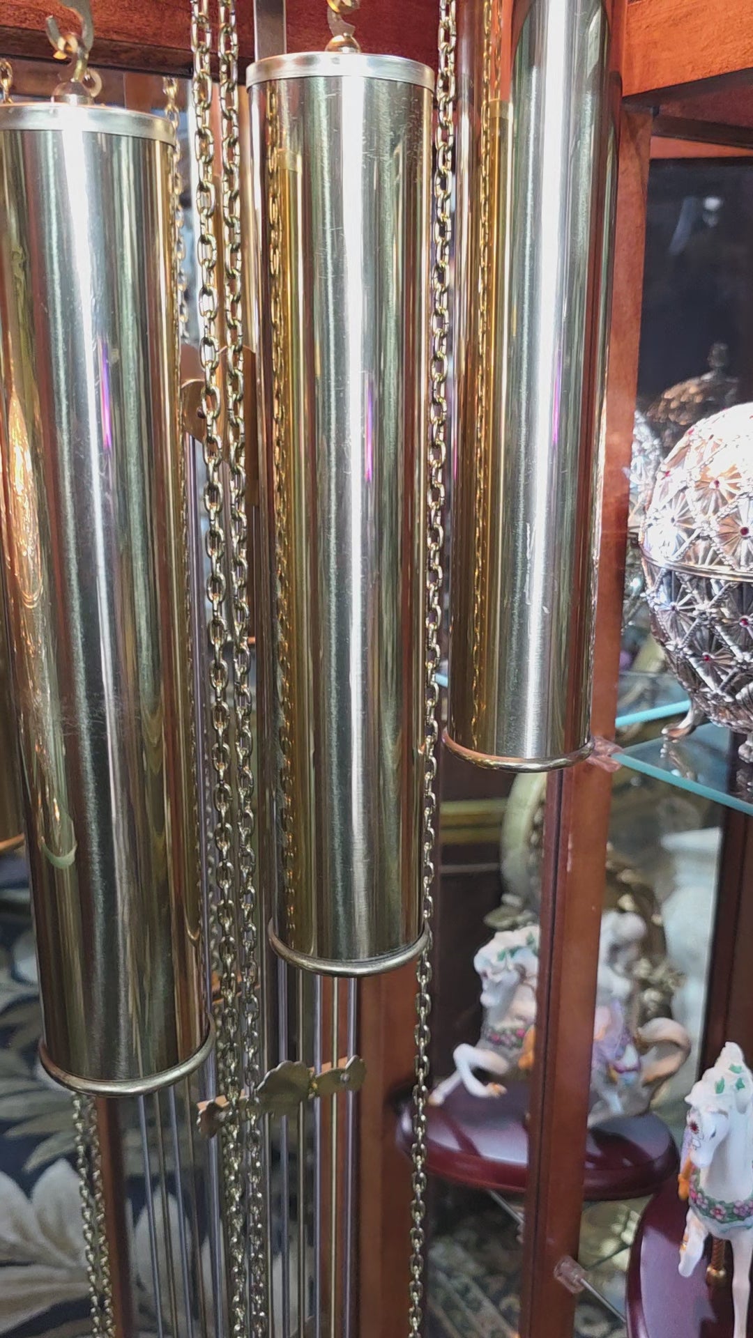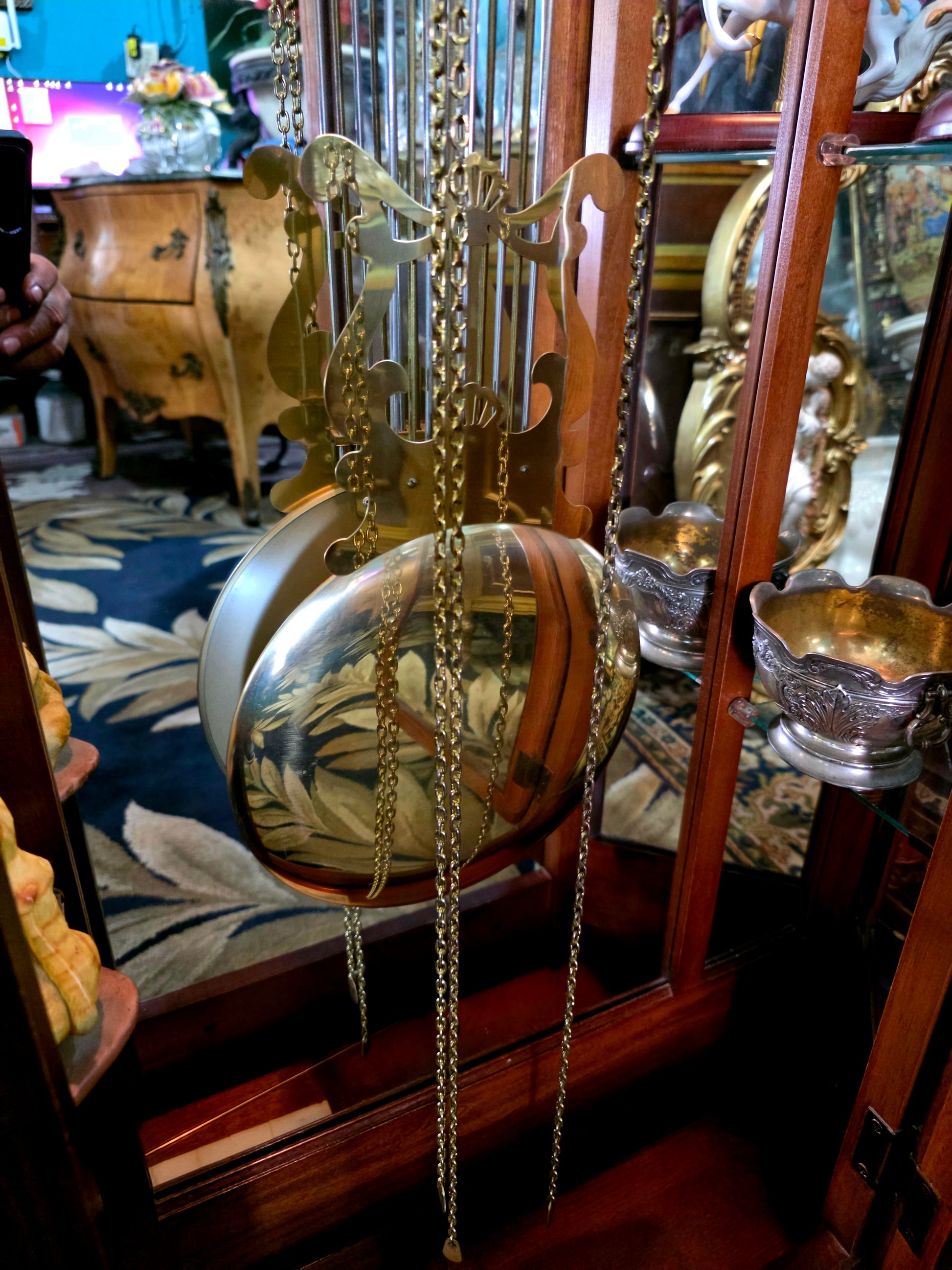 Péndulo y pesos: El péndulo central y los tres contrapesos laterales están elaborados en metal brillante, suspendidos con precisión y equilibrio. Su movimiento constante transmite serenidad y ritmo, como el latido de una casa noble.