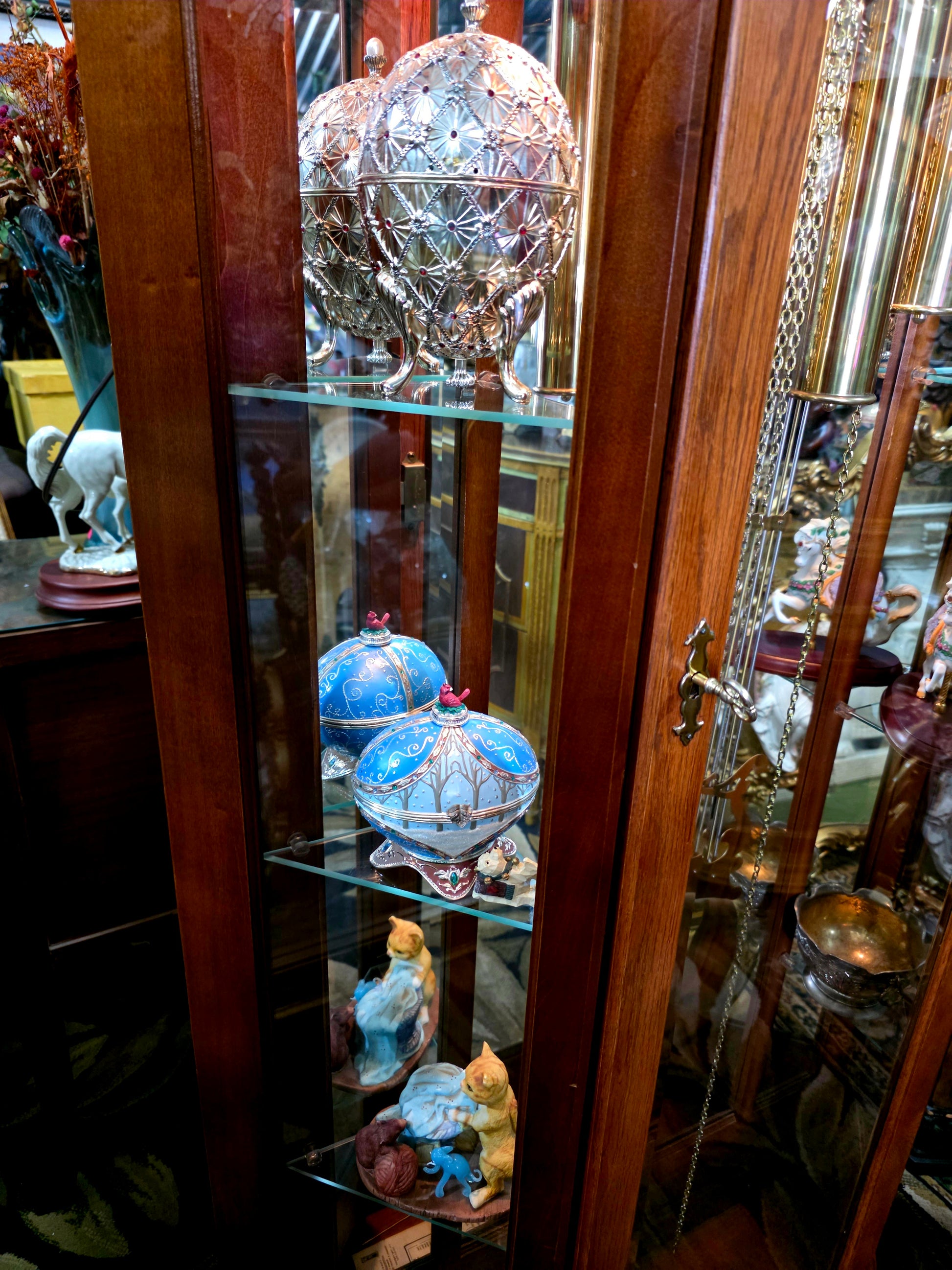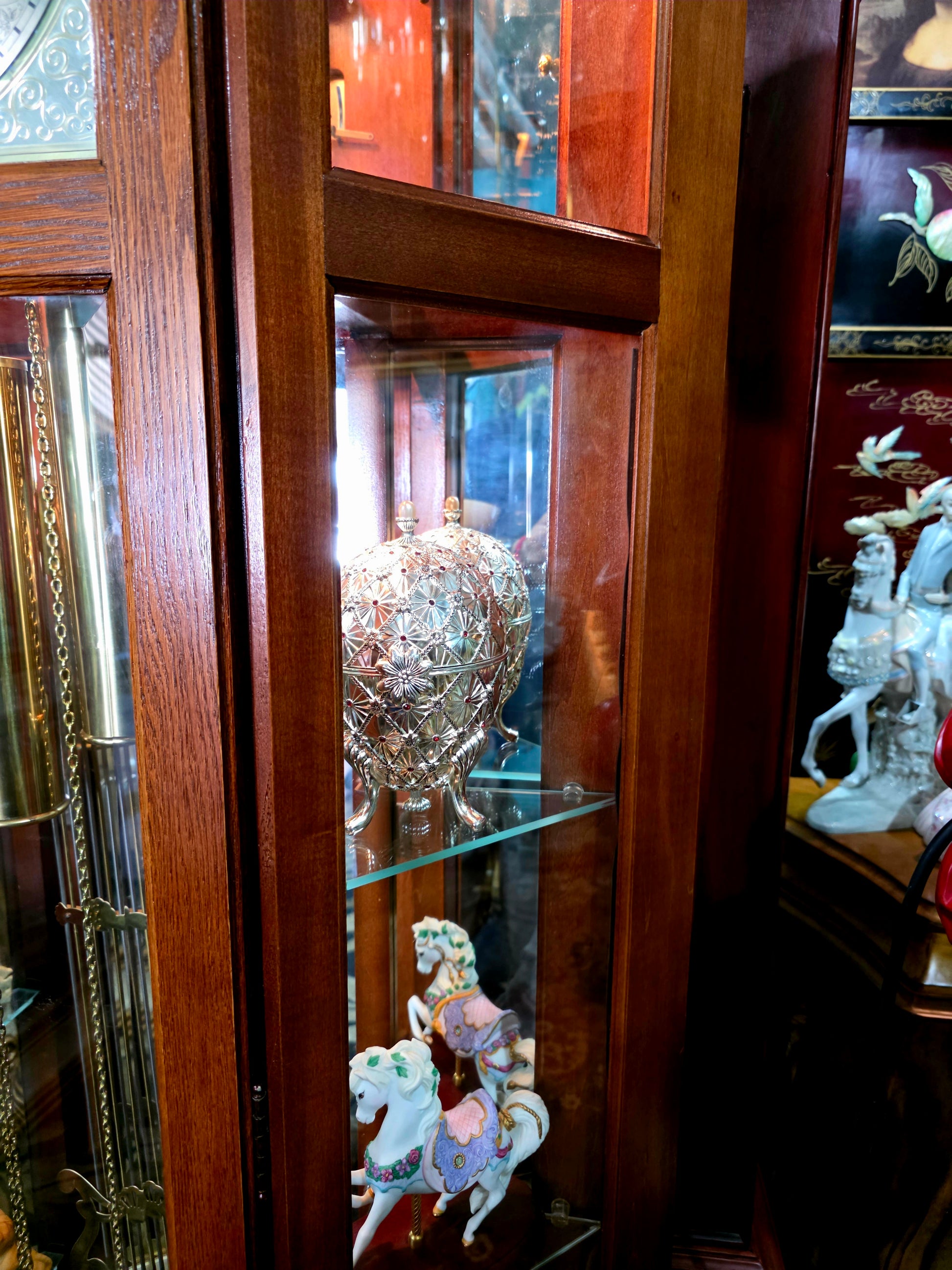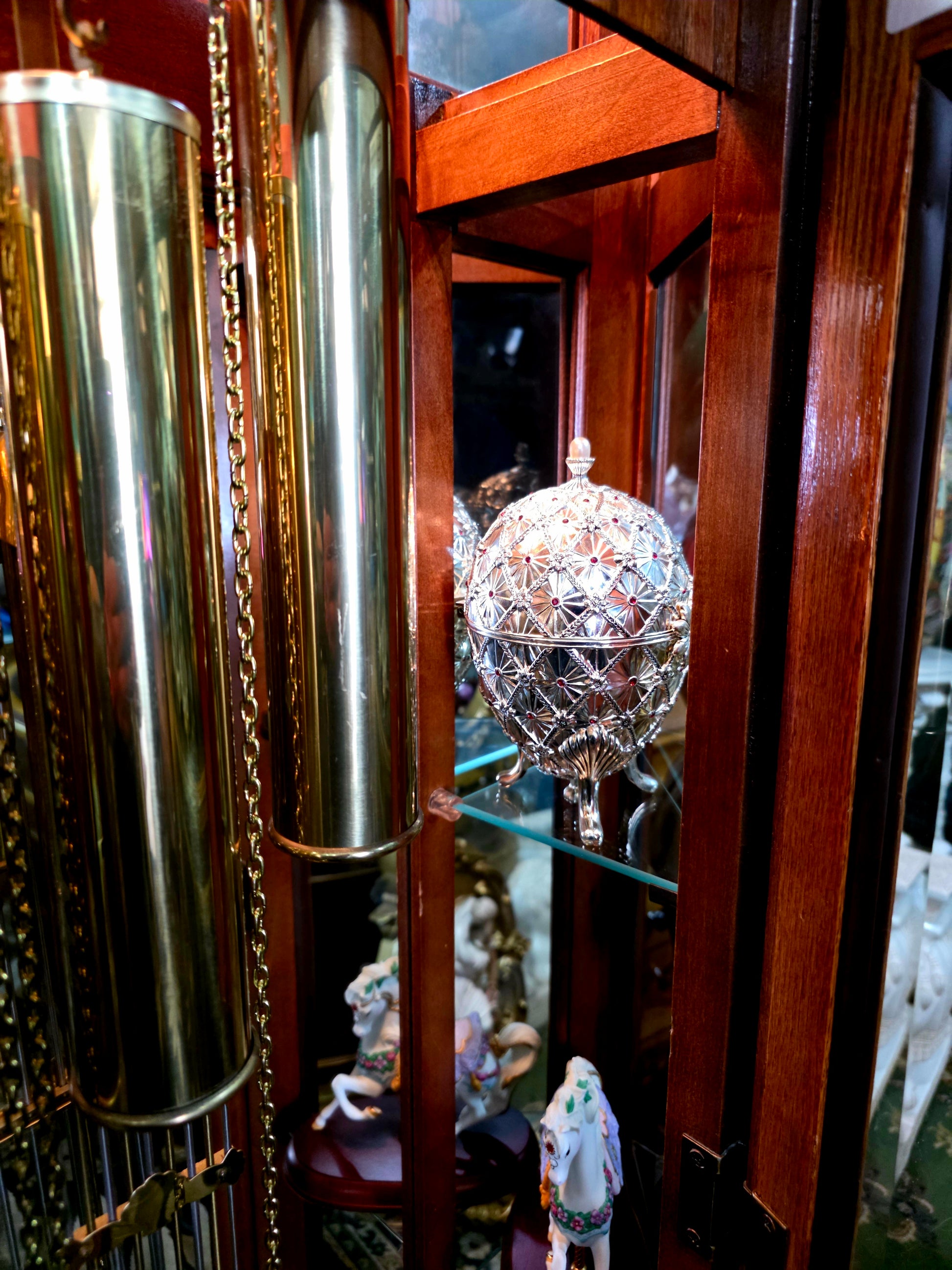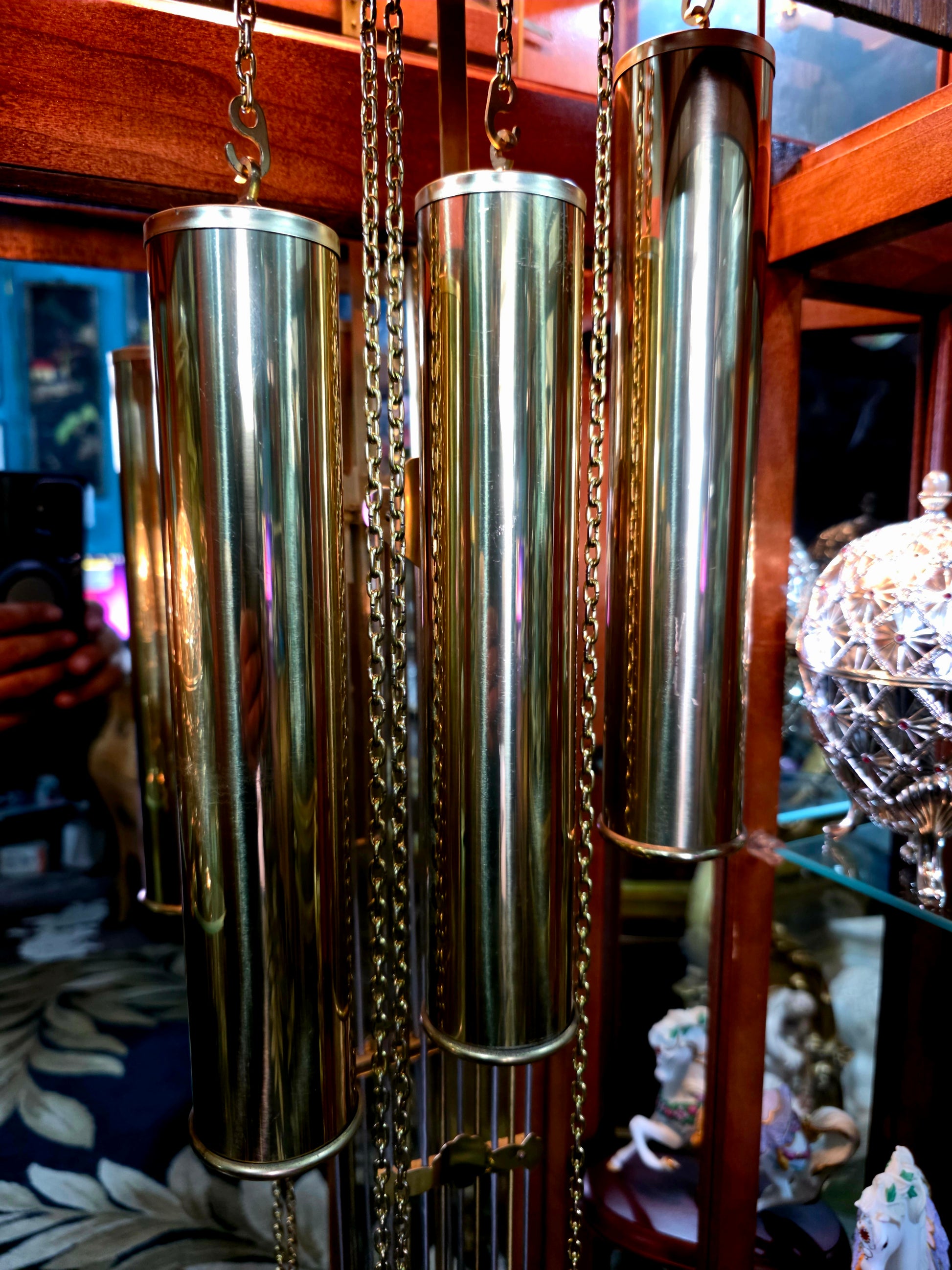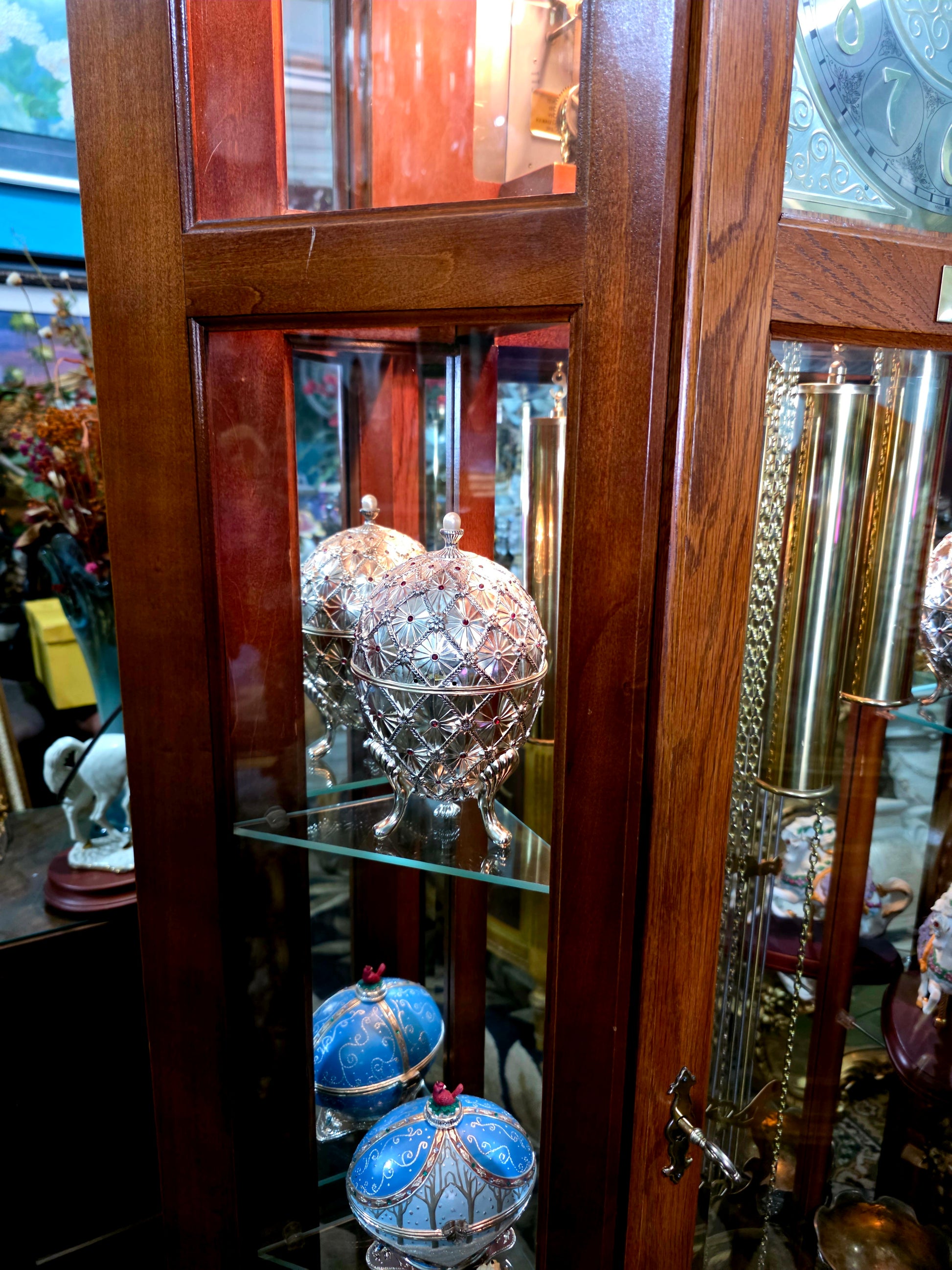 Péndulo y pesos: El péndulo central y los tres contrapesos laterales están elaborados en metal brillante, suspendidos con precisión y equilibrio. Su movimiento constante transmite serenidad y ritmo, como el latido de una casa noble.
