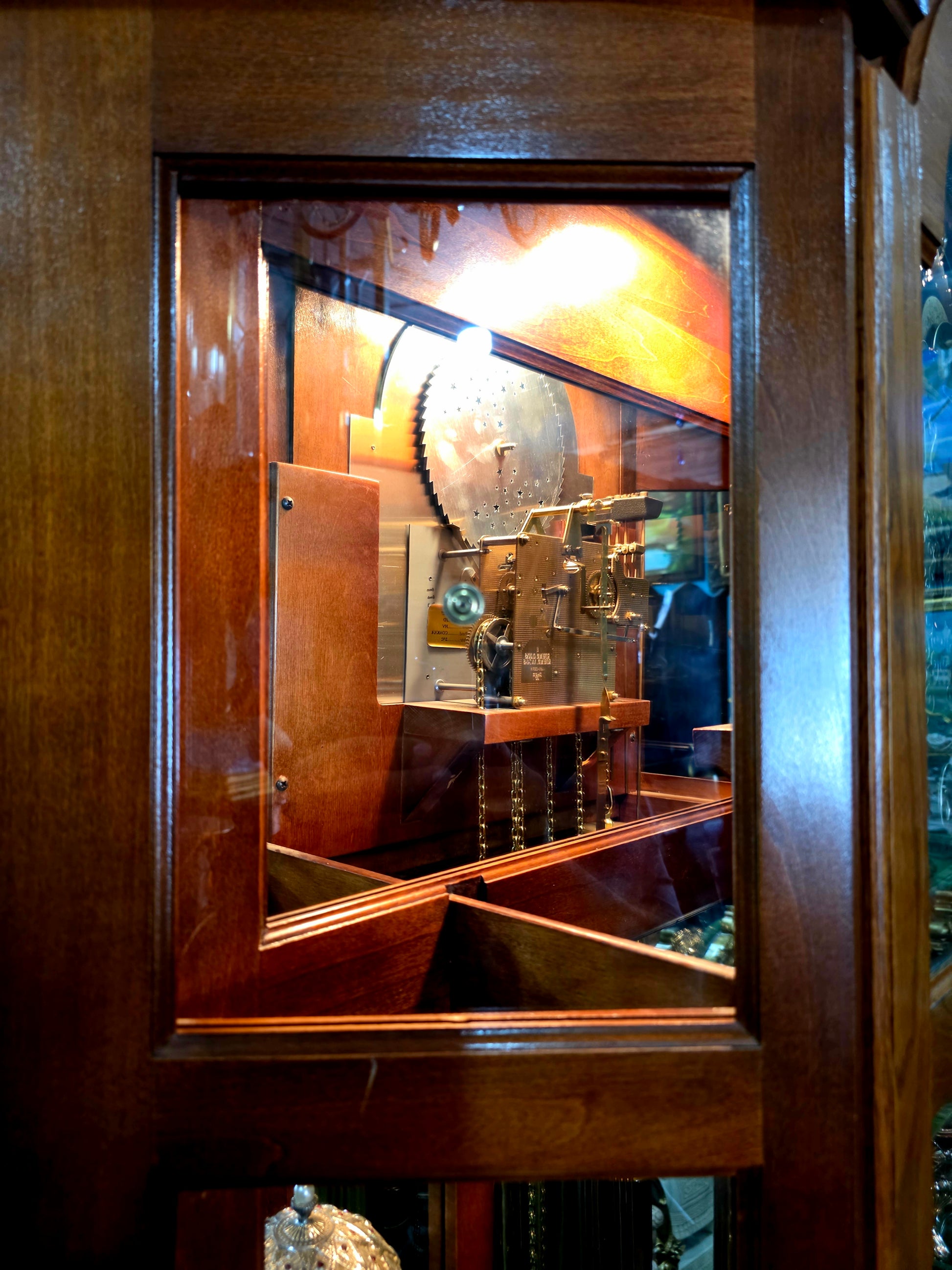 Cuerpo arquitectónico: La estructura vertical, imponente y refinada, está construida en madera maciza con acabado pulido en tono cálido. Sus líneas clásicas se elevan con dignidad, enmarcando el mecanismo interno como si se tratara de una vitrina ceremonial.