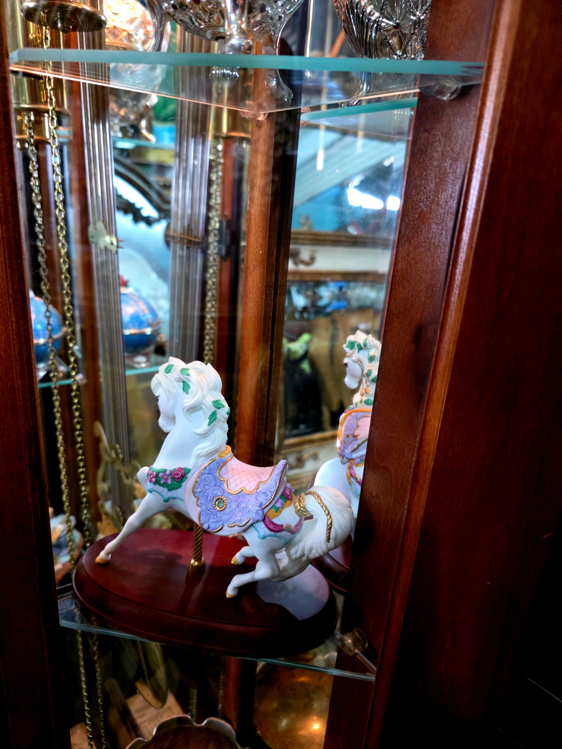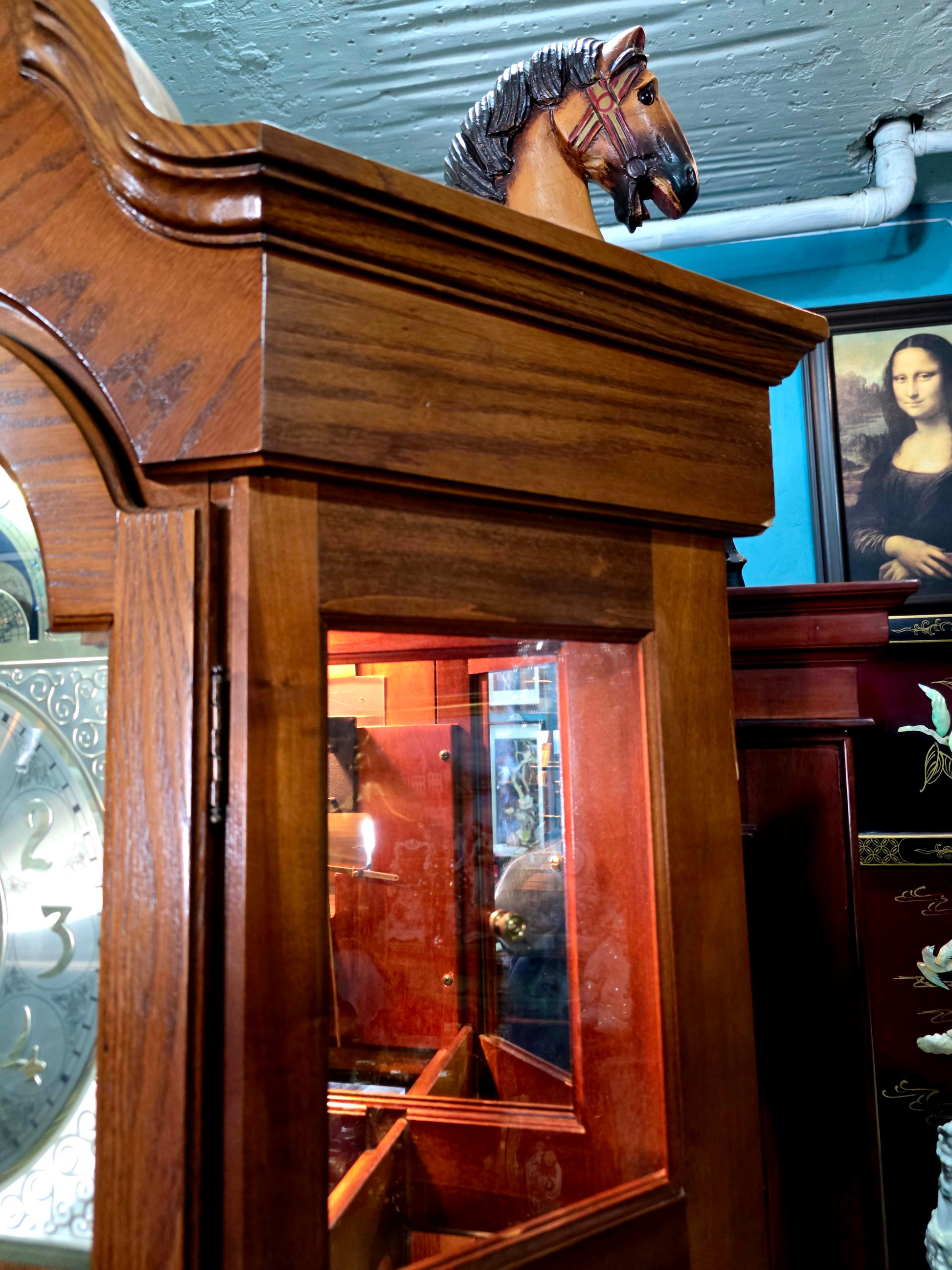 Carátula metálica: El rostro del reloj, en tono plateado, presenta números romanos elegantemente distribuidos, con agujas estilizadas y detalles ornamentales que evocan la relojería tradicional. Sobre la carátula, un arco decorativo coronado por una cabeza de caballo tallada añade carácter y simbolismo ecuestre.