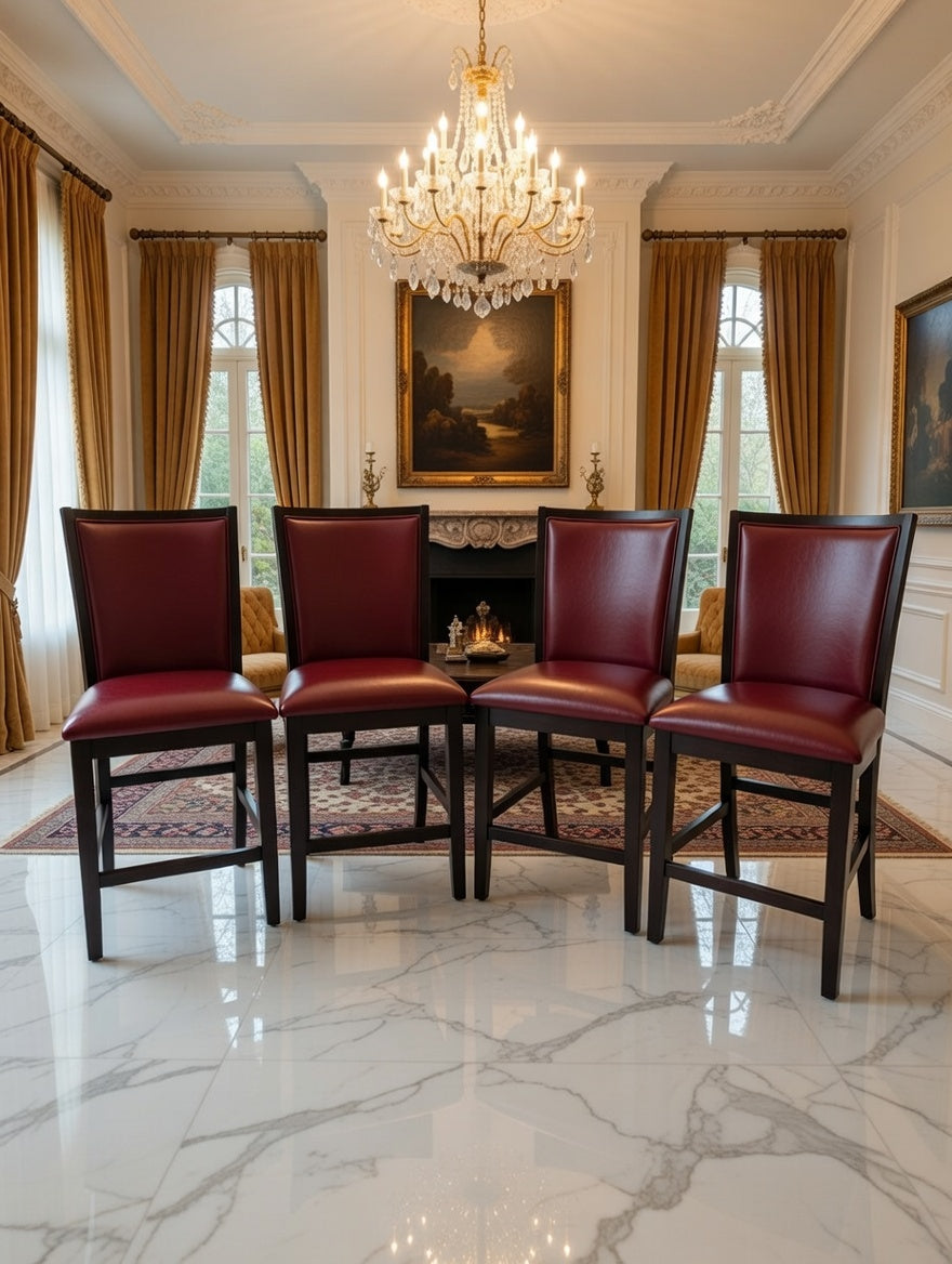 Cada banco ha sido cuidadosamente elaborado con una estructura sólida de madera oscura, símbolo de resistencia y durabilidad. El tapizado en rojo vibrante aporta calidez, fuerza visual y un toque ceremonial que transforma cualquier ambiente en un escenario de distinción.