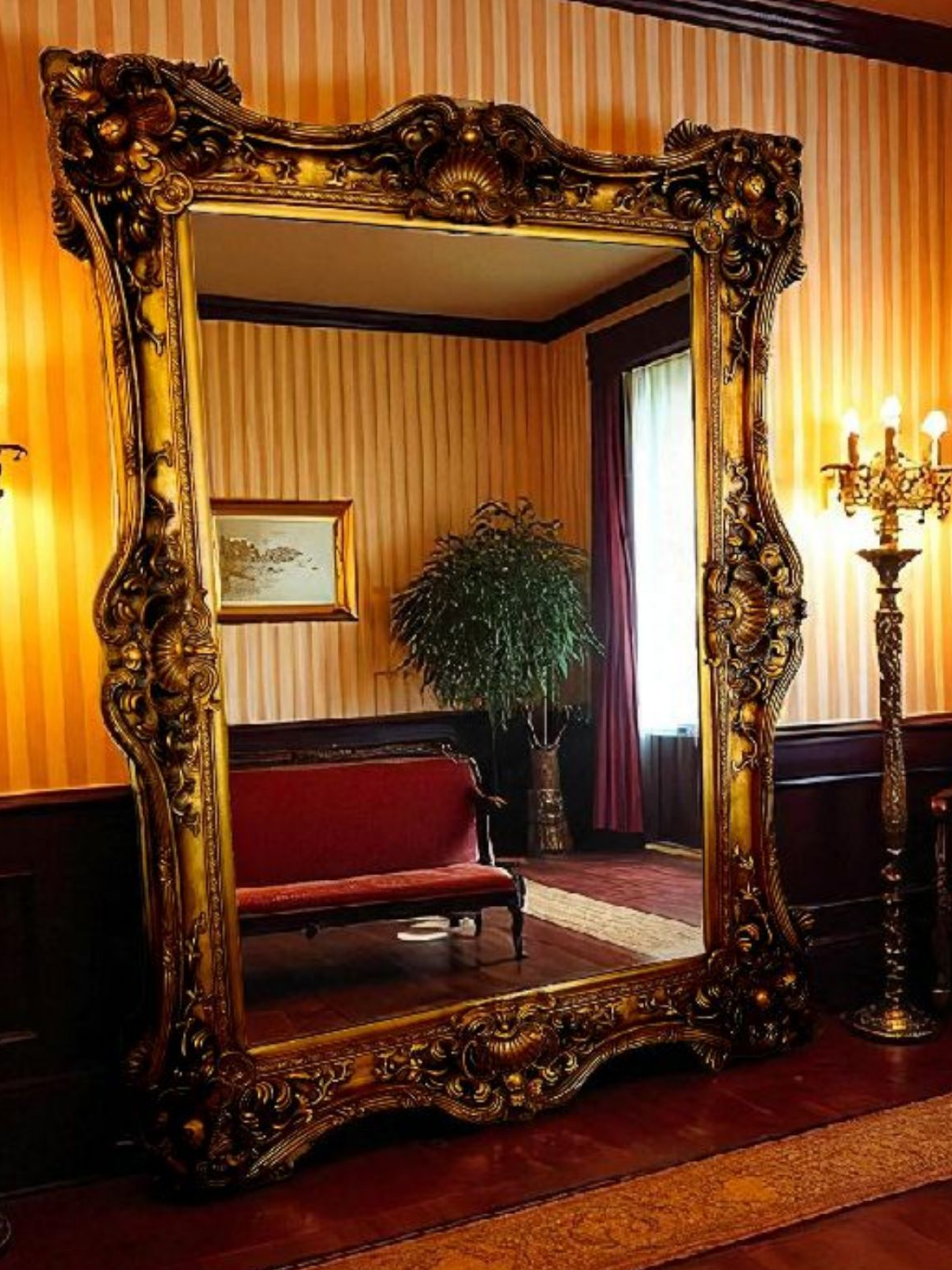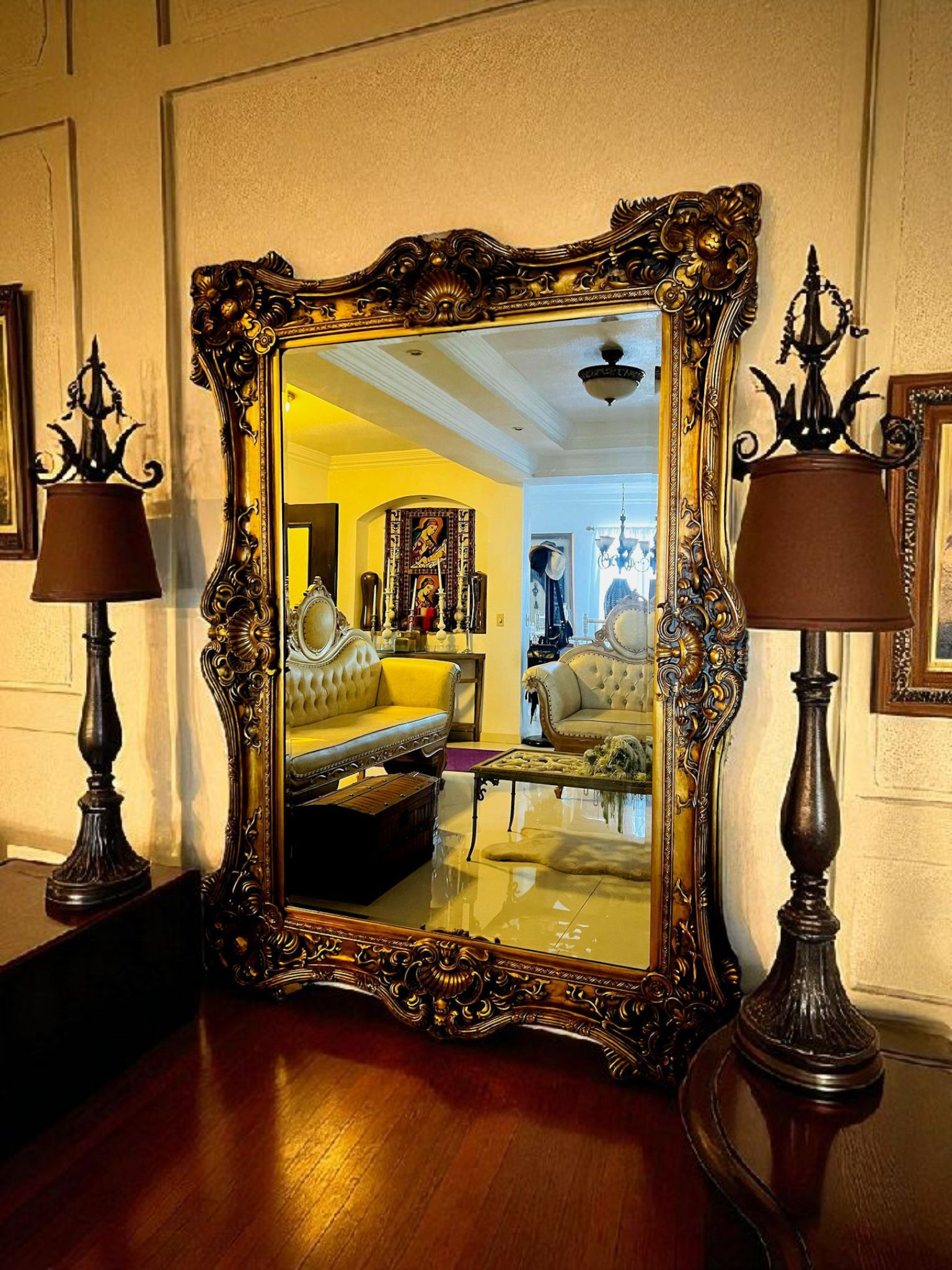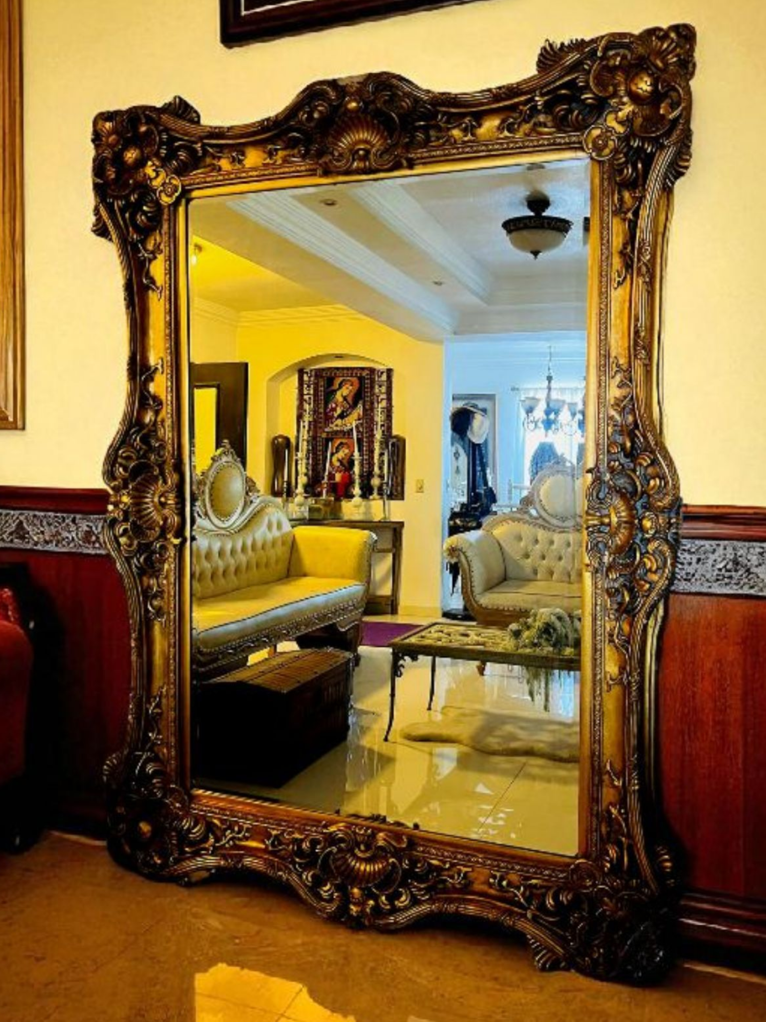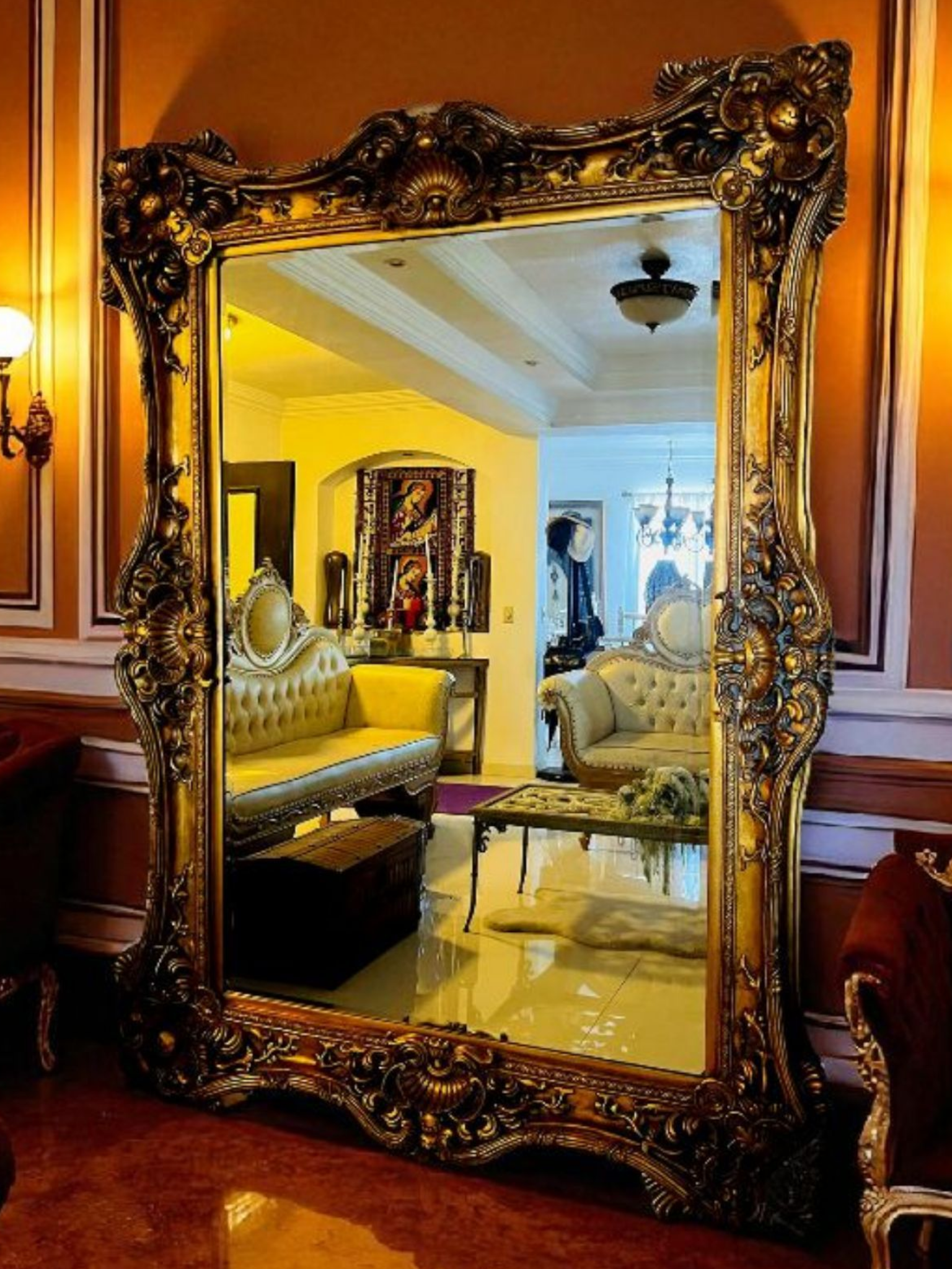 Este hermoso espejo de cuerpo entero cuenta con un marco de madera finamente adornado con un intrincado trabajo de incrustaciones en tonos dorados. Su diseño ornamentado y detallado no solo aporta un toque de sofisticación, sino que también transforma cualquier espacio en un ambiente clásico y elegante. Ideal para colgar en la pared, este espejo no solo es una pieza decorativa, sino también una inversión en calidad y durabilidad.