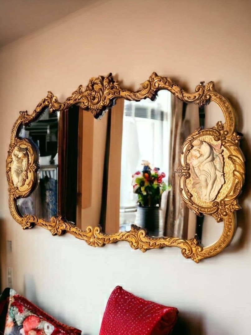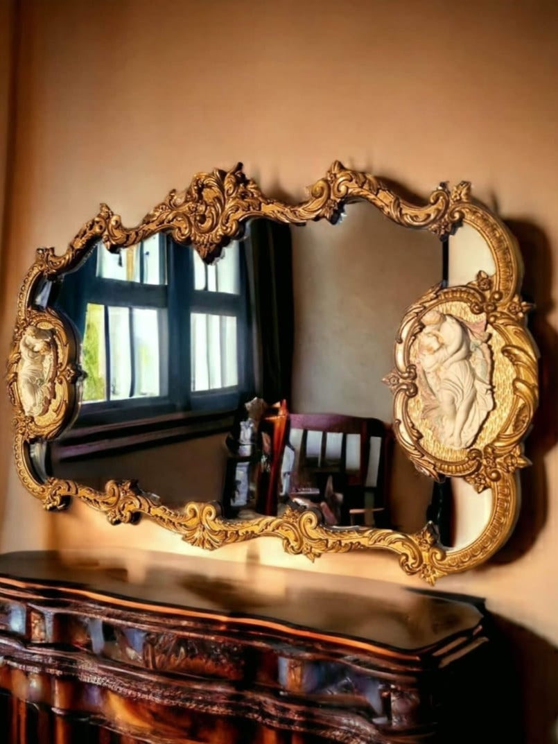 Este hermoso espejo estilo rococó, una réplica pintada en color oro antiguo, es el complemento ideal para añadir un toque de elegancia clásica y sofisticación a tu hogar. Su decoración inspirada en Romeo y Julieta y su estado impecable lo convierten en una pieza extraordinaria. 🪞✨