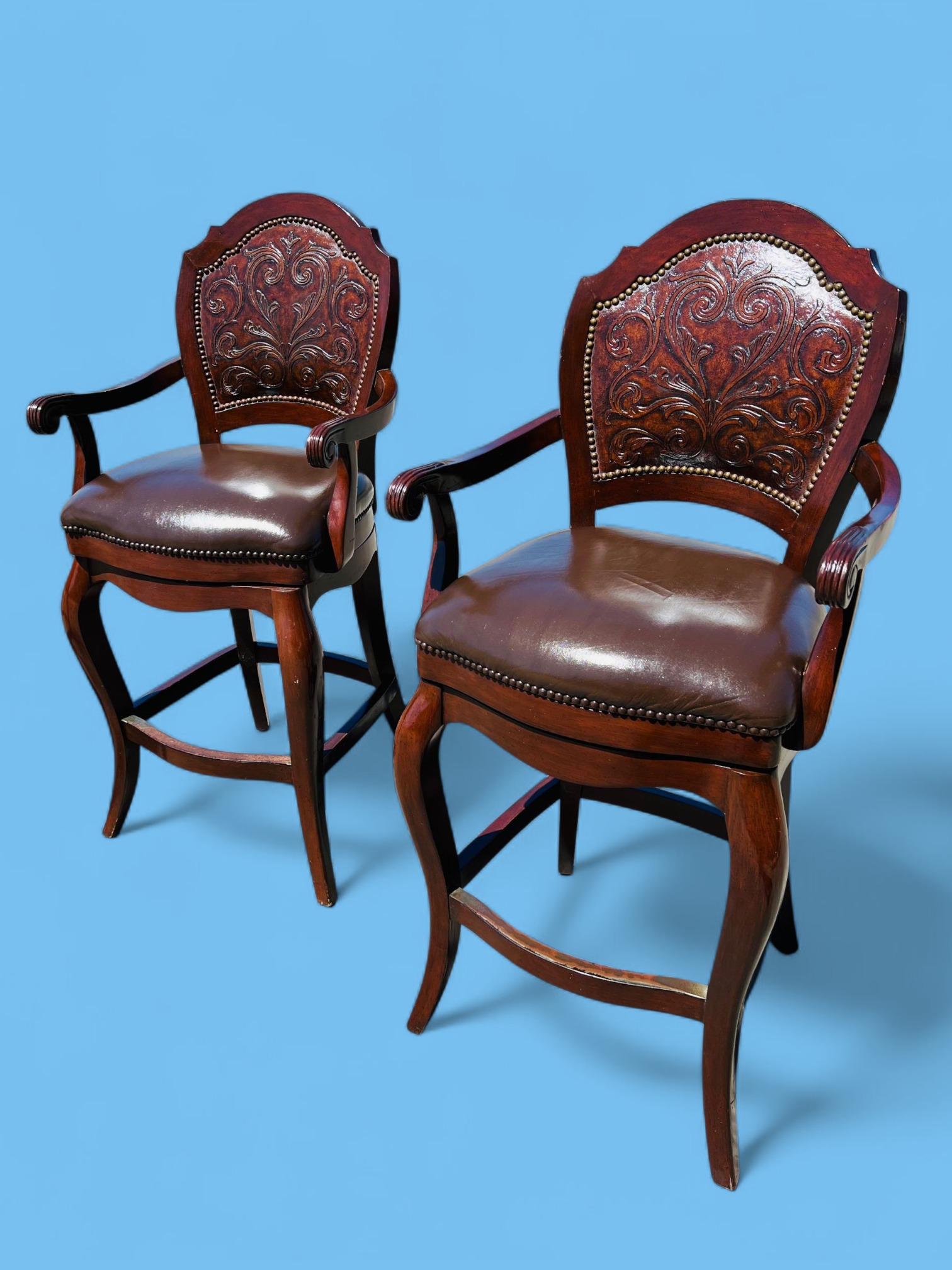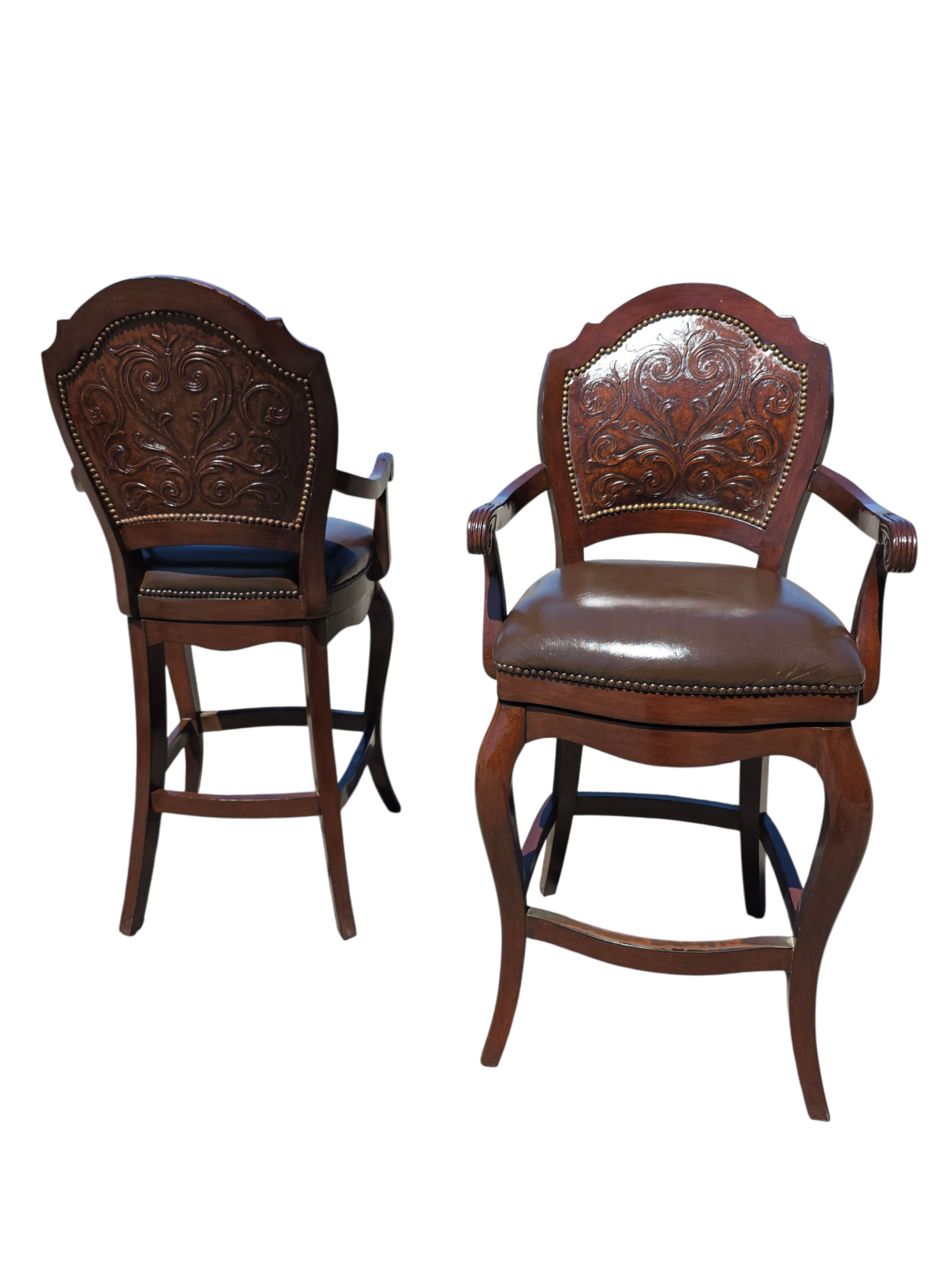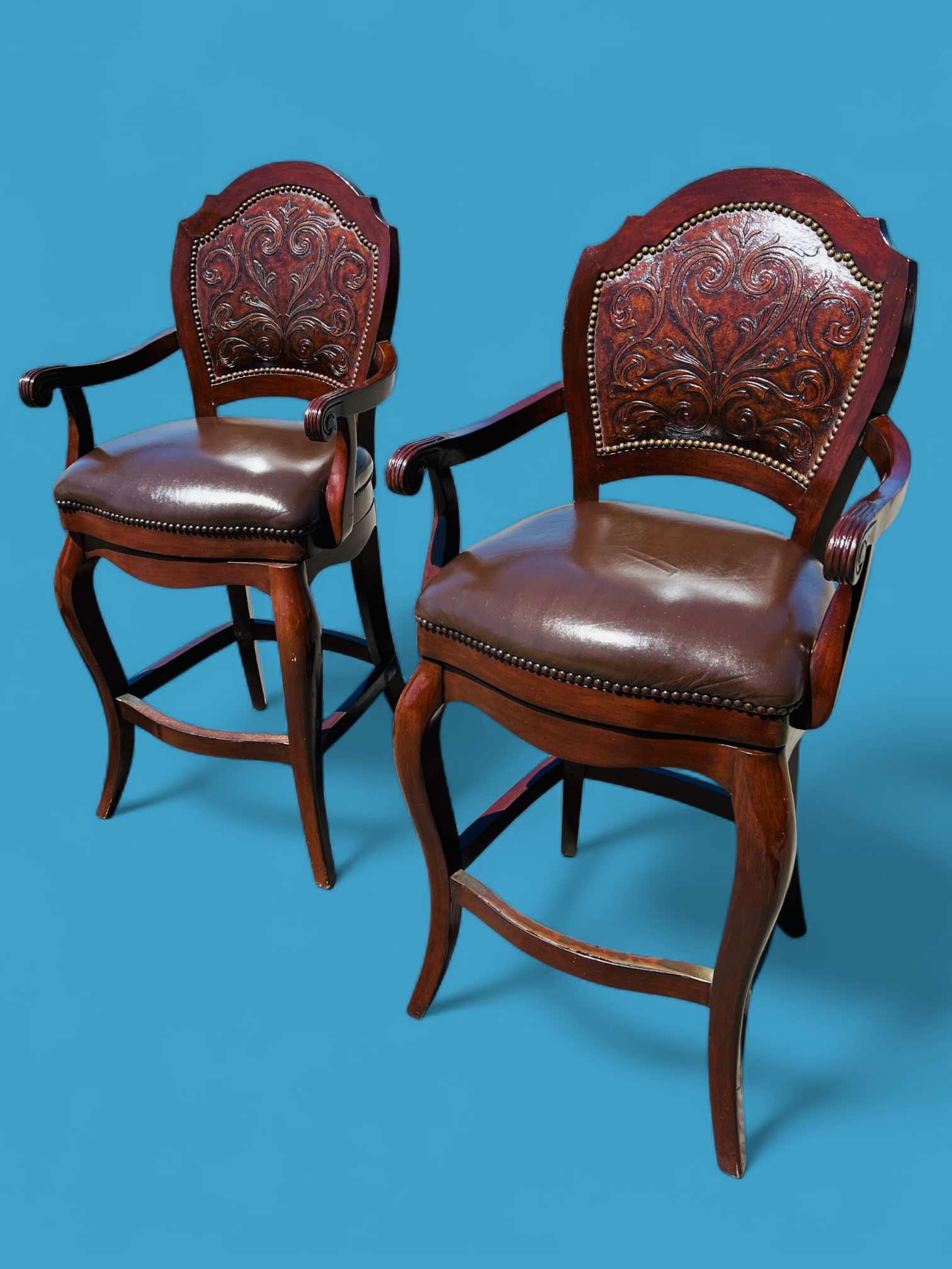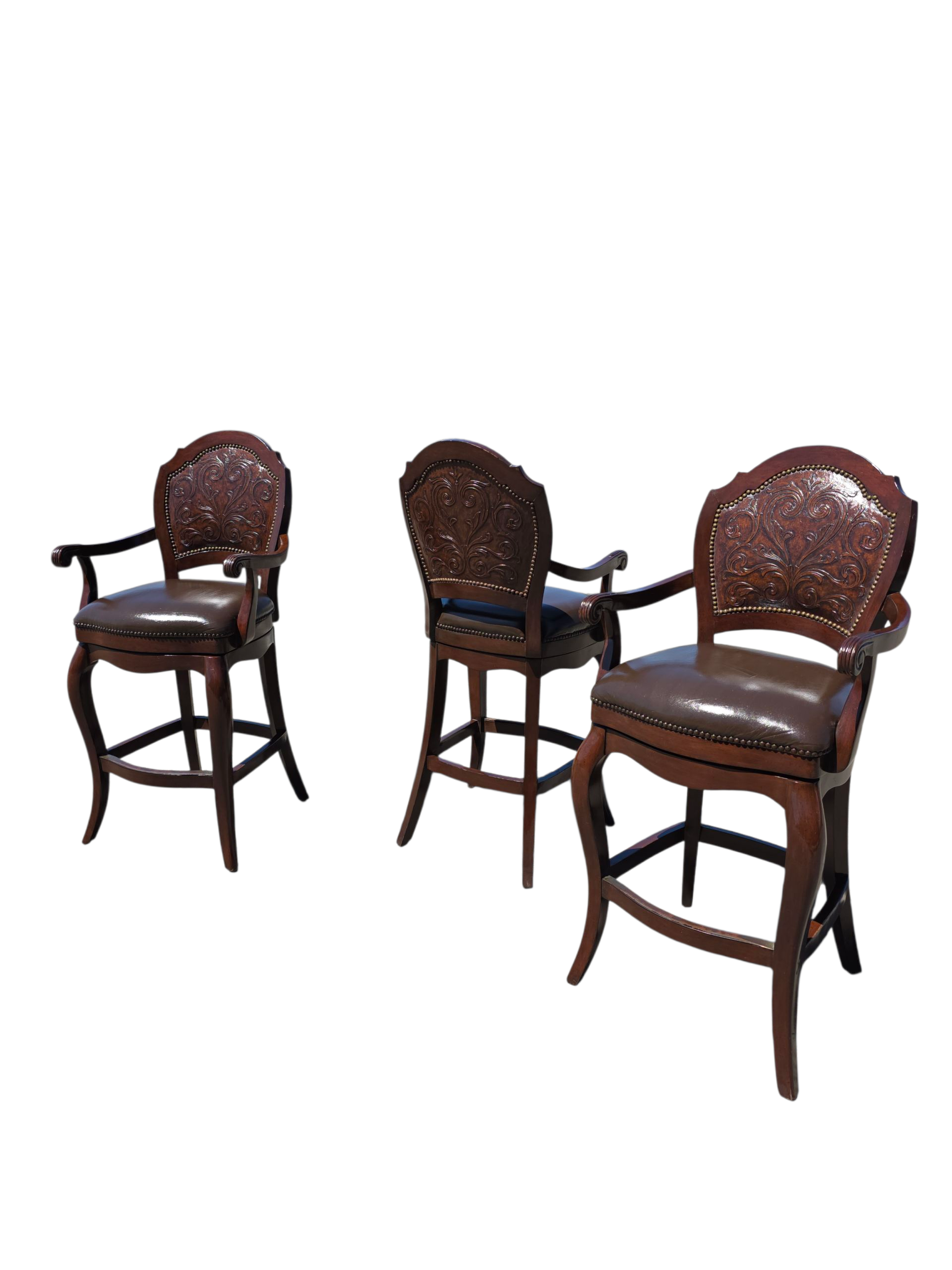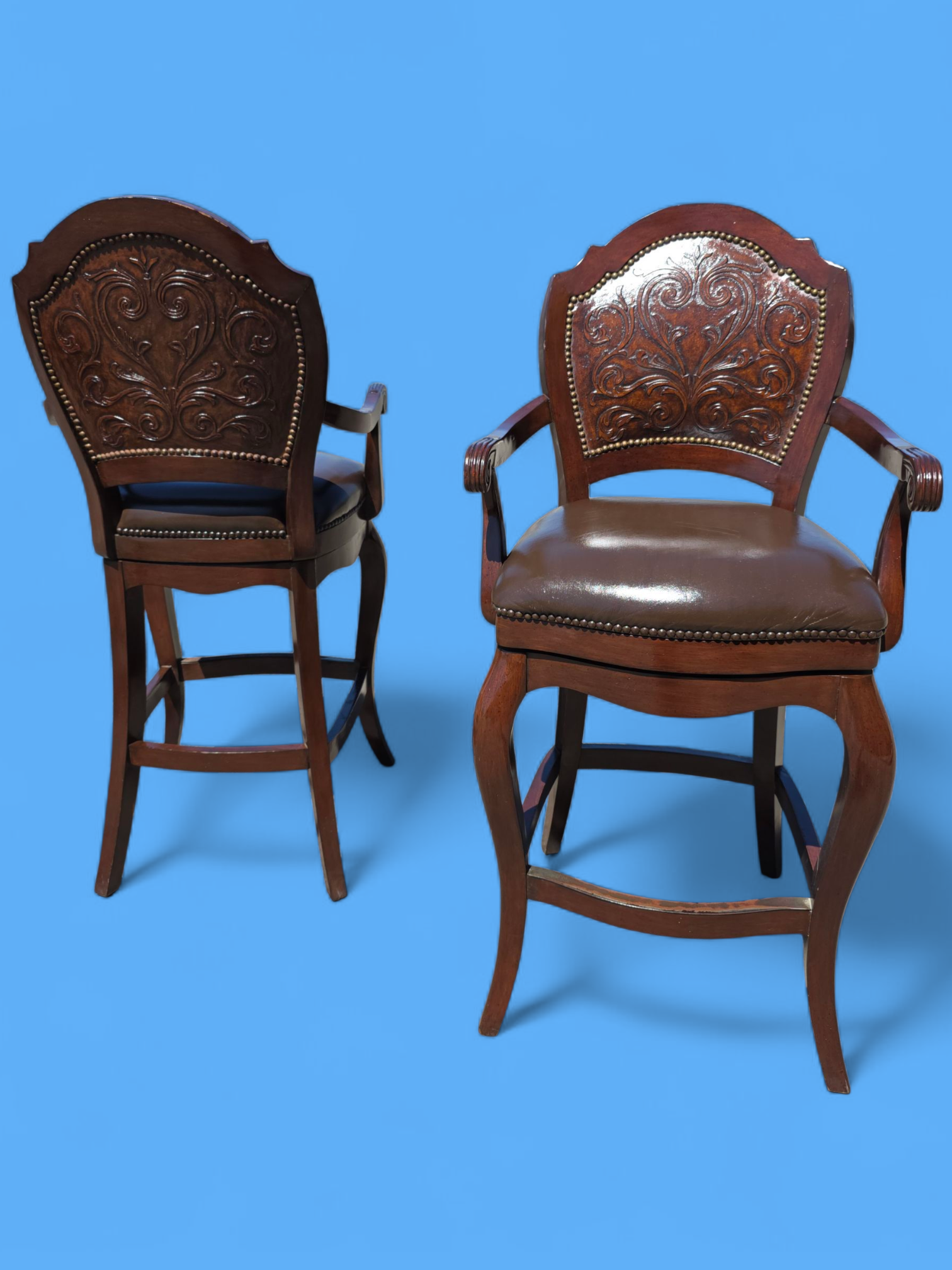 Este majestuoso juego de bancos giratorios representa la fusión perfecta entre funcionalidad moderna y tradición artesanal. Tapizados en piel de alta calidad, cada banco ofrece una textura suave, resistente y visualmente imponente. El respaldo, también revestido en piel, presenta un diseño en repujado meticulosamente trabajado, evocando motivos clásicos que aportan carácter y distinción.
