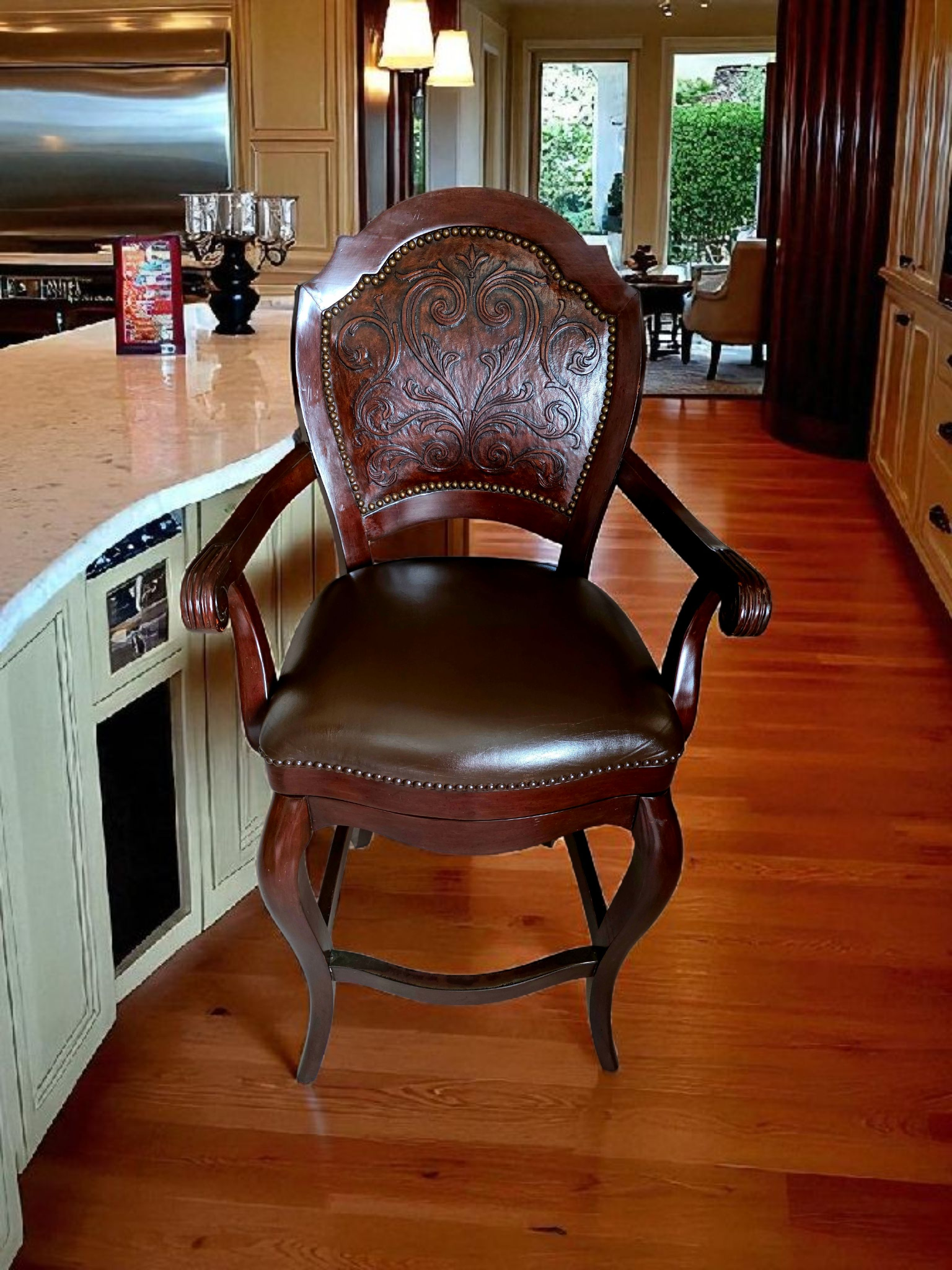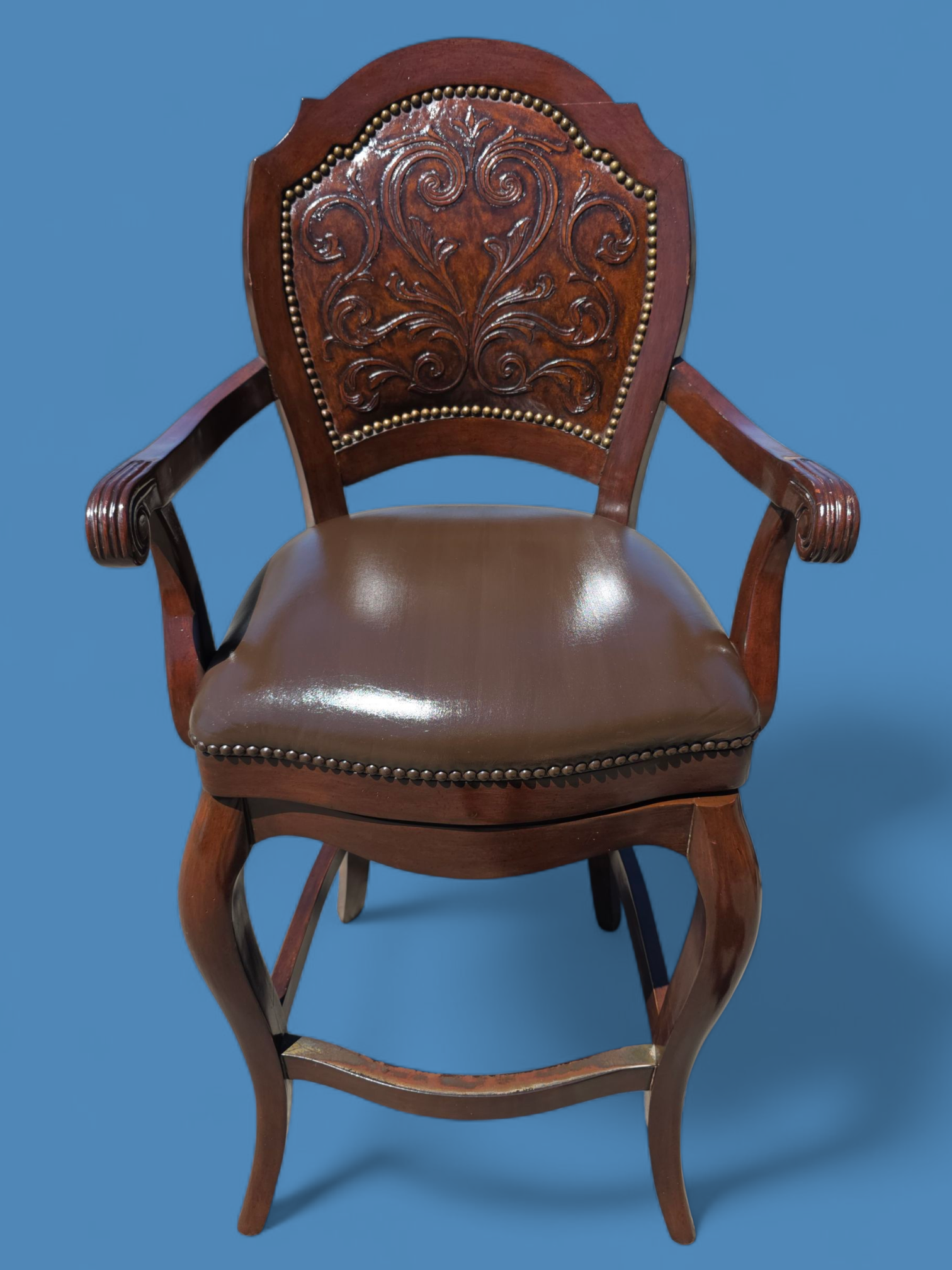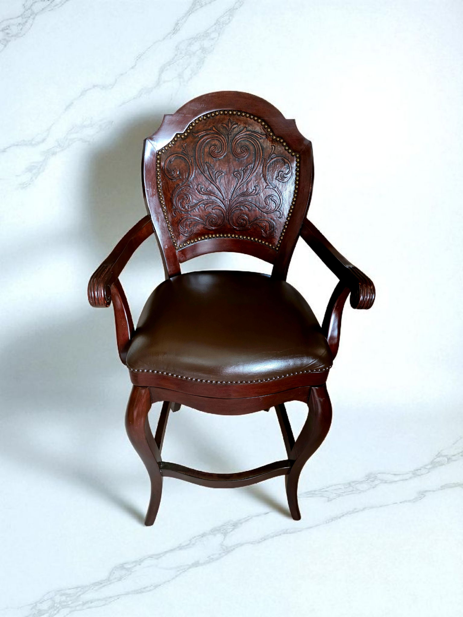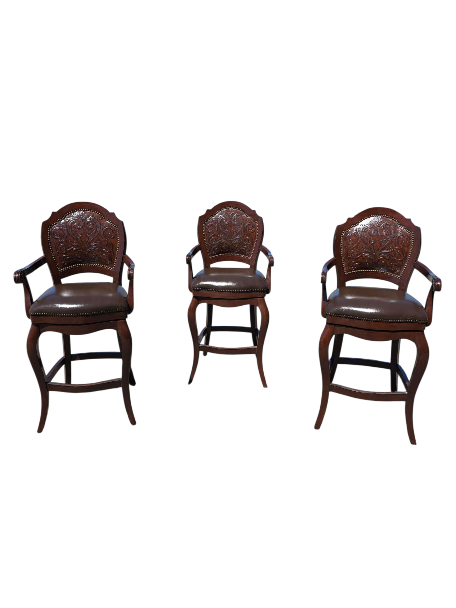Este majestuoso juego de bancos giratorios representa la fusión perfecta entre funcionalidad moderna y tradición artesanal. Tapizados en piel de alta calidad, cada banco ofrece una textura suave, resistente y visualmente imponente. El respaldo, también revestido en piel, presenta un diseño en repujado meticulosamente trabajado, evocando motivos clásicos que aportan carácter y distinción.