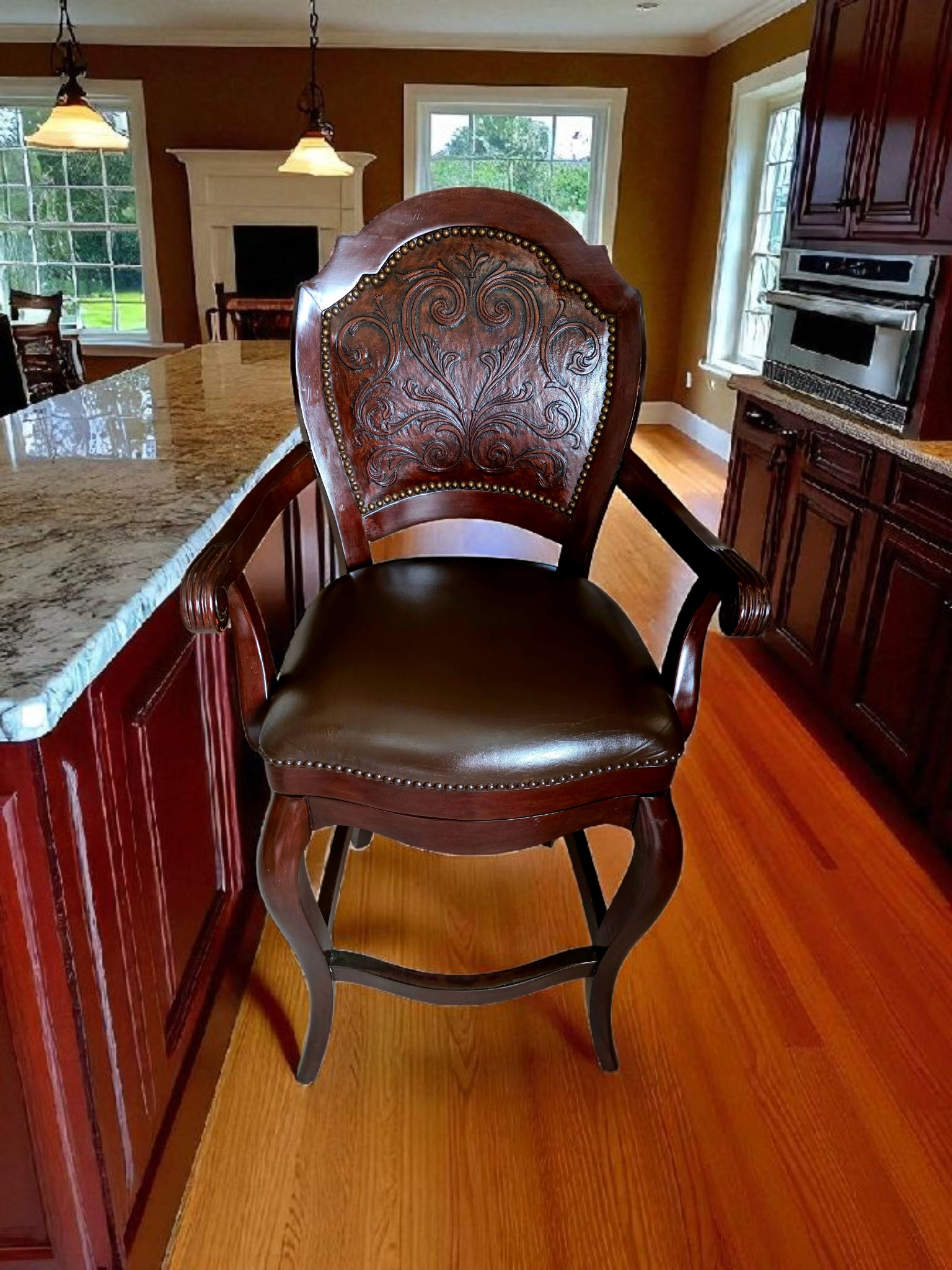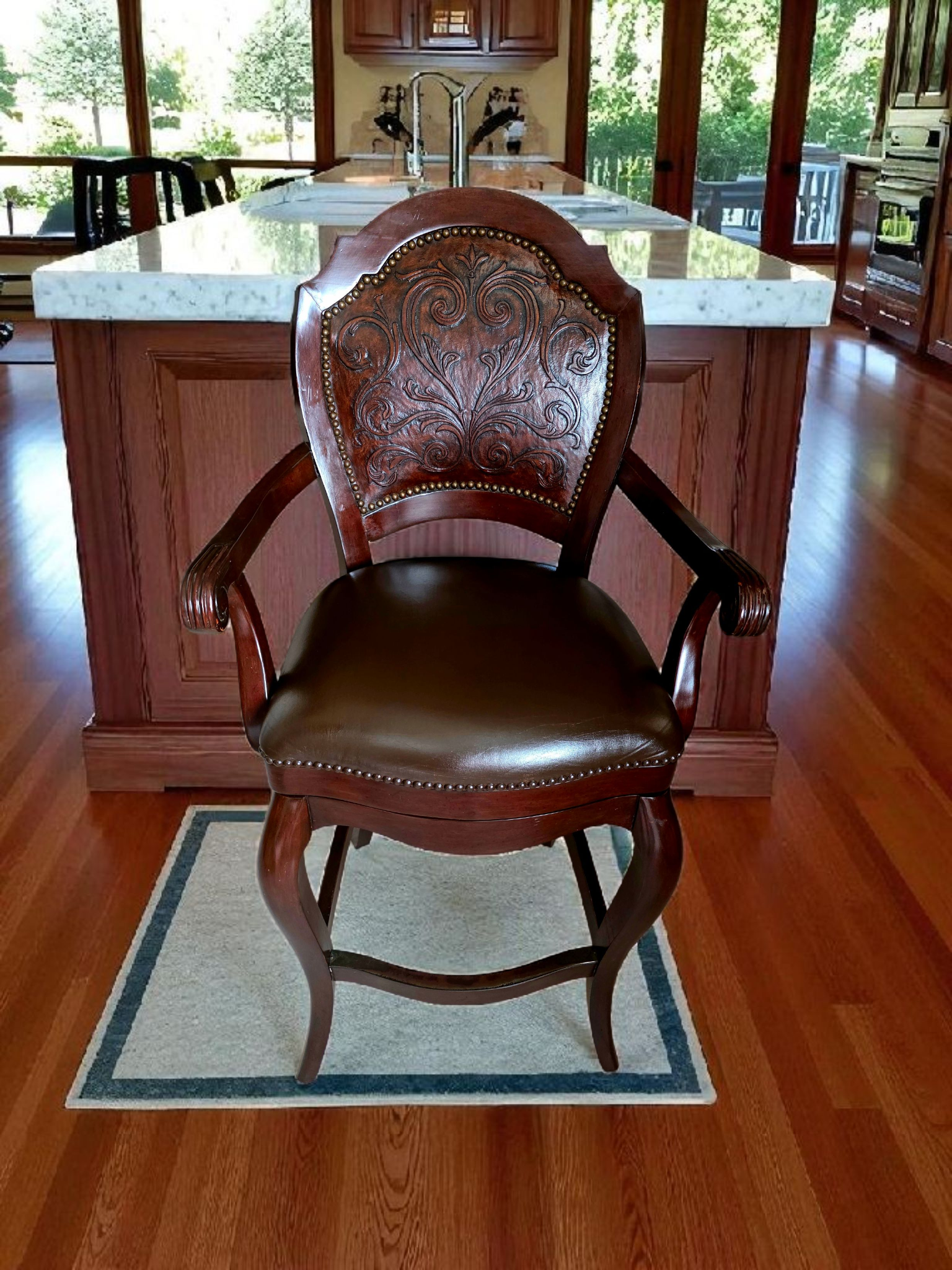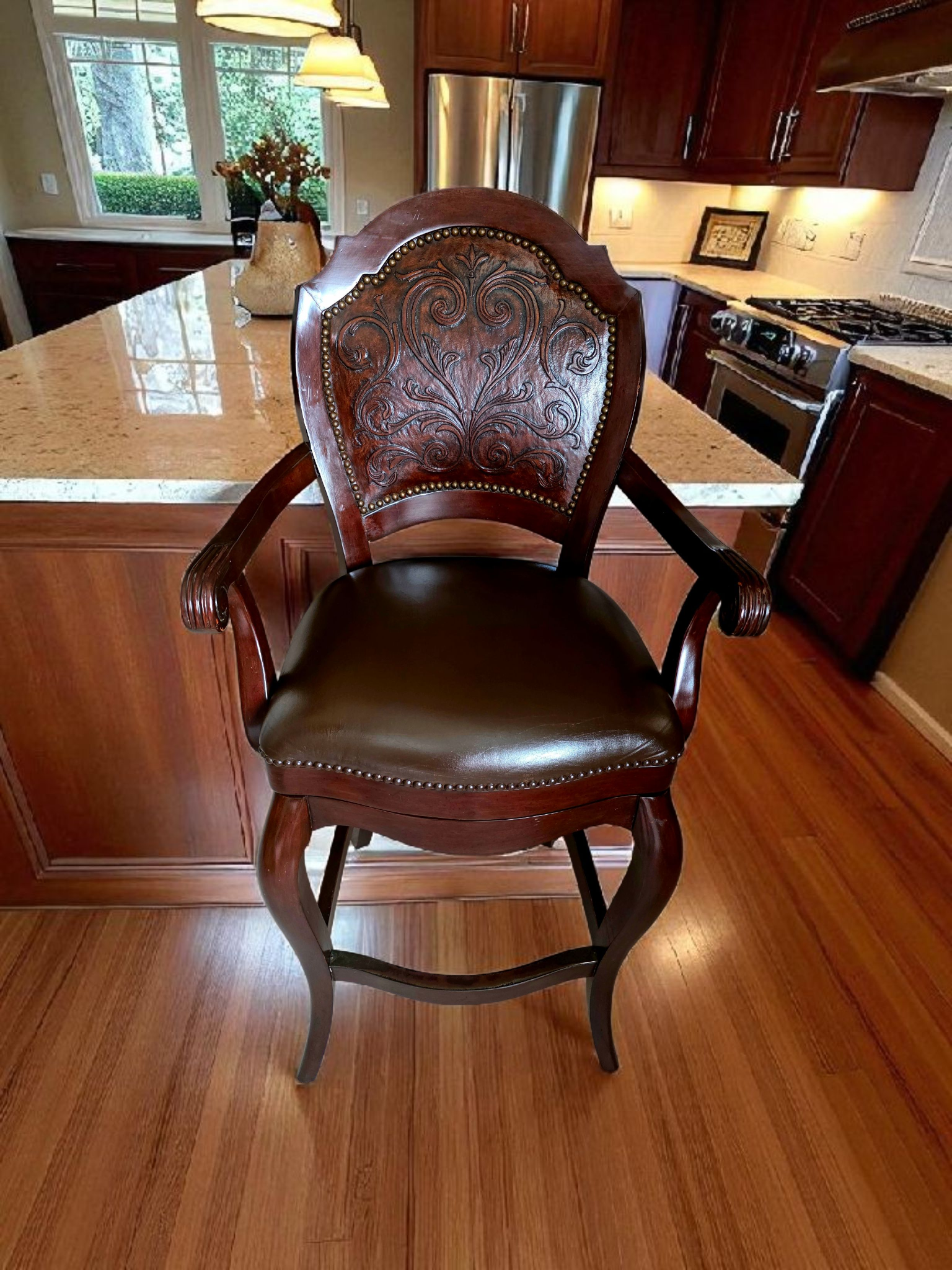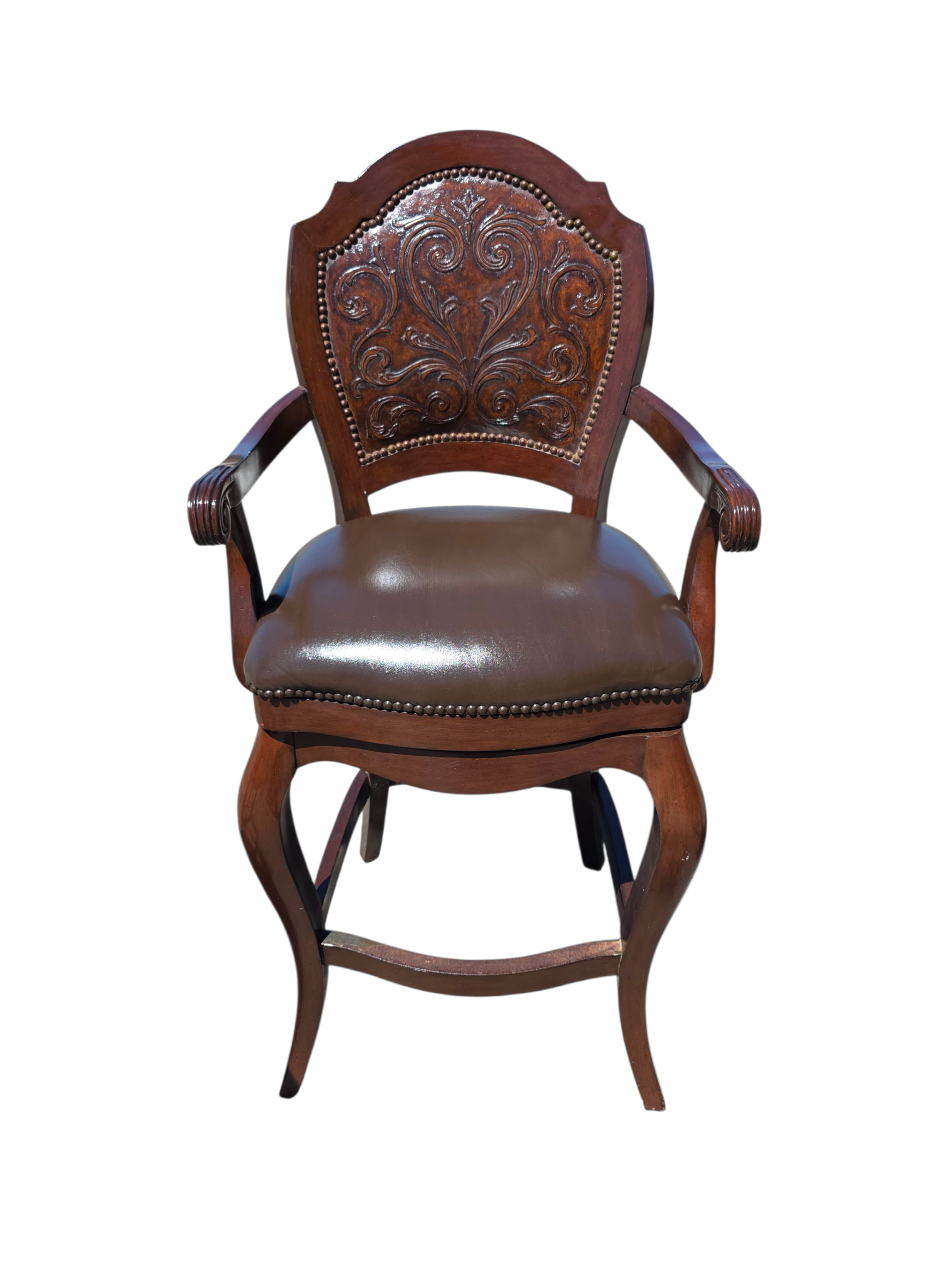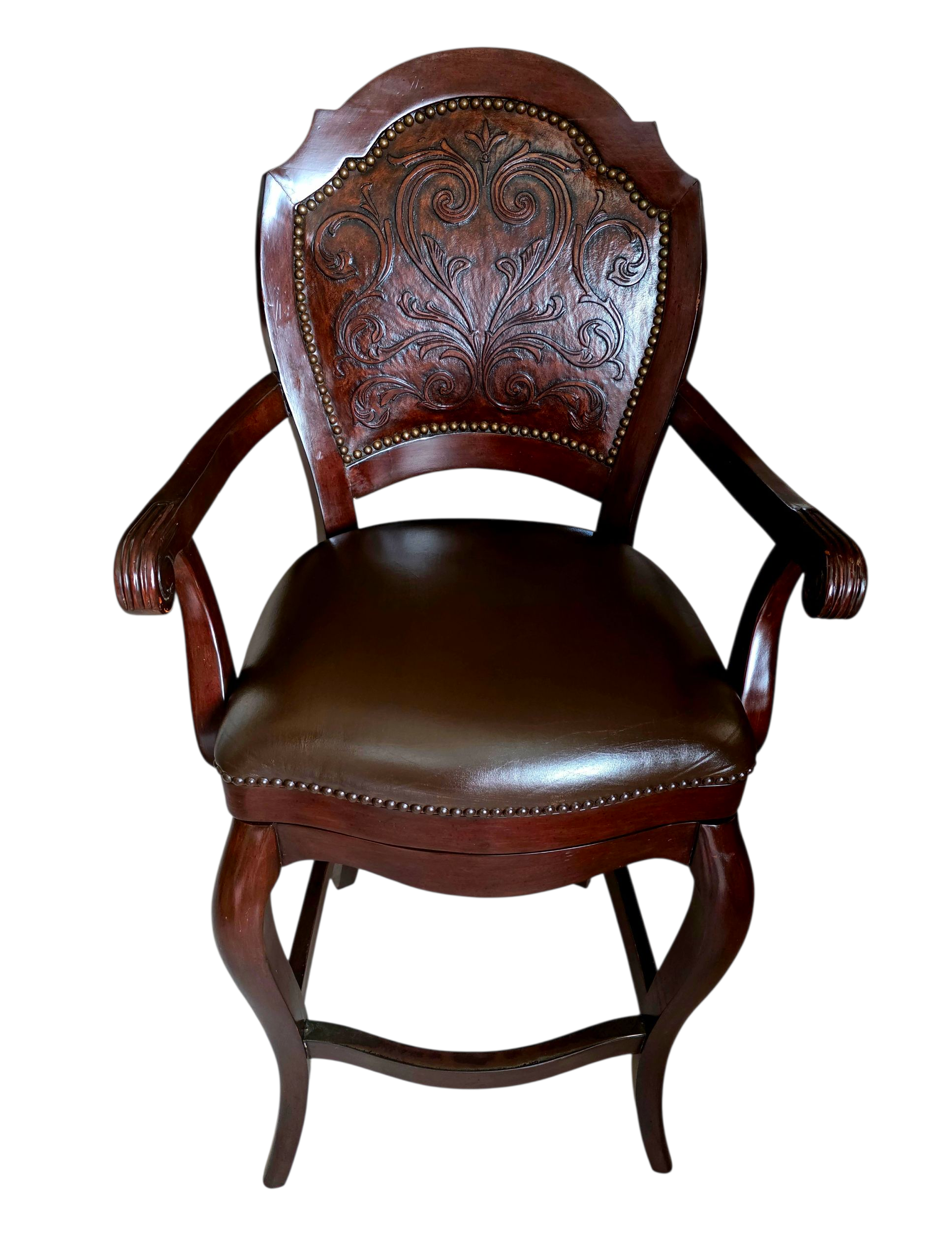 Este majestuoso juego de bancos giratorios representa la fusión perfecta entre funcionalidad moderna y tradición artesanal. Tapizados en piel de alta calidad, cada banco ofrece una textura suave, resistente y visualmente imponente. El respaldo, también revestido en piel, presenta un diseño en repujado meticulosamente trabajado, evocando motivos clásicos que aportan carácter y distinción.