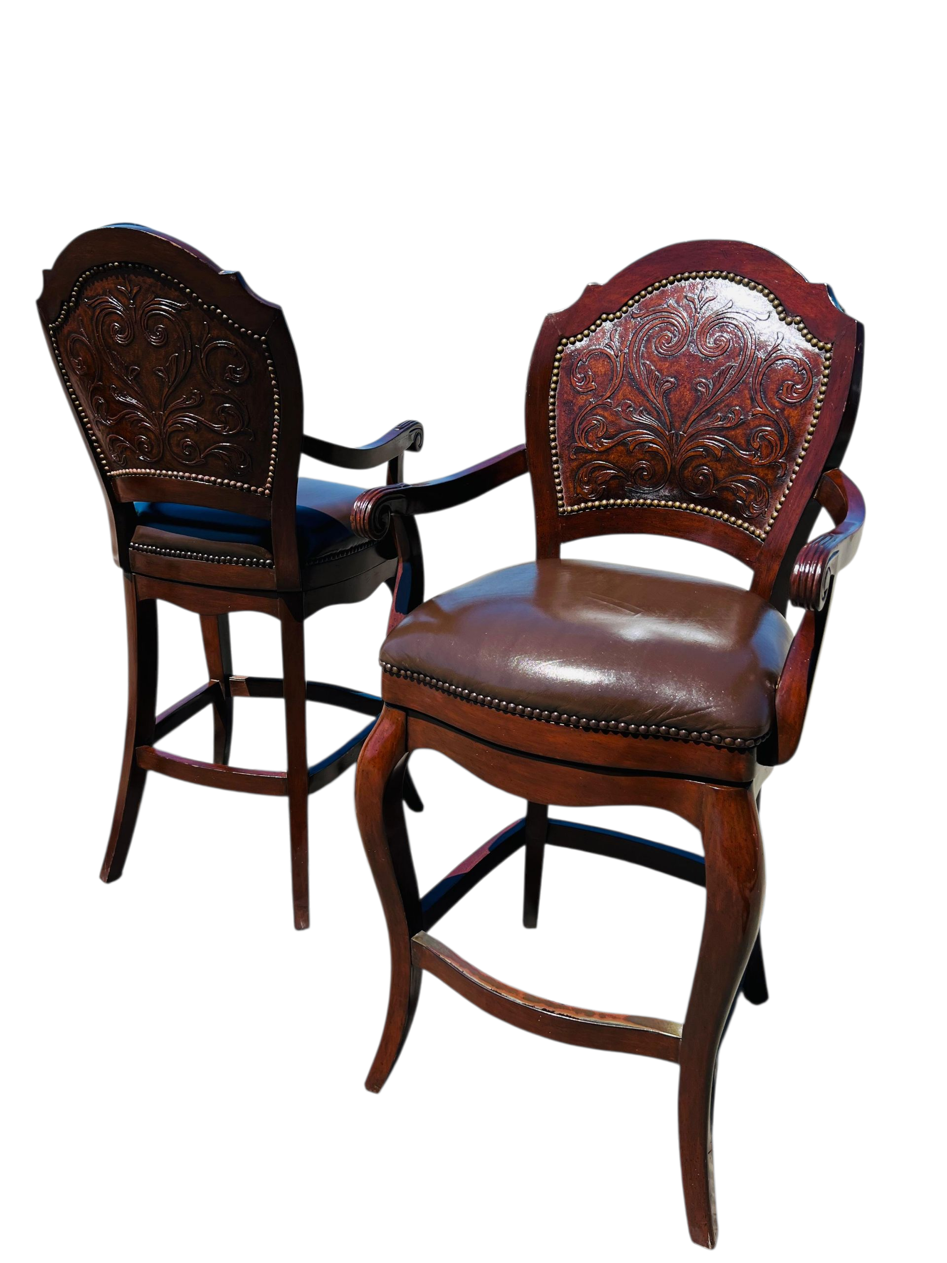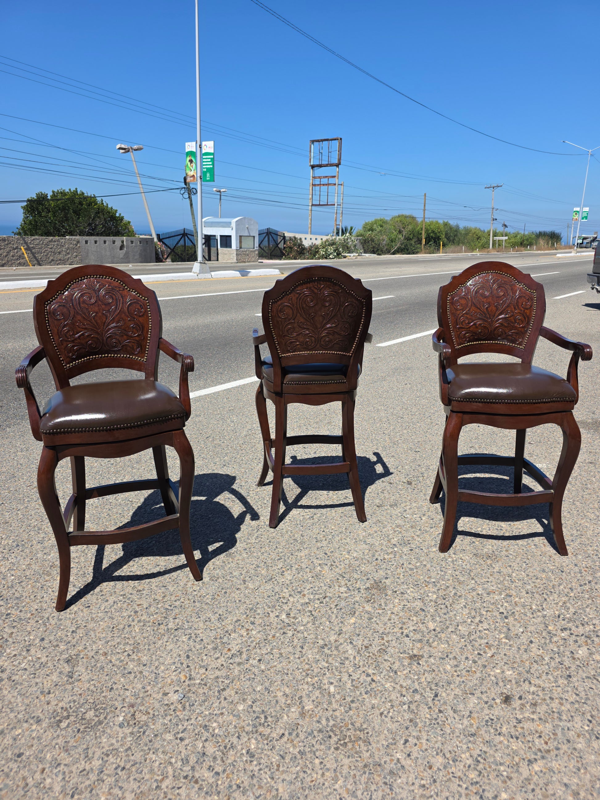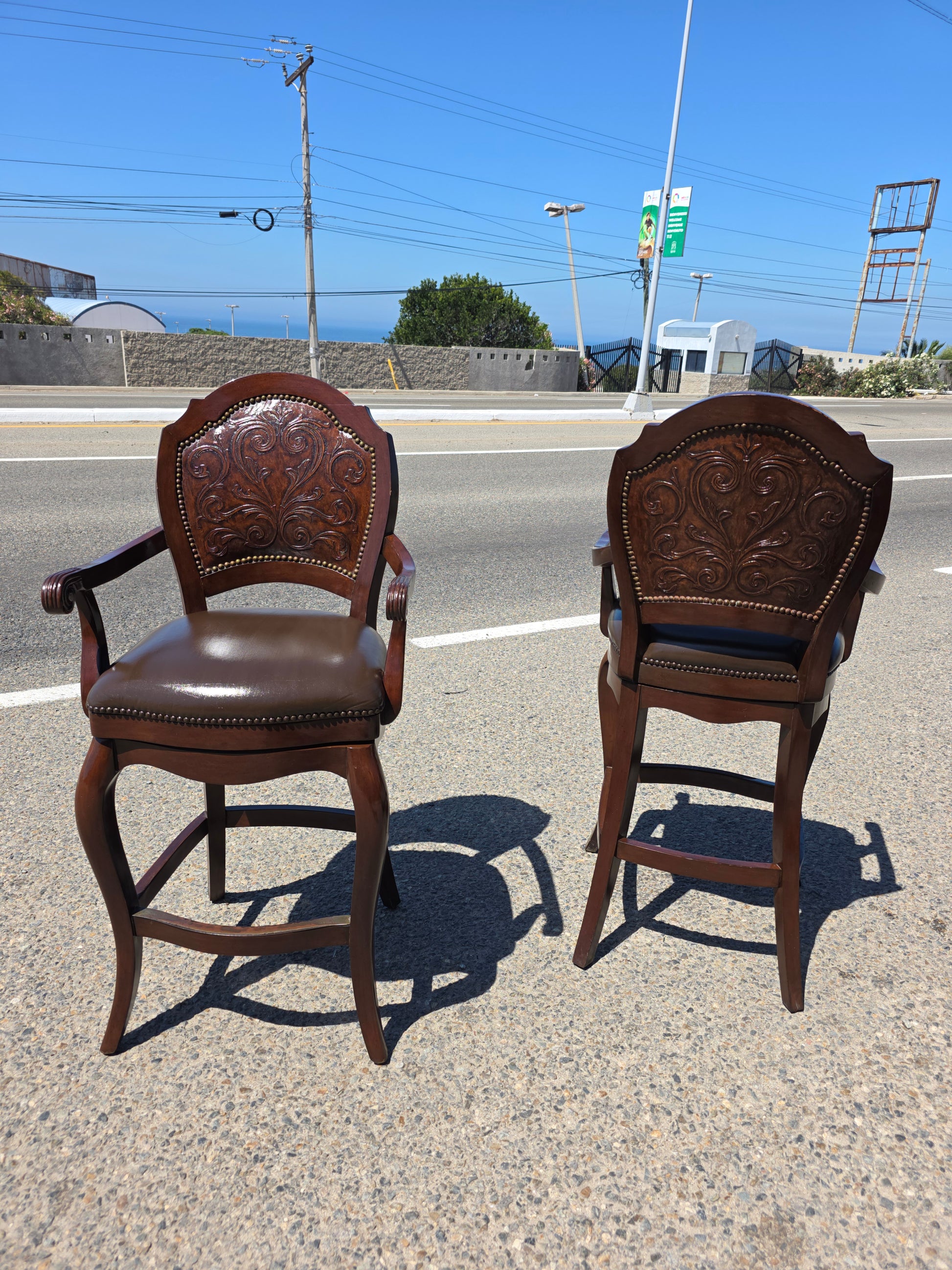 🪑🪑🪑 Juego de Bancos Giratorios en Piel Repujada – Elegancia Artesanal con Mecanismo Retráctil🪑🪑🪑