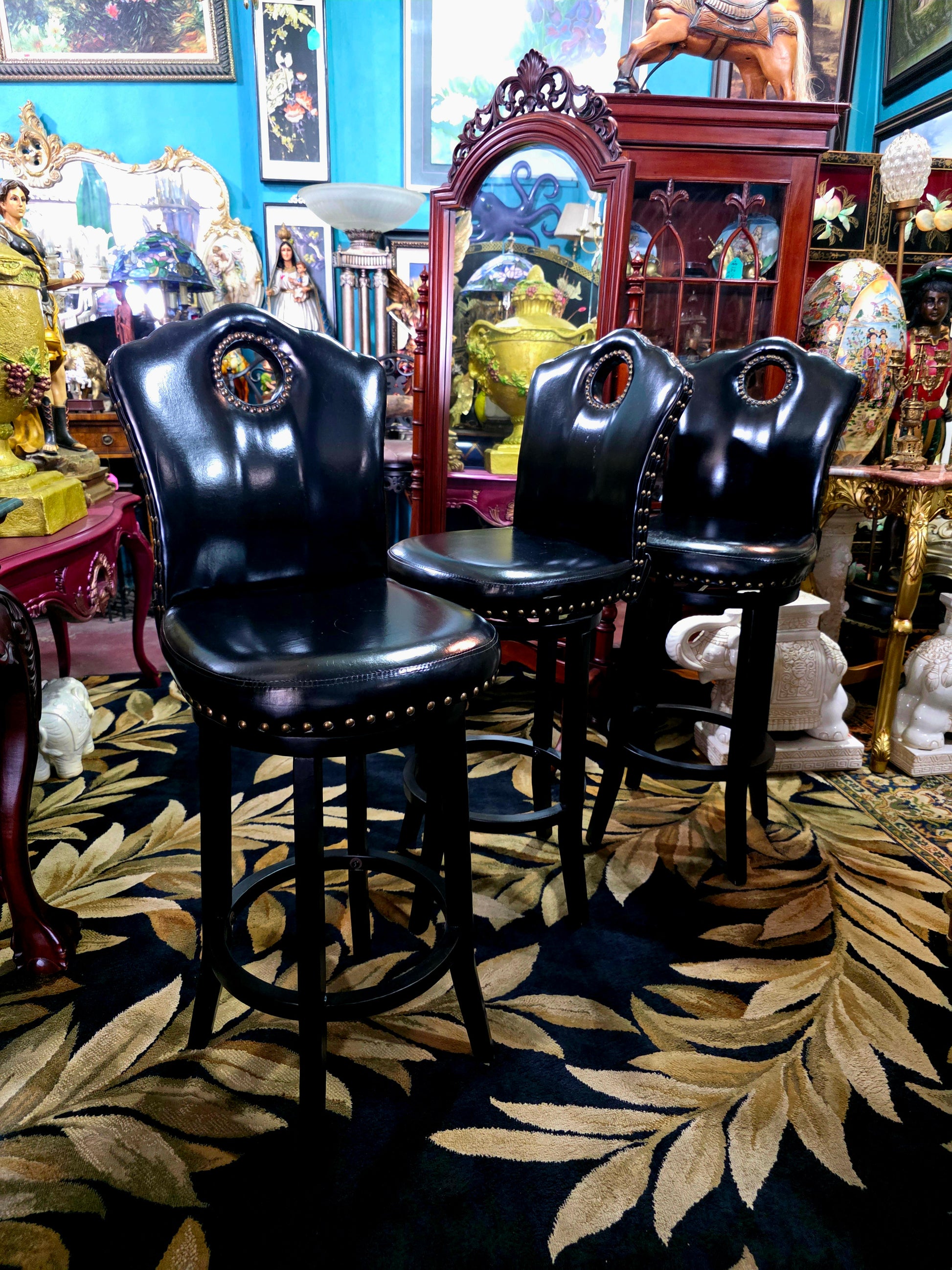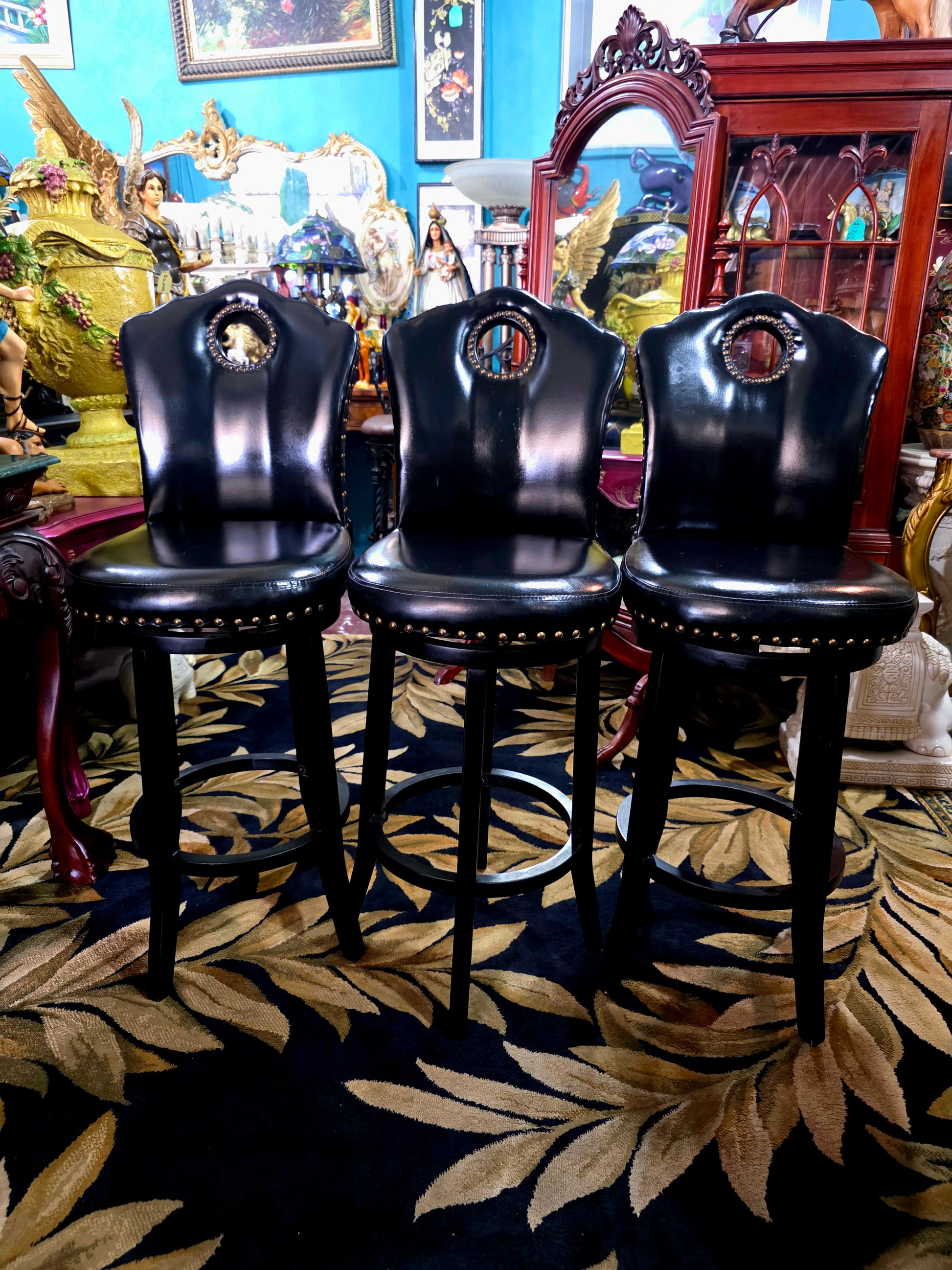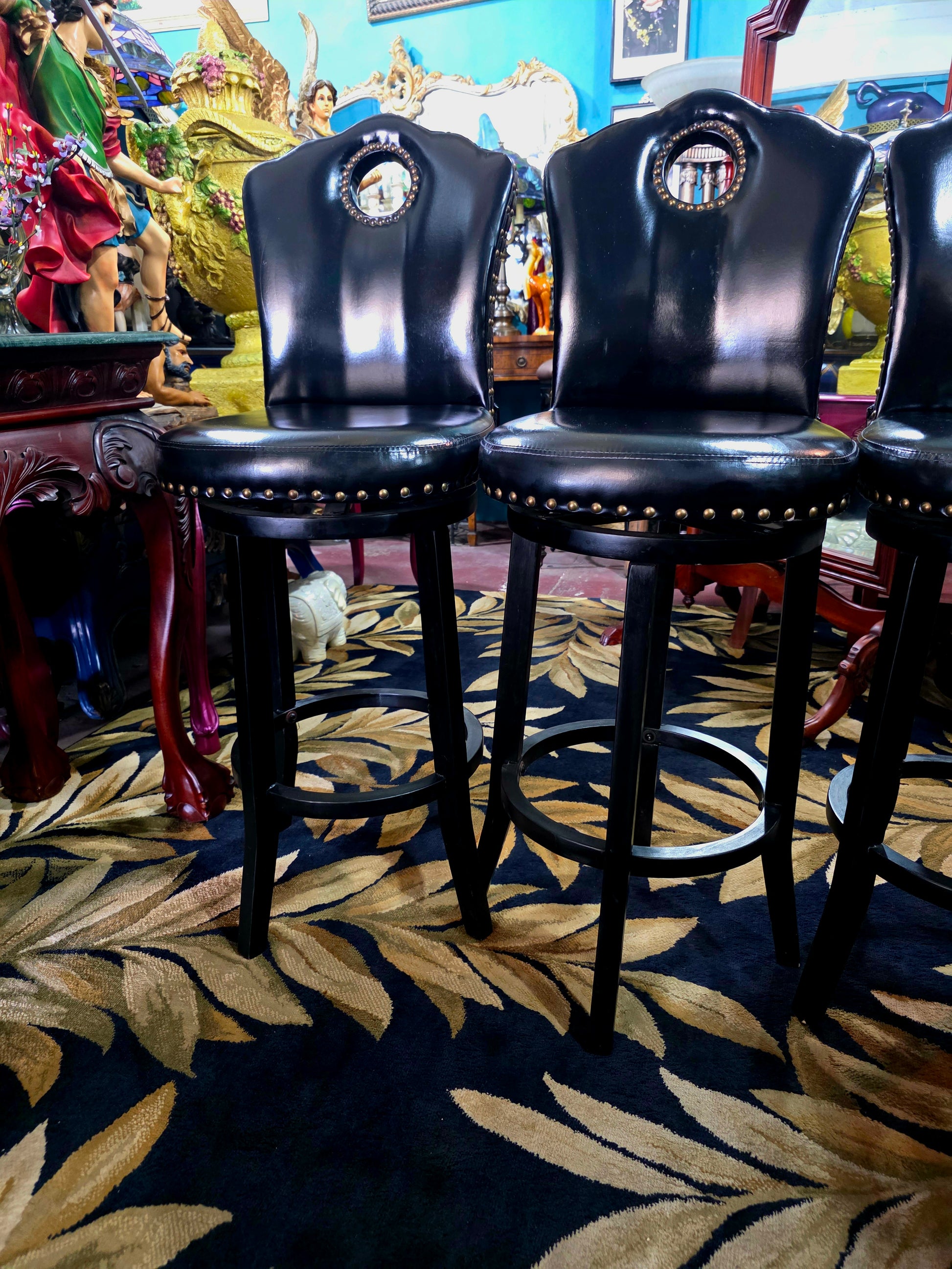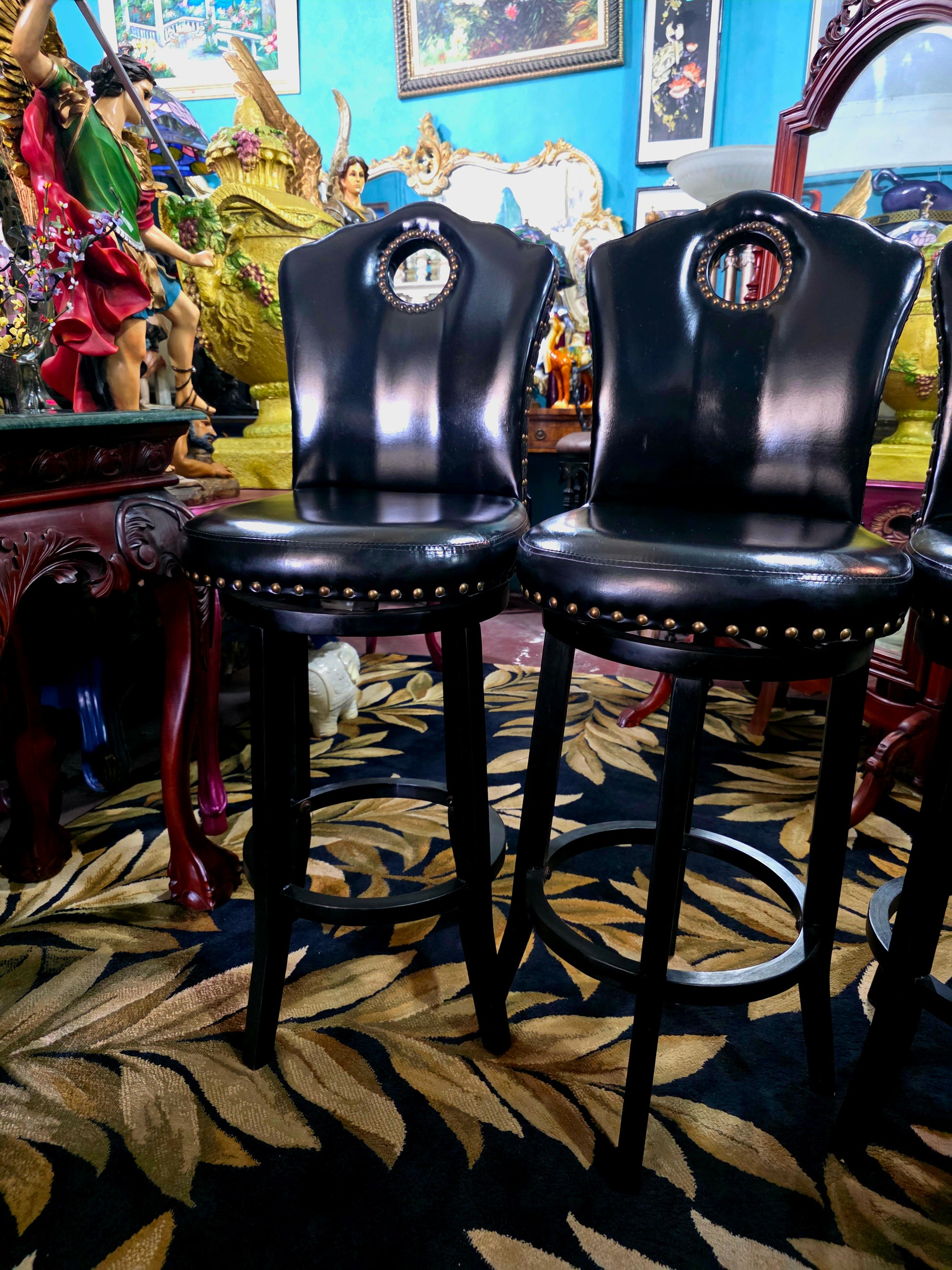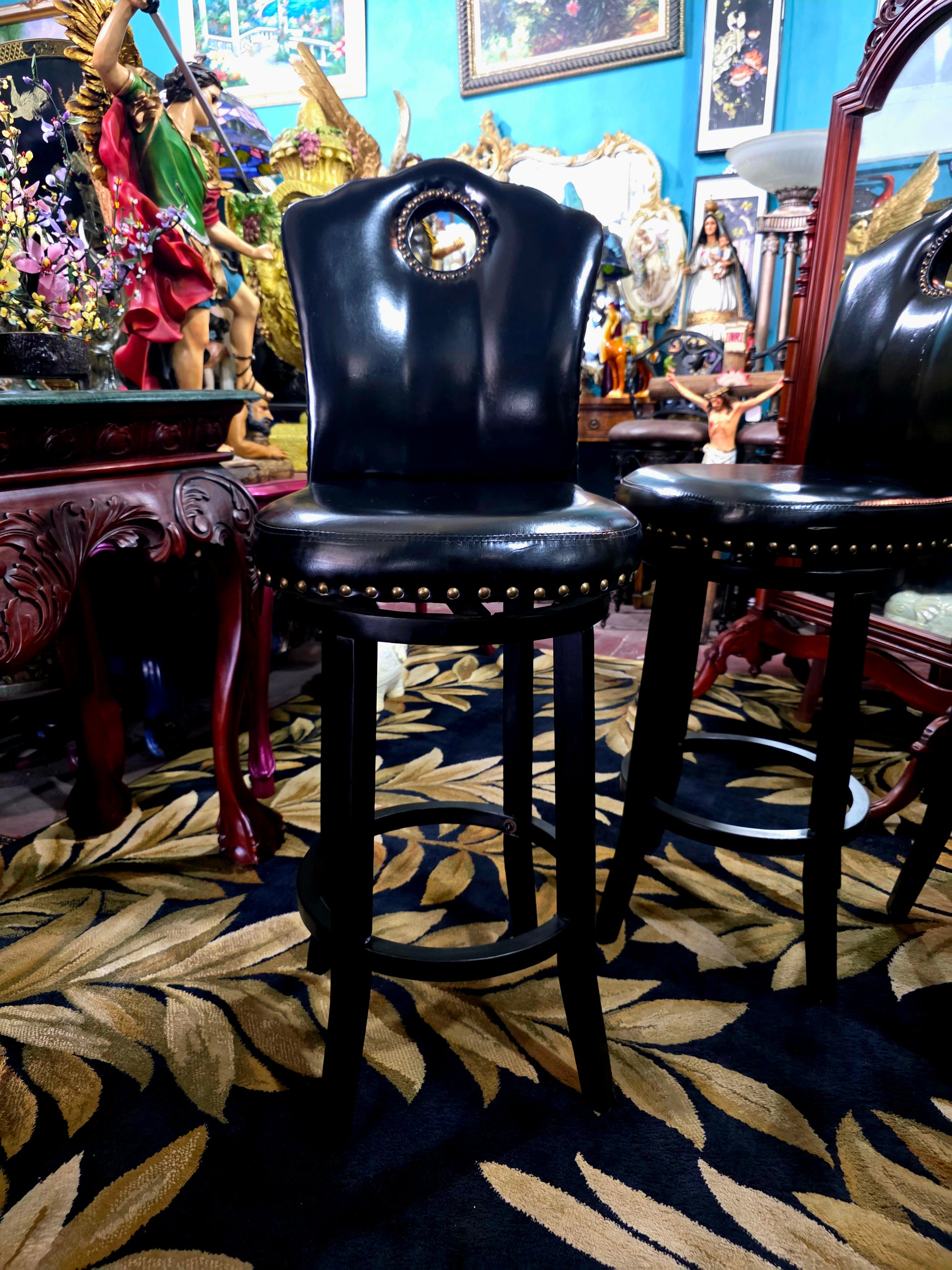 Este distinguido juego de bancos giratorios combina comodidad, diseño y presencia. Tapizados en vinipiel de alta calidad en tono negro profundo, cada pieza ofrece una textura suave al tacto y una resistencia ideal para uso cotidiano. Su respaldo alto, con corte circular decorativo, aporta un toque contemporáneo que dialoga con la estética clásica de su estructura.