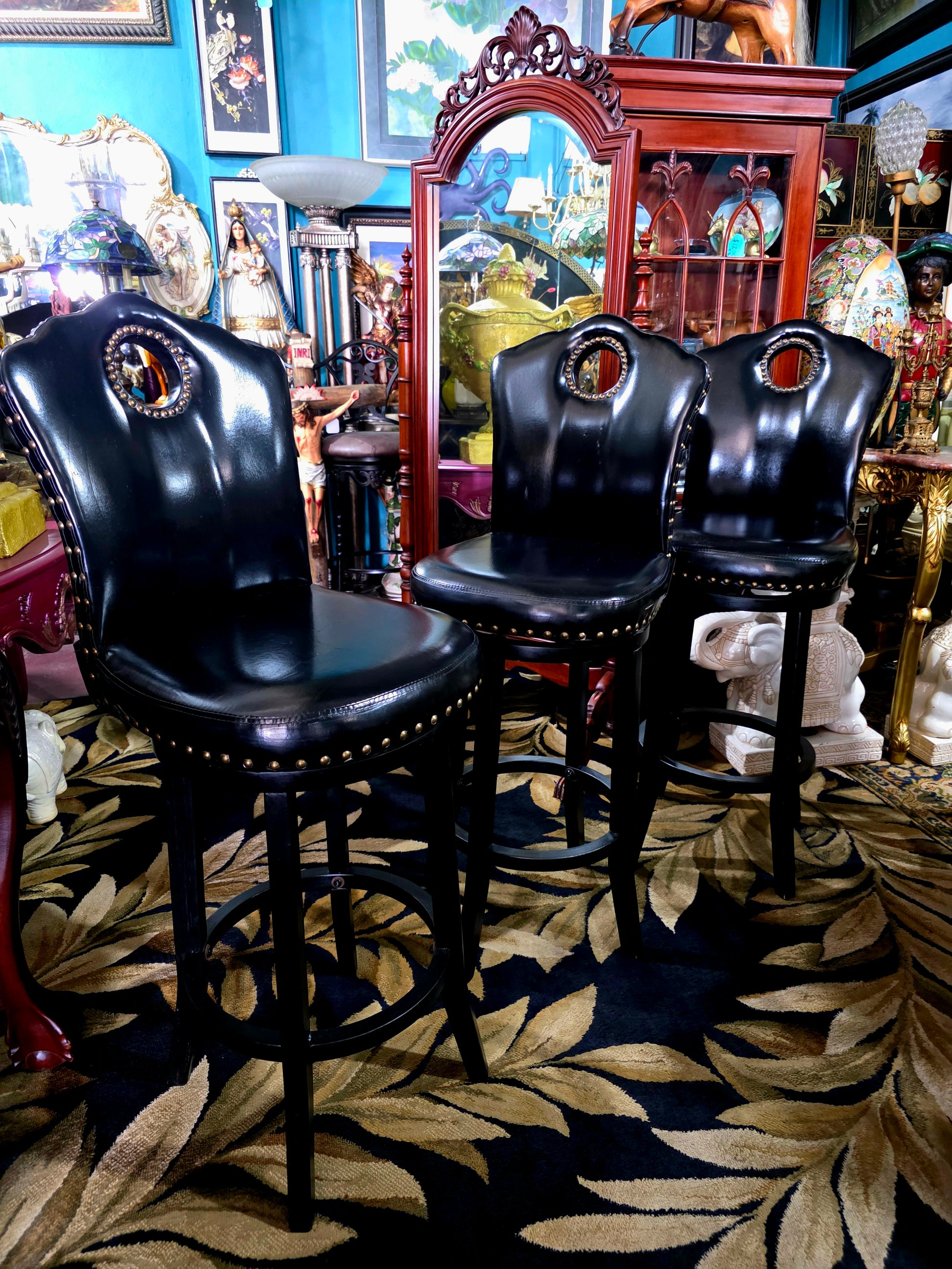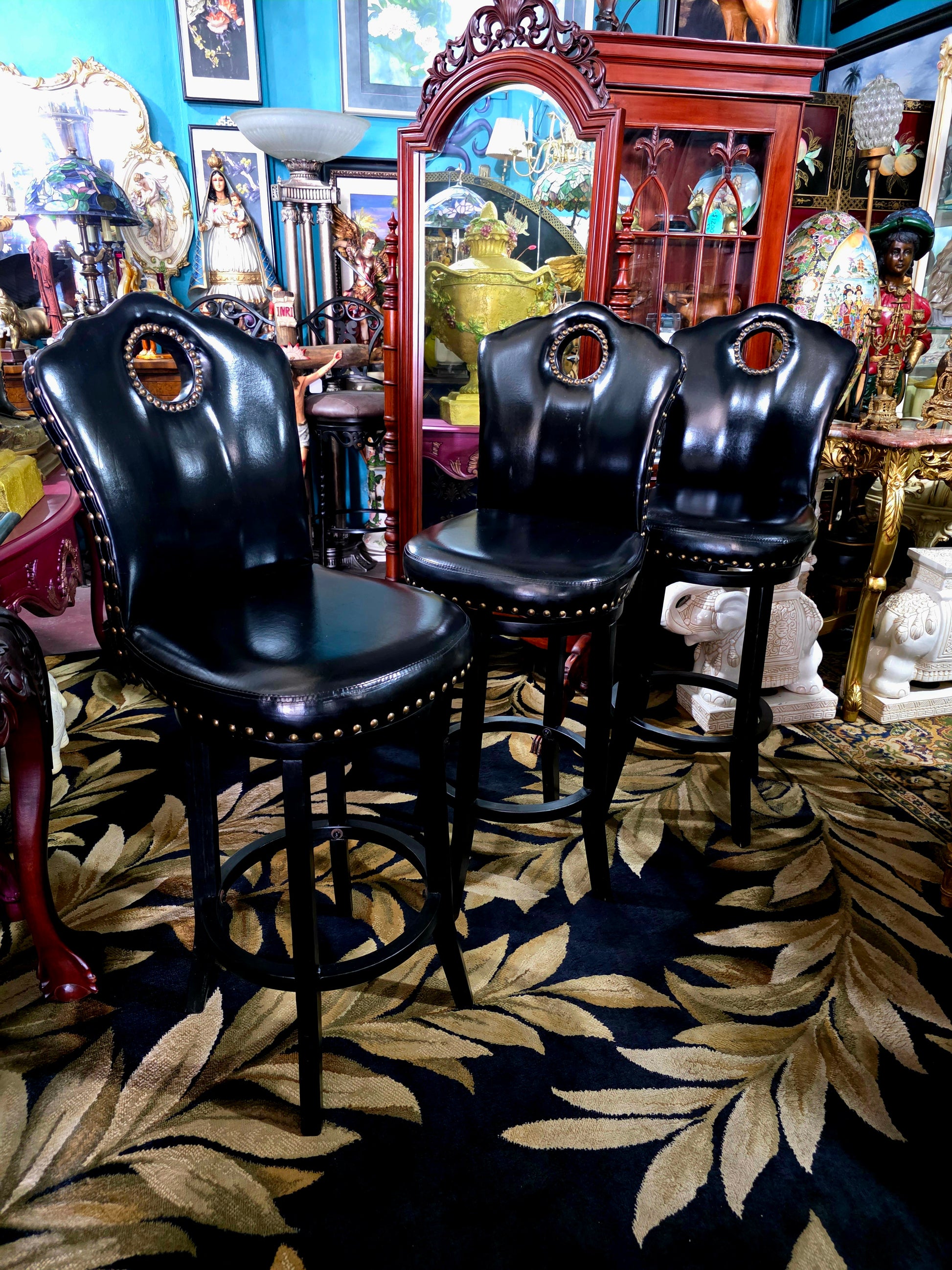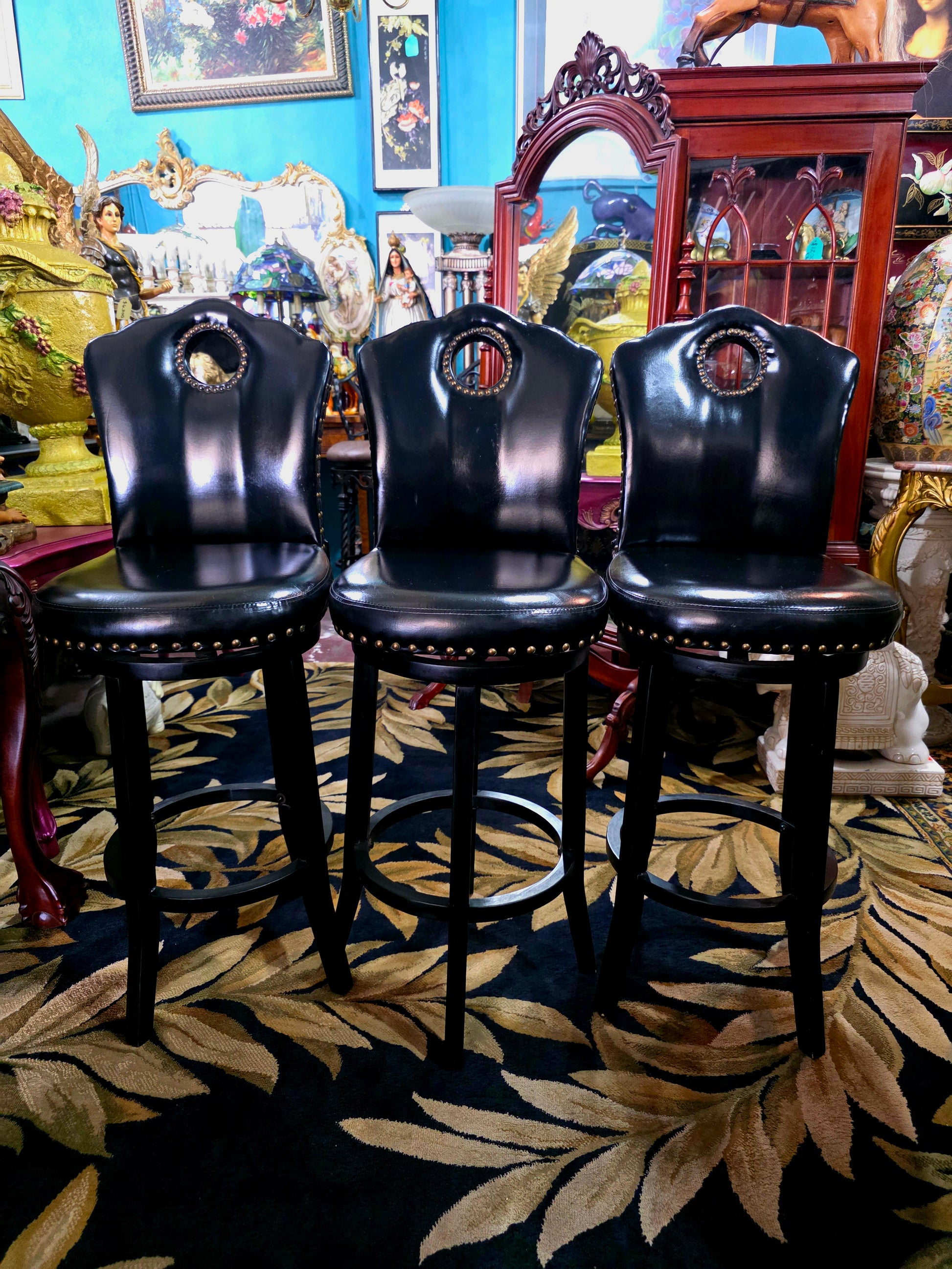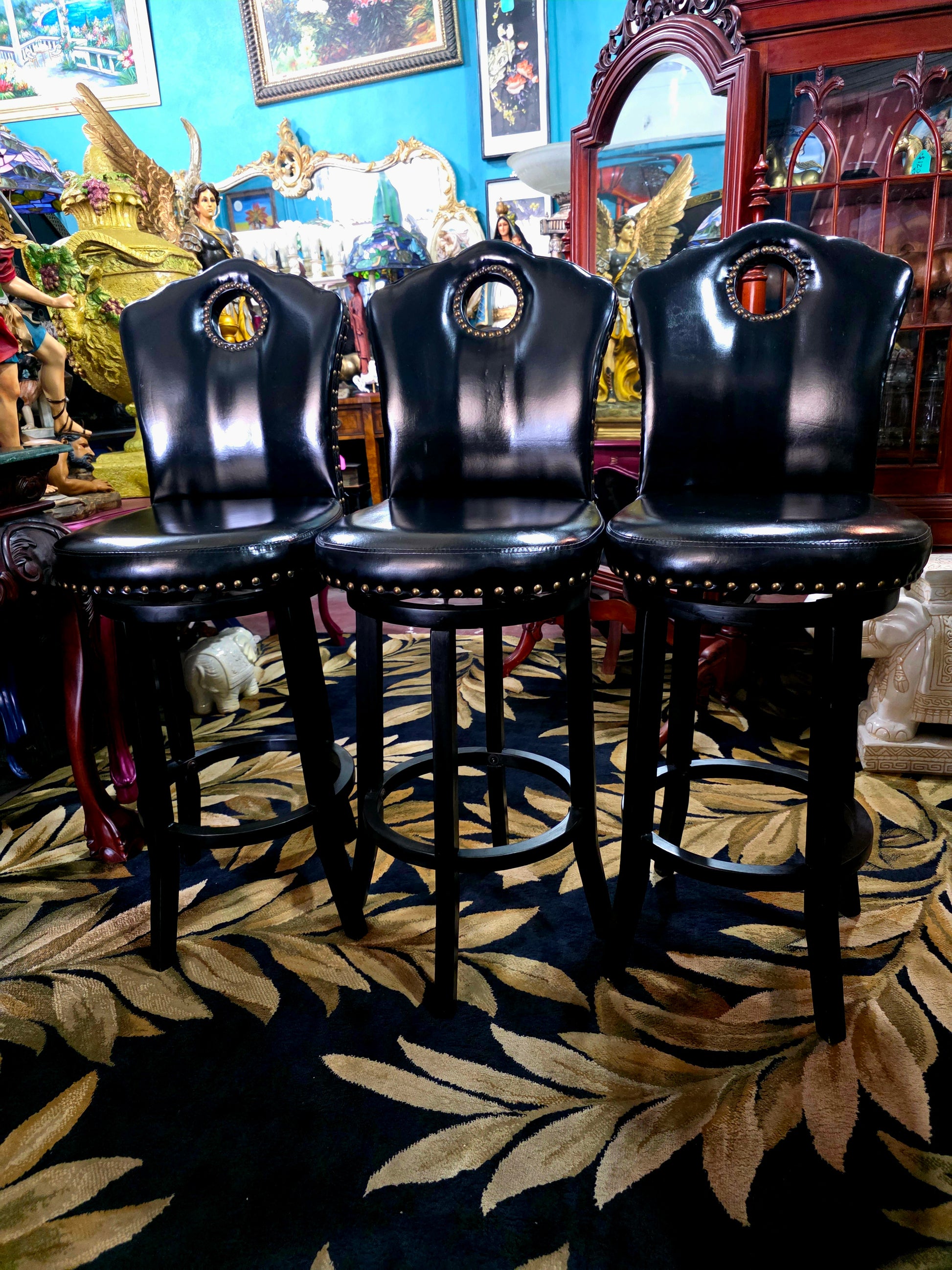 Este distinguido juego de bancos giratorios combina comodidad, diseño y presencia. Tapizados en vinipiel de alta calidad en tono negro profundo, cada pieza ofrece una textura suave al tacto y una resistencia ideal para uso cotidiano. Su respaldo alto, con corte circular decorativo, aporta un toque contemporáneo que dialoga con la estética clásica de su estructura.