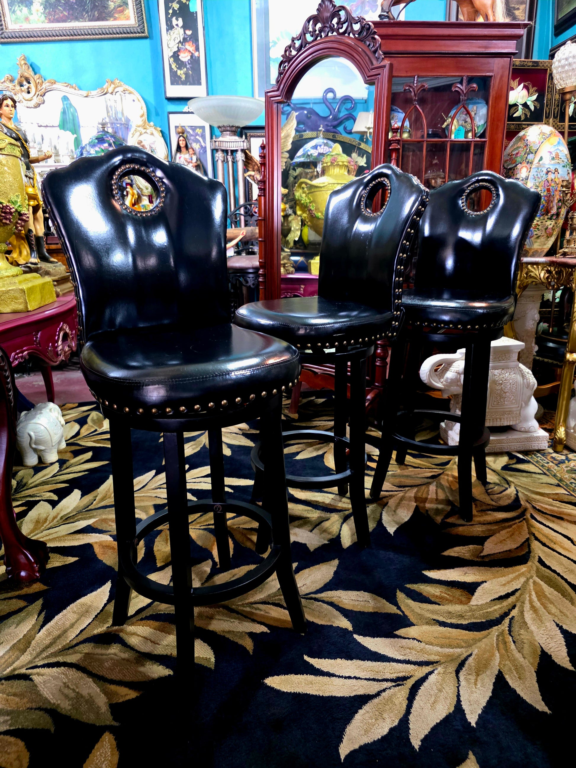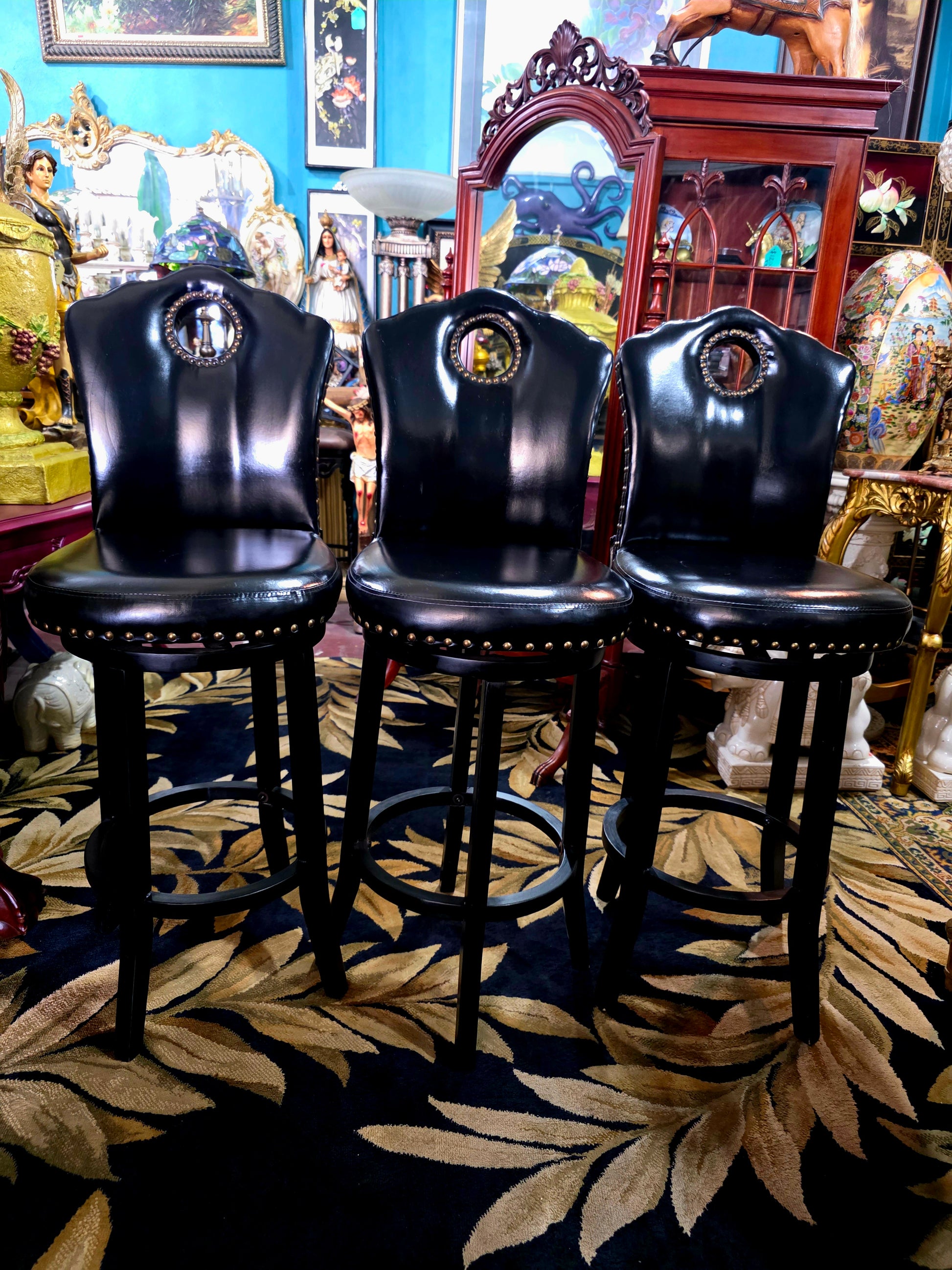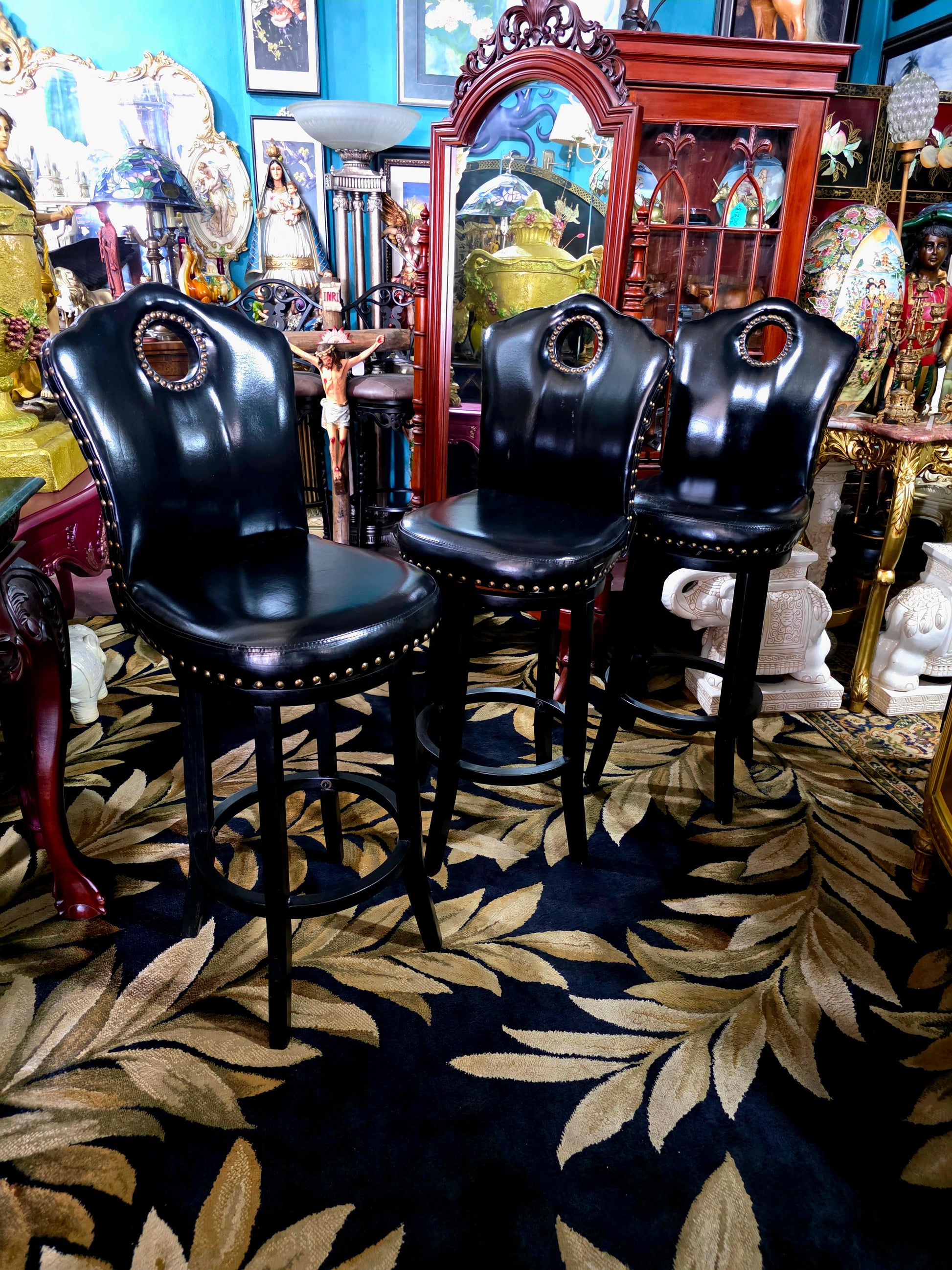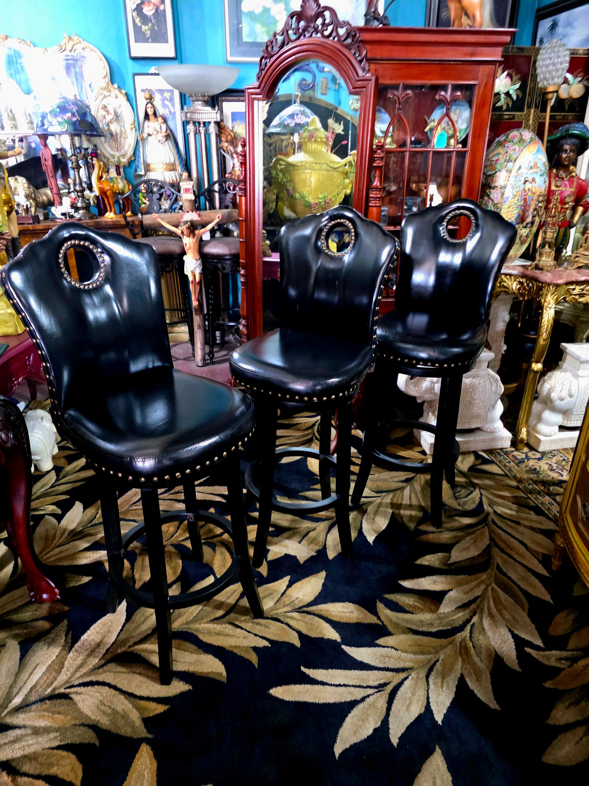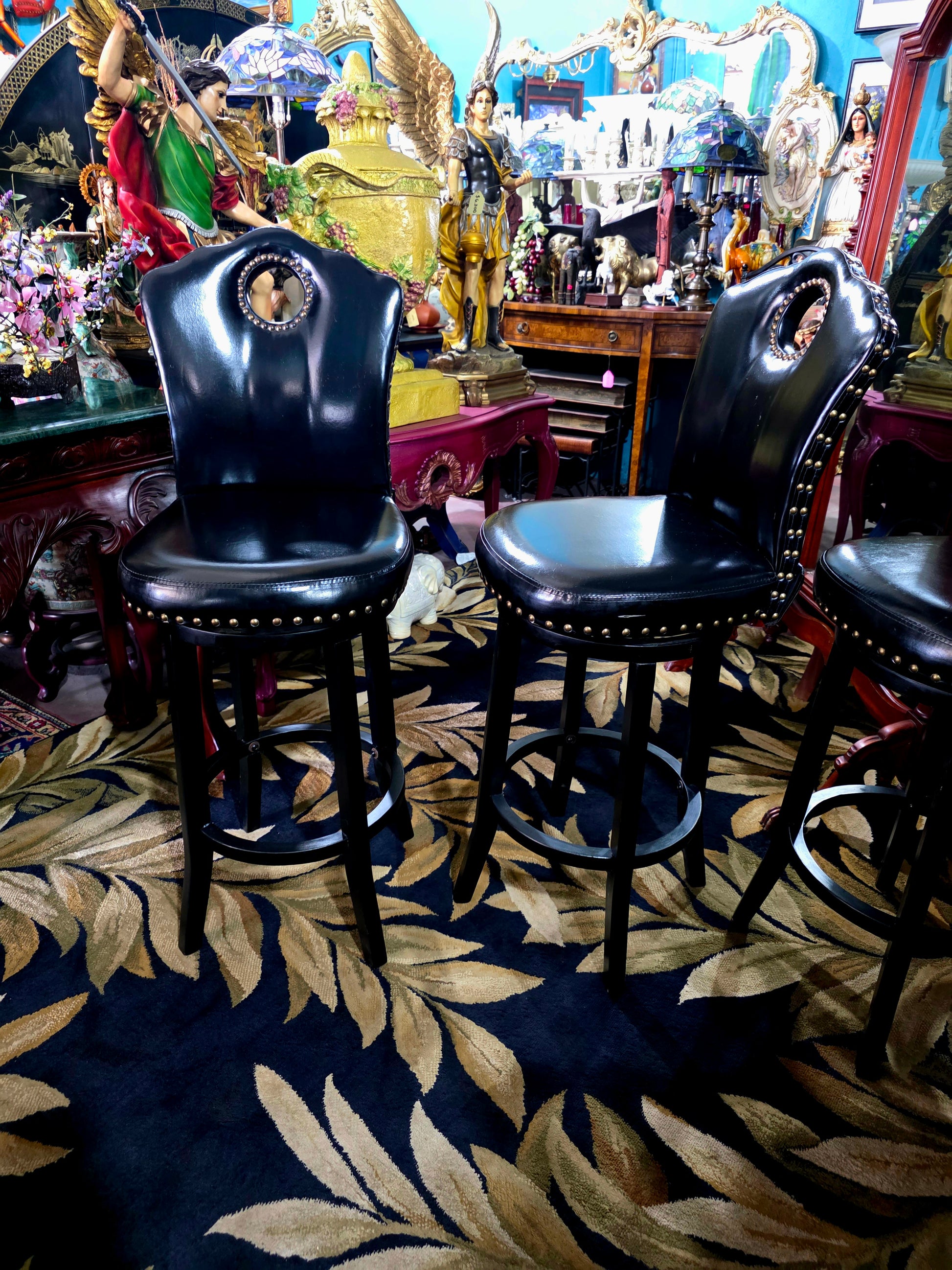 Este distinguido juego de bancos giratorios combina comodidad, diseño y presencia. Tapizados en vinipiel de alta calidad en tono negro profundo, cada pieza ofrece una textura suave al tacto y una resistencia ideal para uso cotidiano. Su respaldo alto, con corte circular decorativo, aporta un toque contemporáneo que dialoga con la estética clásica de su estructura.